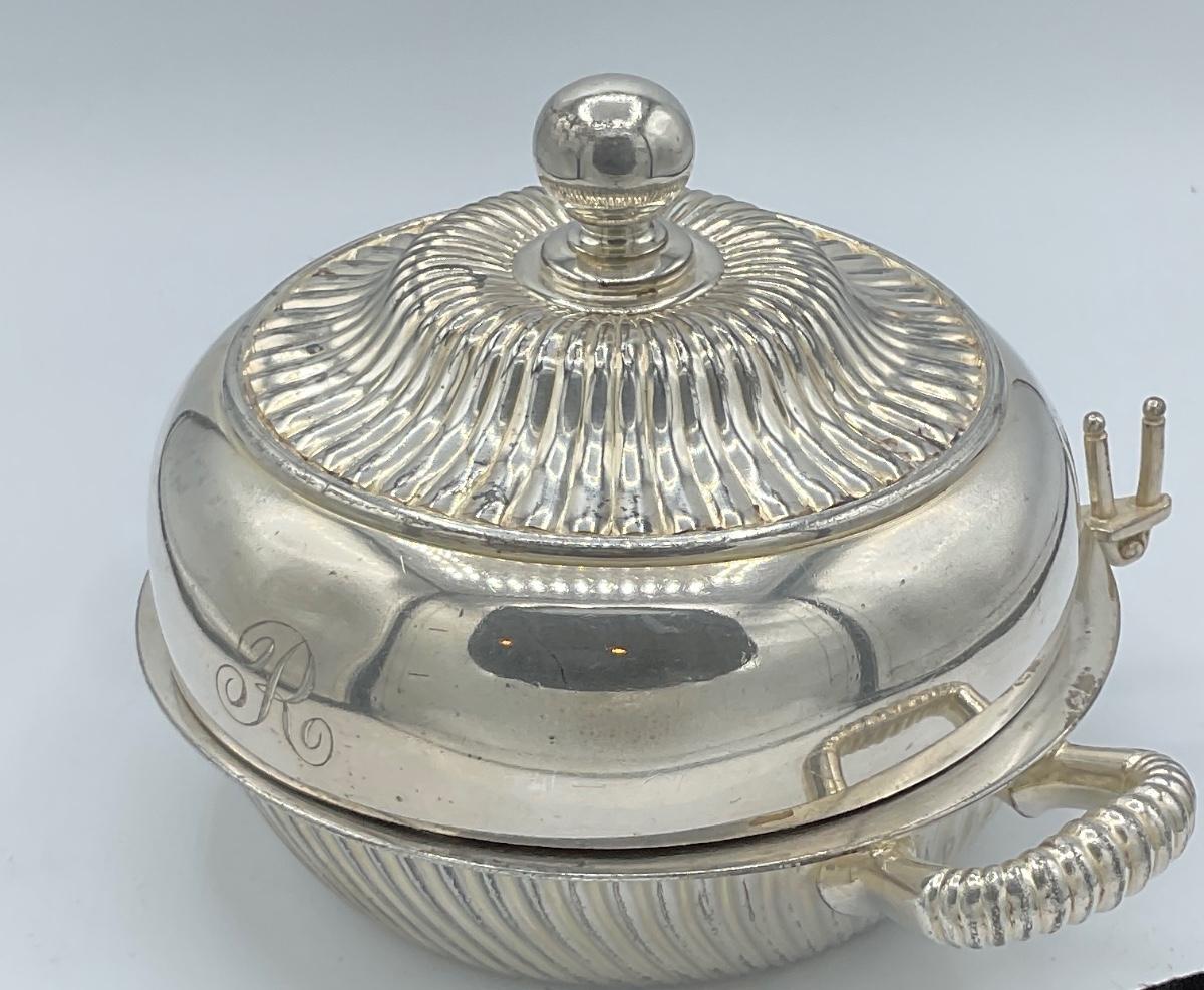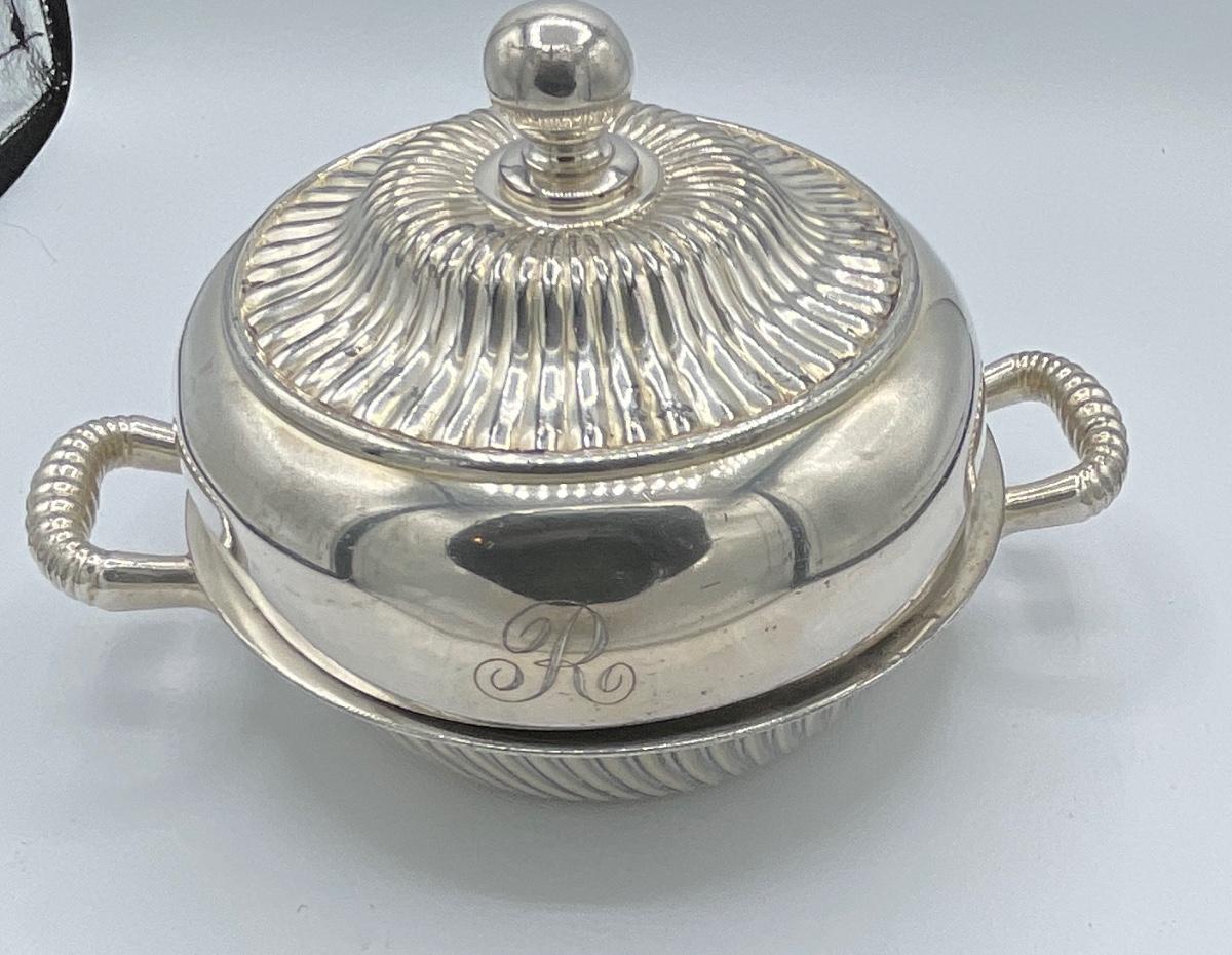 Old Victorian covered dome butter dish from the old Richardson family in Boston MA. Fluted handles and lid, engraved decoration interior bottom, original glass top intact ! R monogram. Butter knife slot. Wear and tarnish as pictured.