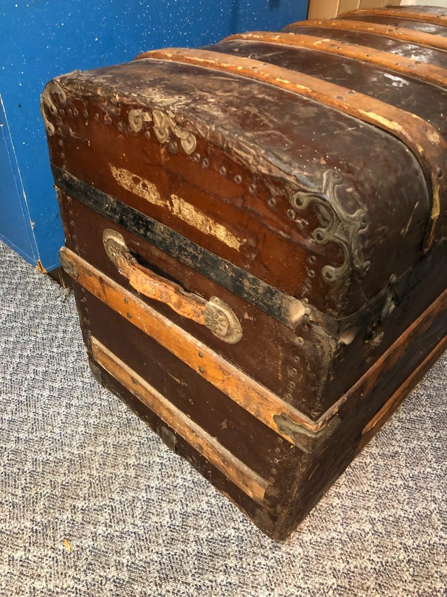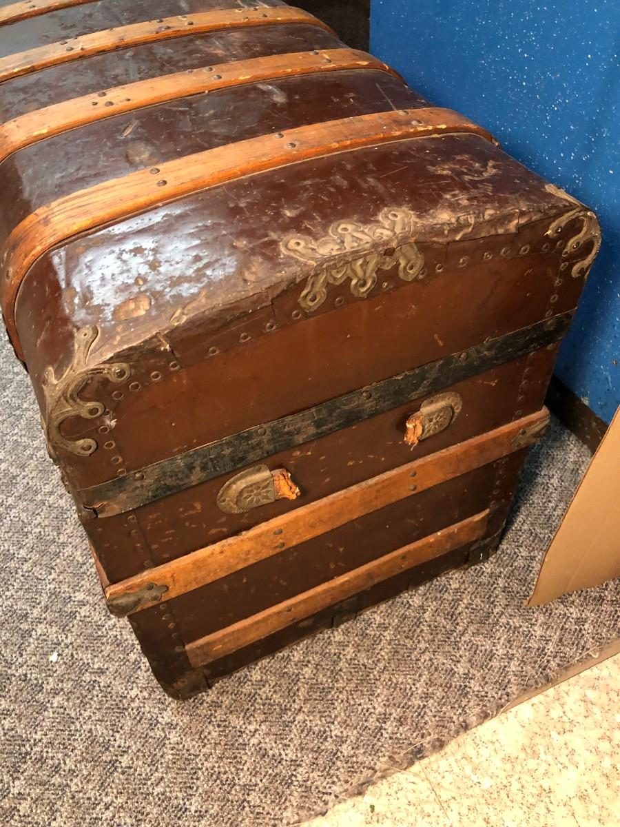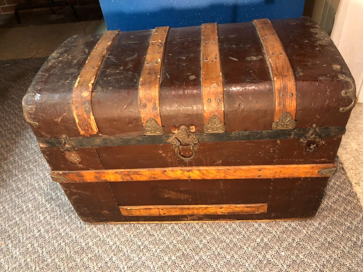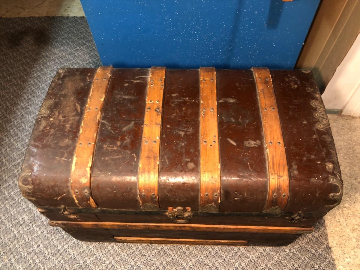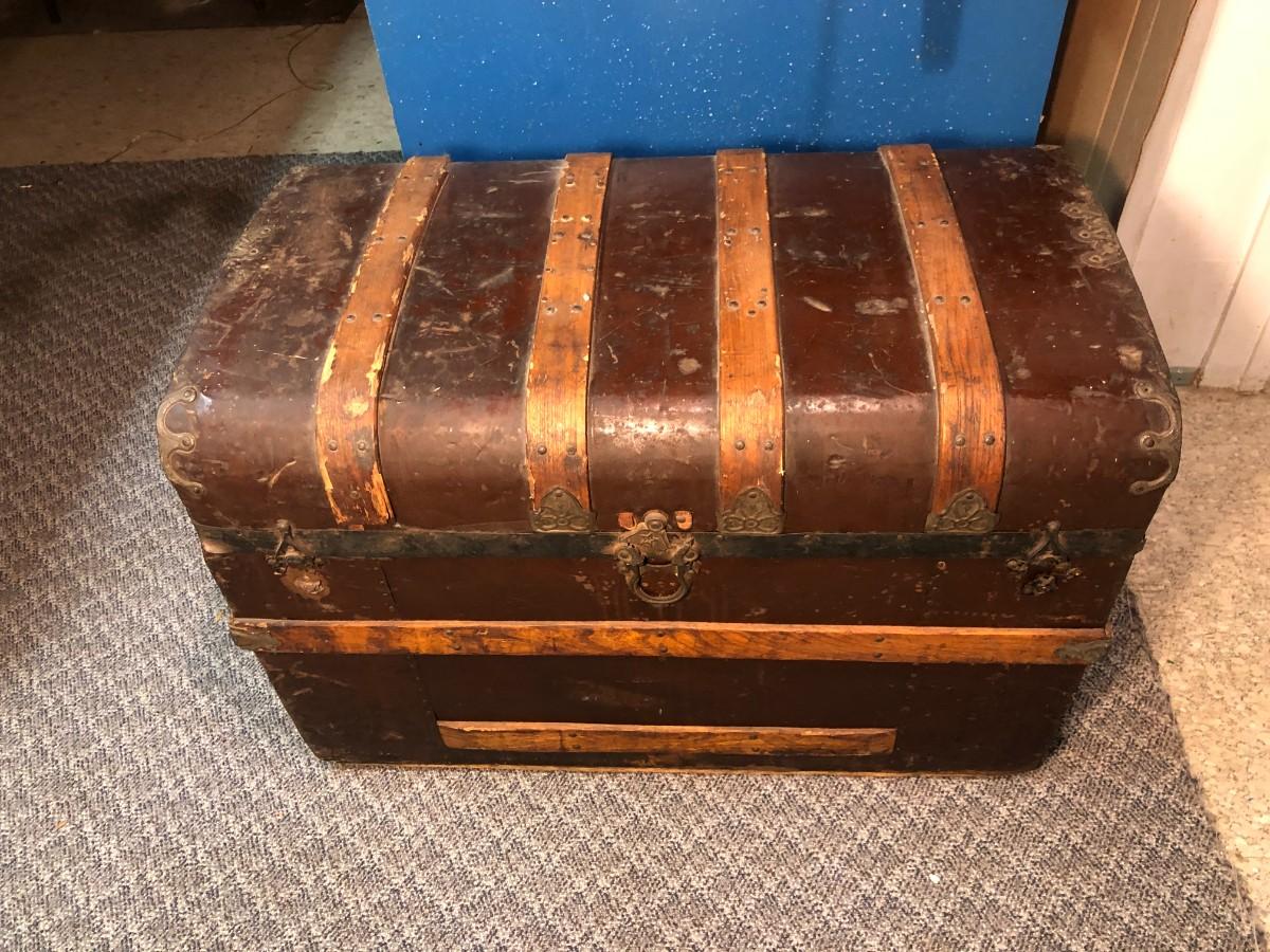 Cool antique wood and metal steamer trunk, made from wood and metal, brown and blonde stain colors. In fair condition, with clear signs of use and age (shown in photos).