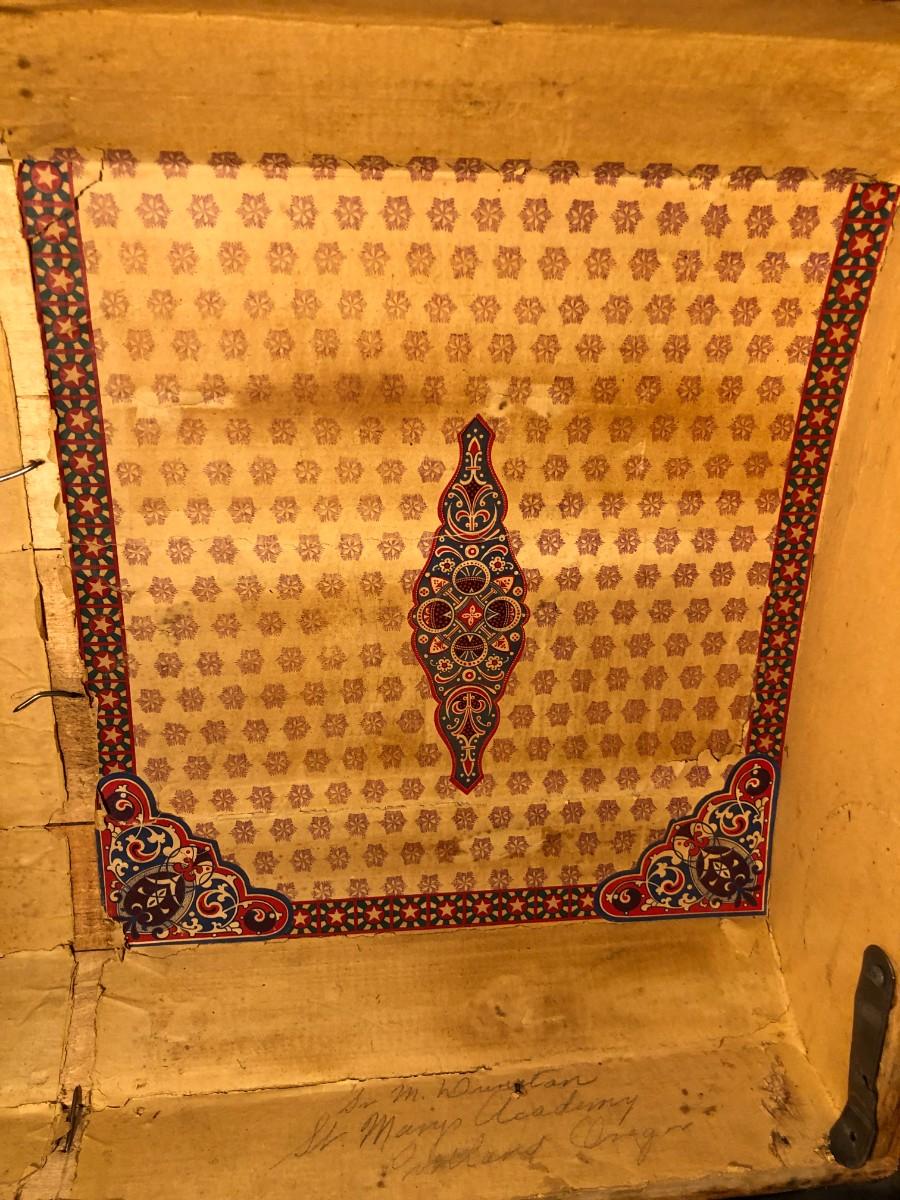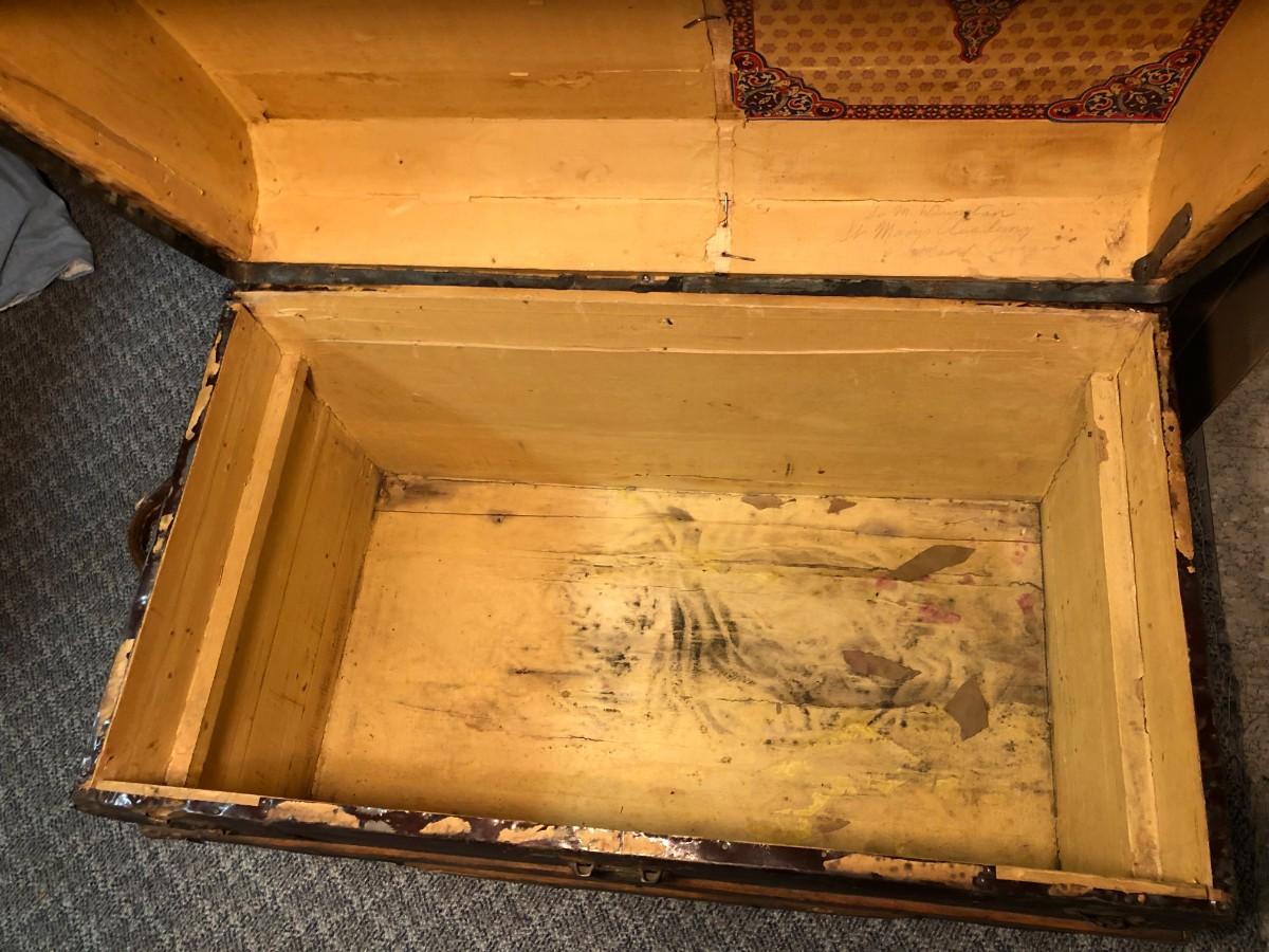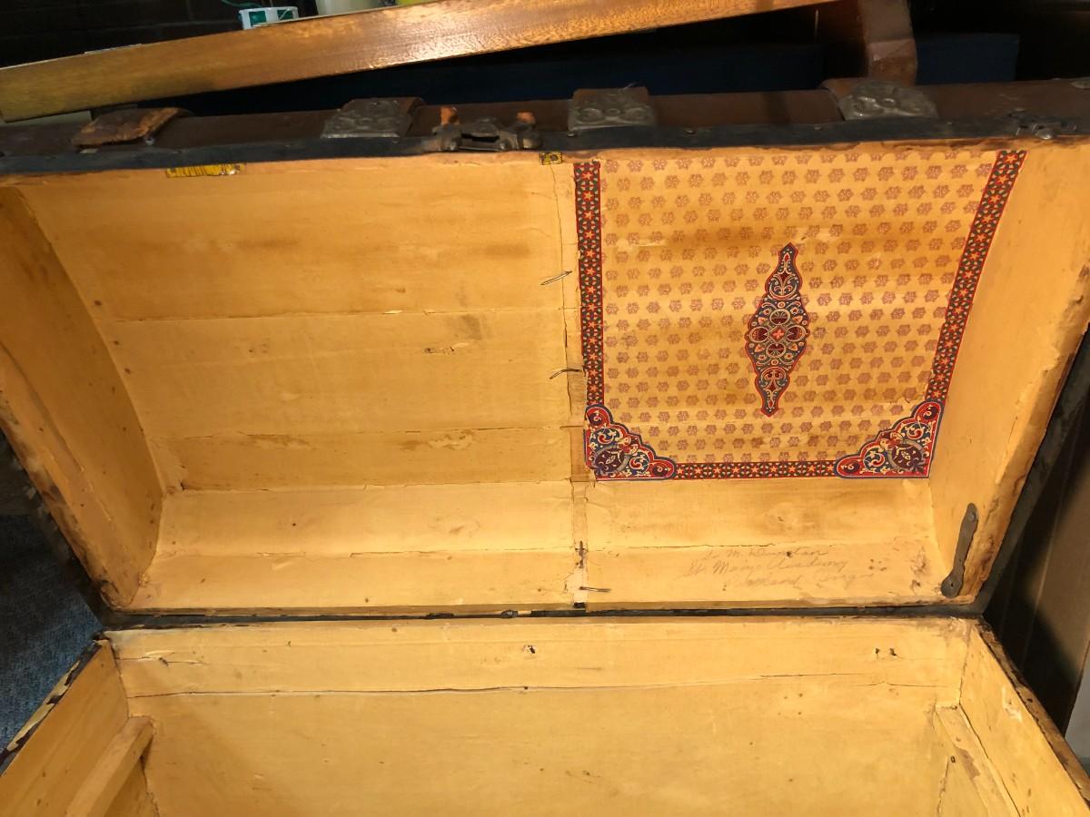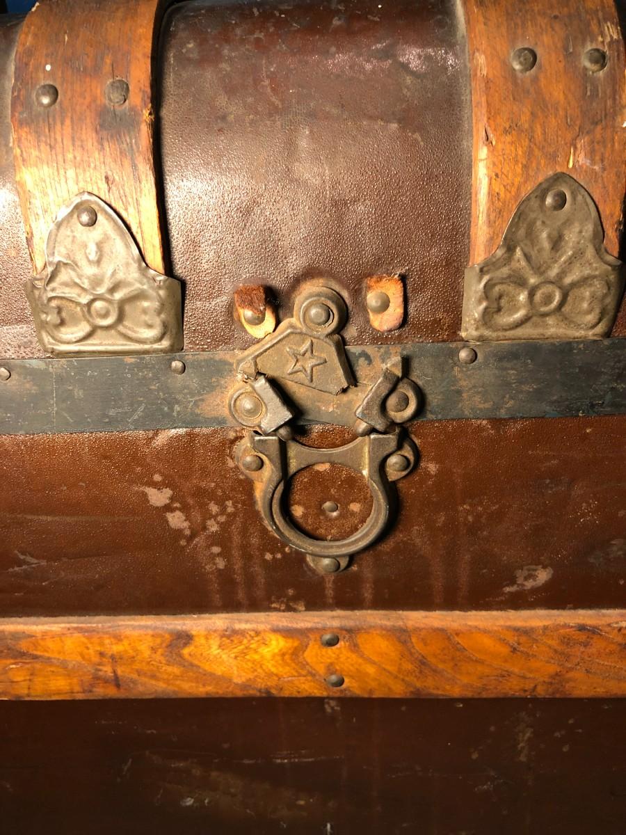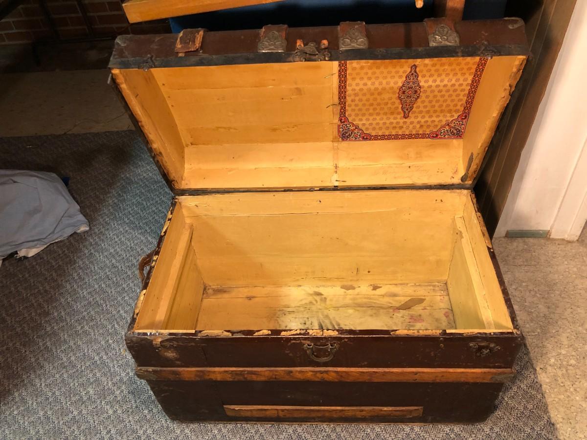Cool antique wood and metal steamer trunk, made from wood and metal, brown and blonde stain colors. In fair condition, with clear signs of use and age (shown in photos).