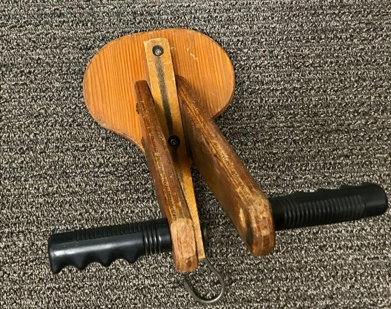 Antique wood bike seat attachment, we think. Looks like it should sit and attach to a bike to add an additional seat. Interesting.