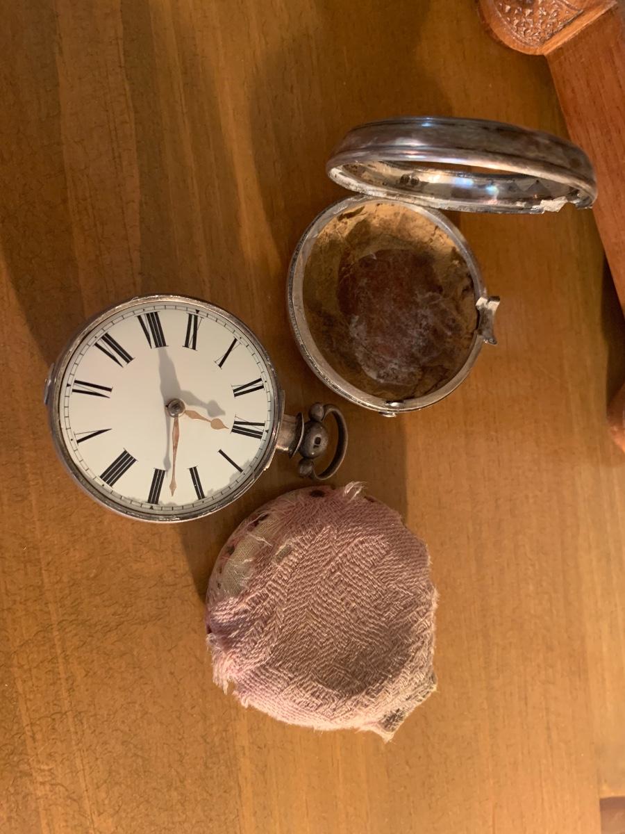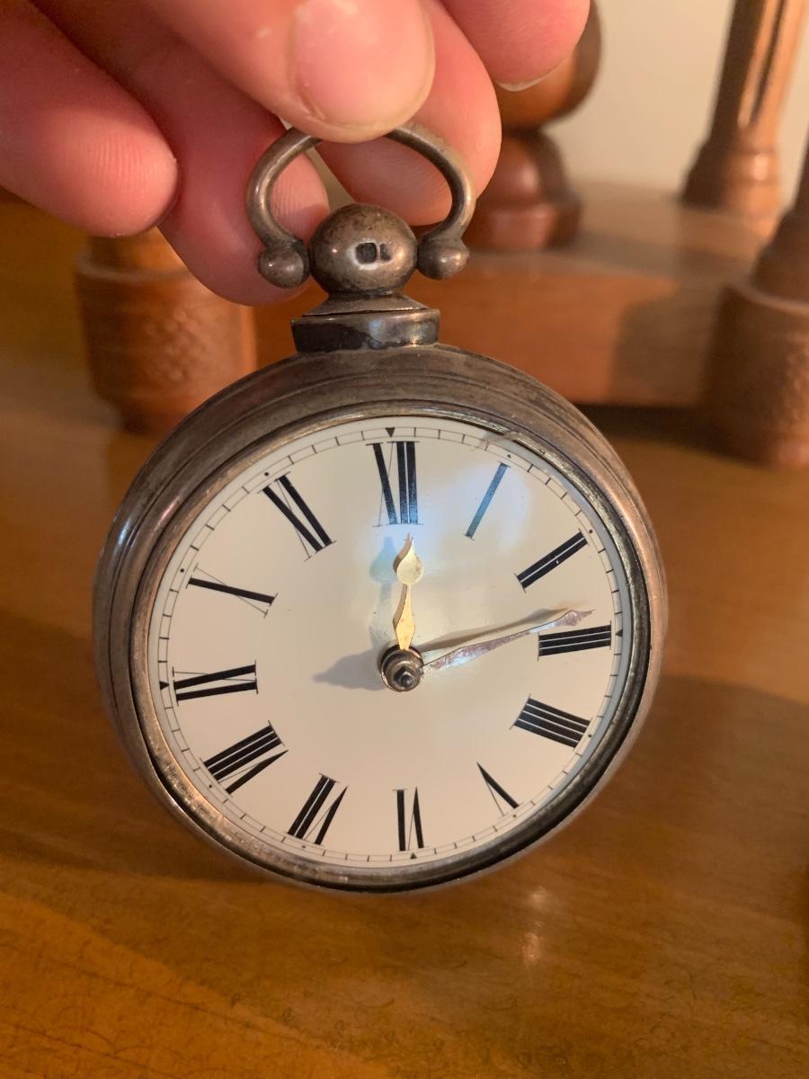 Good condition items. Clock face is an antique pocket watch. Appears to be sterling.
