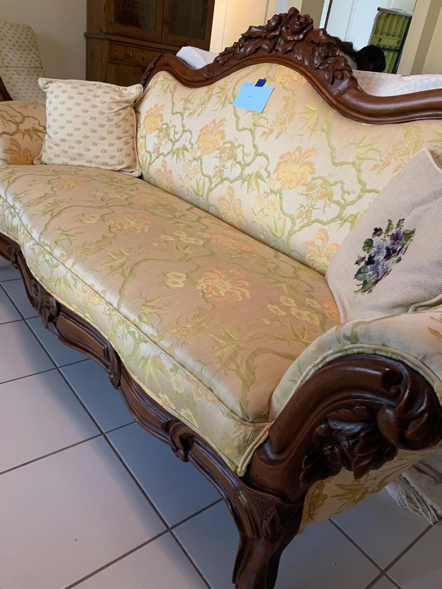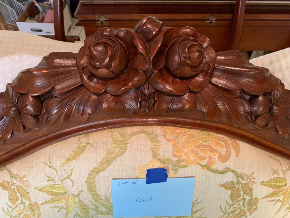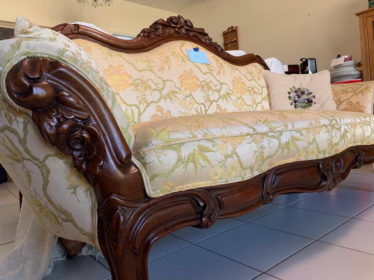 Antique Wood Carved Sofa on Castors with 2 pillows. Sofa is approx 78”