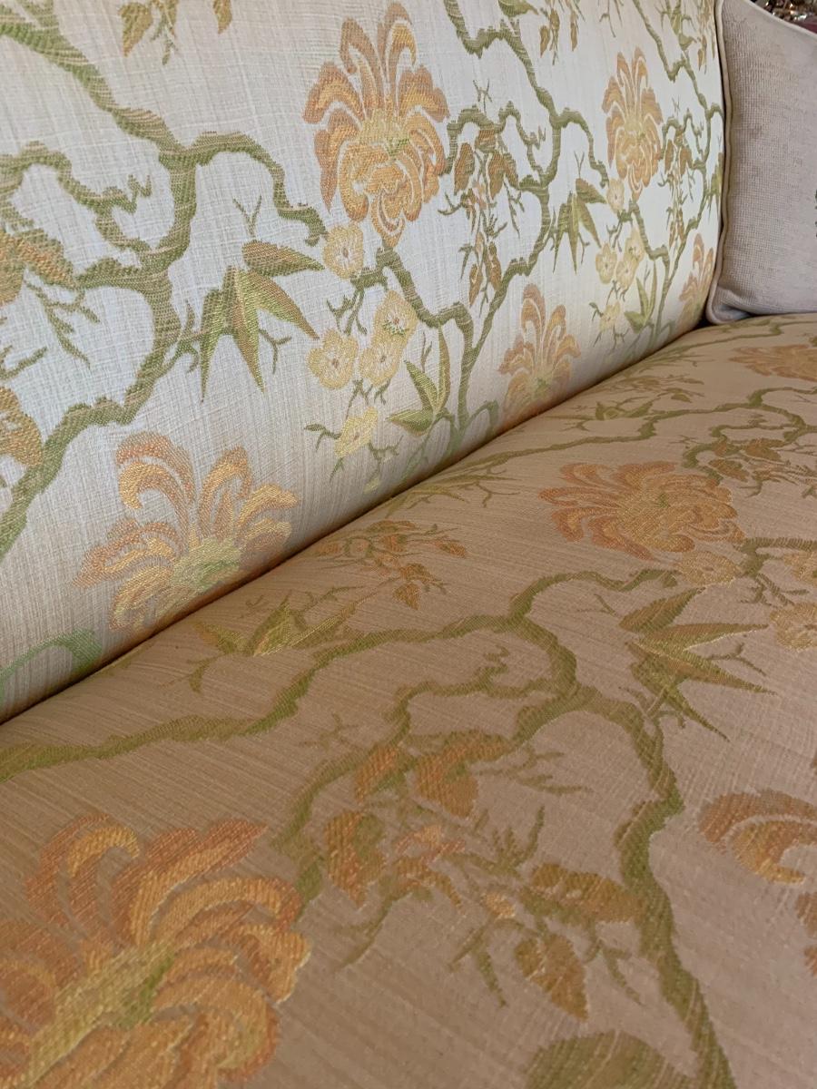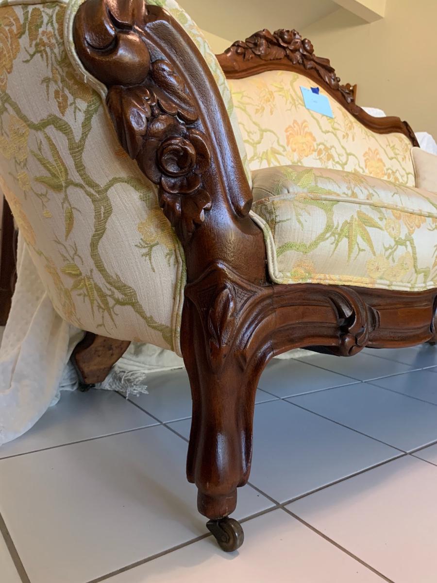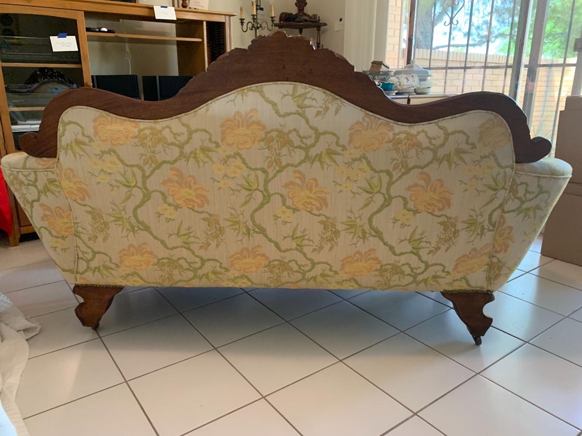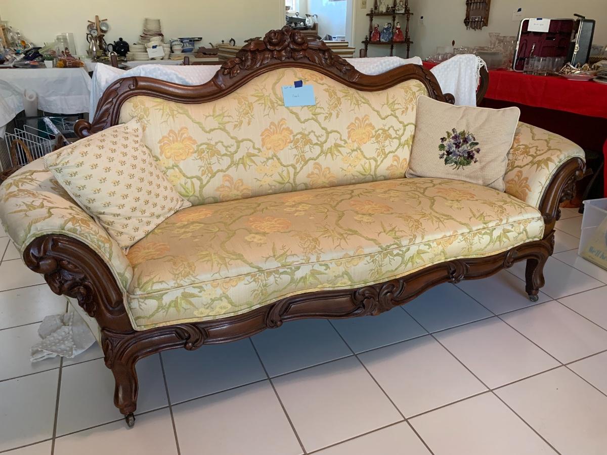 Antique Wood Carved Sofa on Castors with 2 pillows. Sofa is approx 78”
