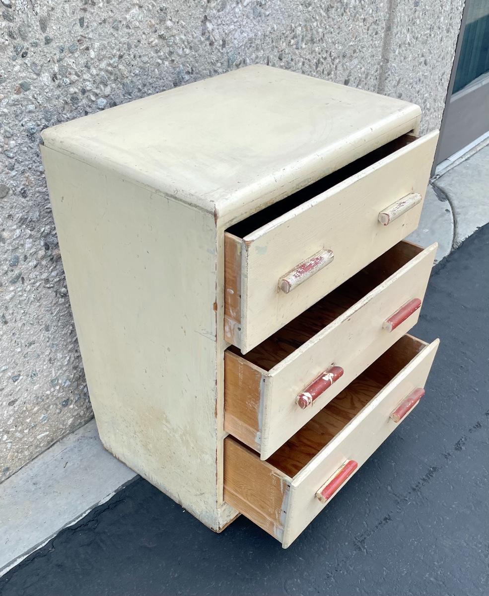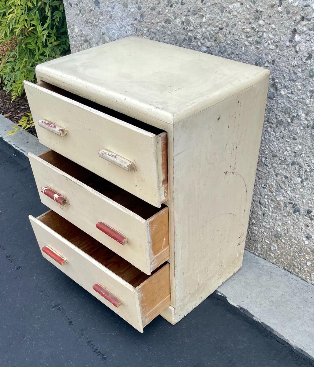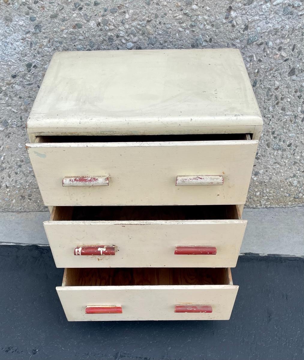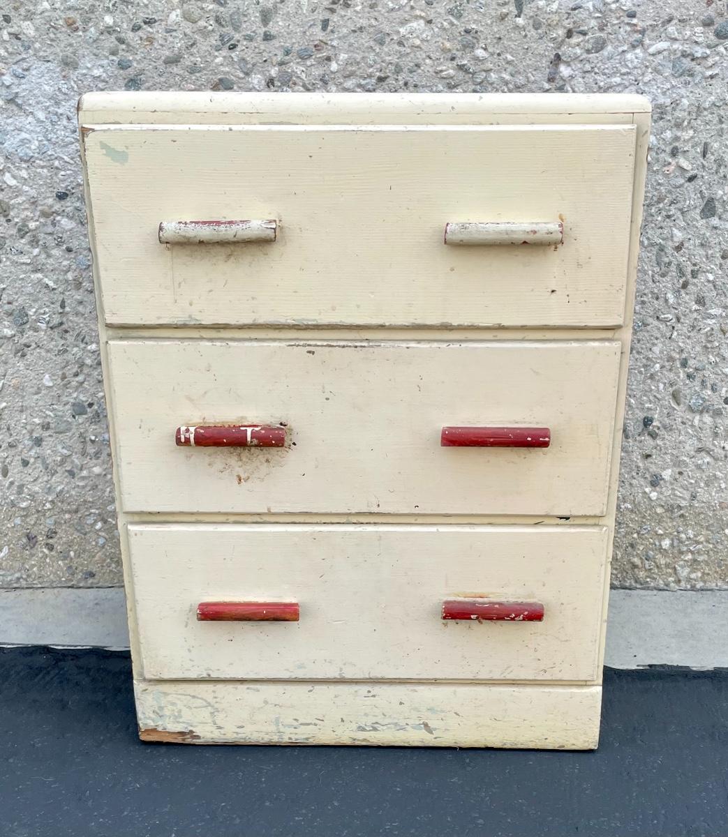 Wood dresser with 3 drawers. Has been painted but is an excellent candidate for restoration or repainting. One handle on lowest drawer is loose and needs to be repaired. Approx 29” tall, 22” wide and 16” deep.