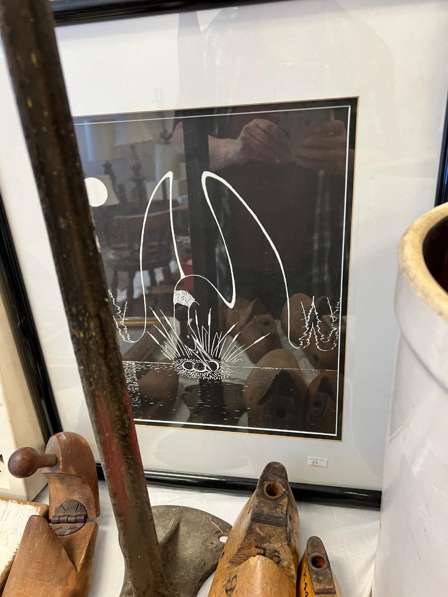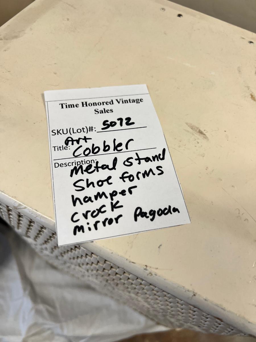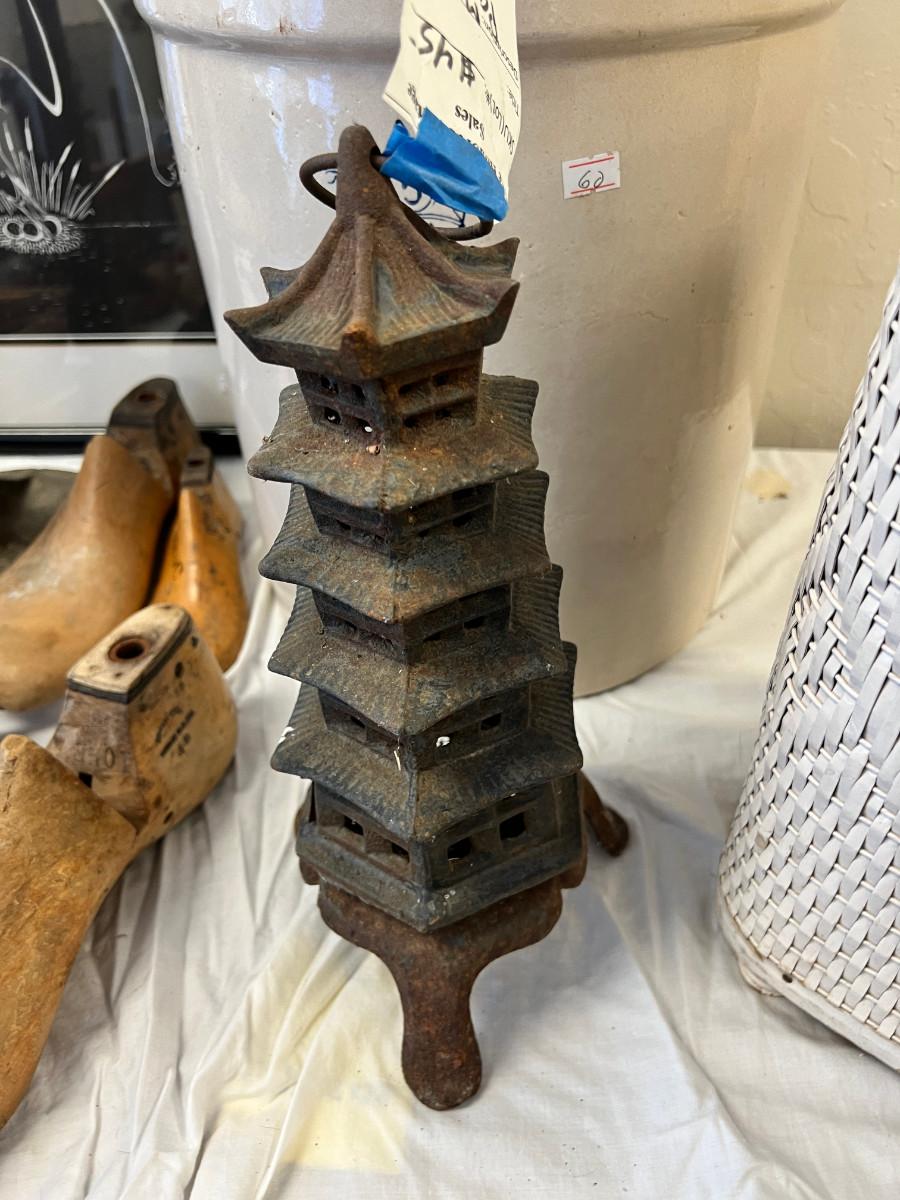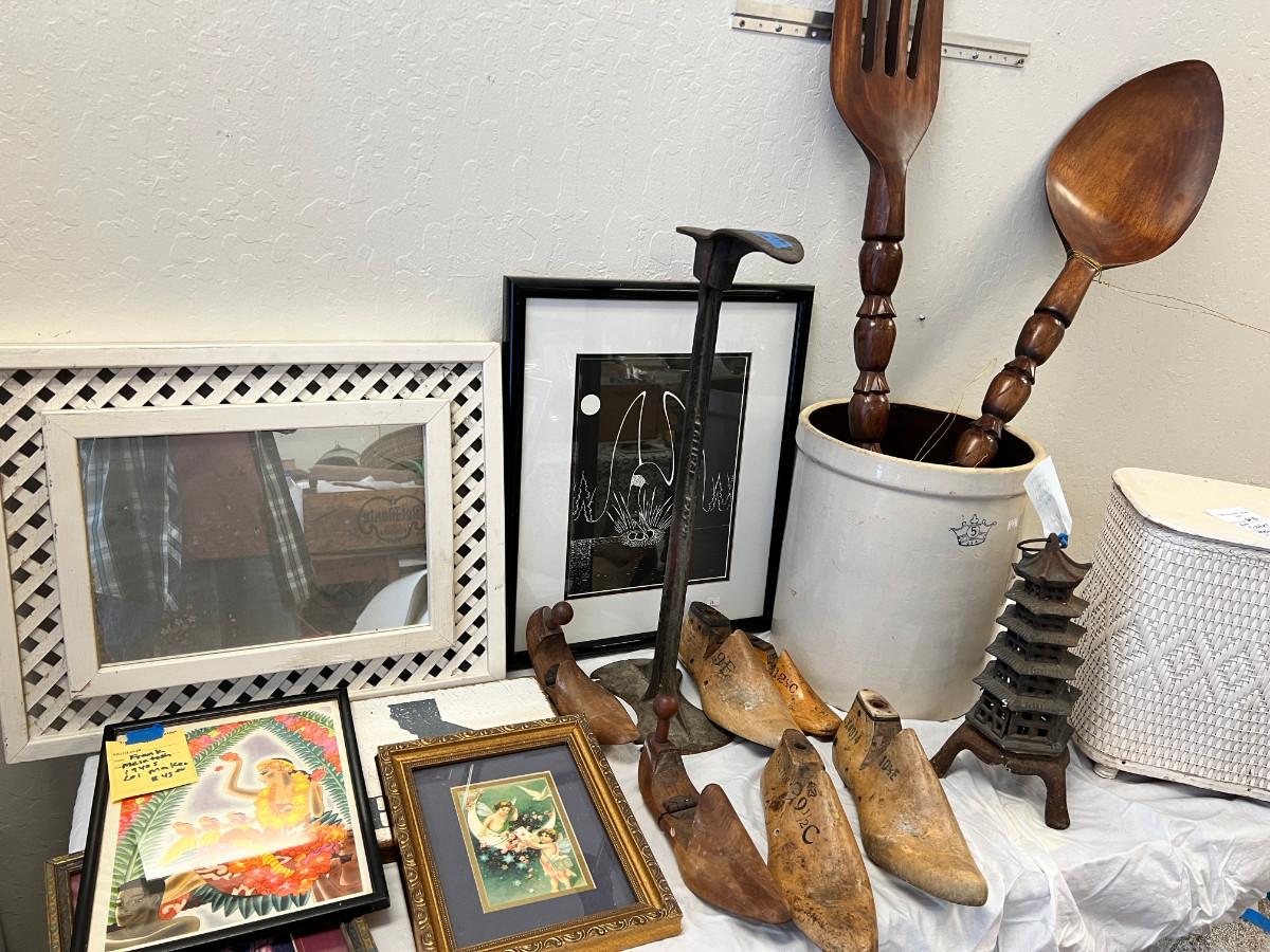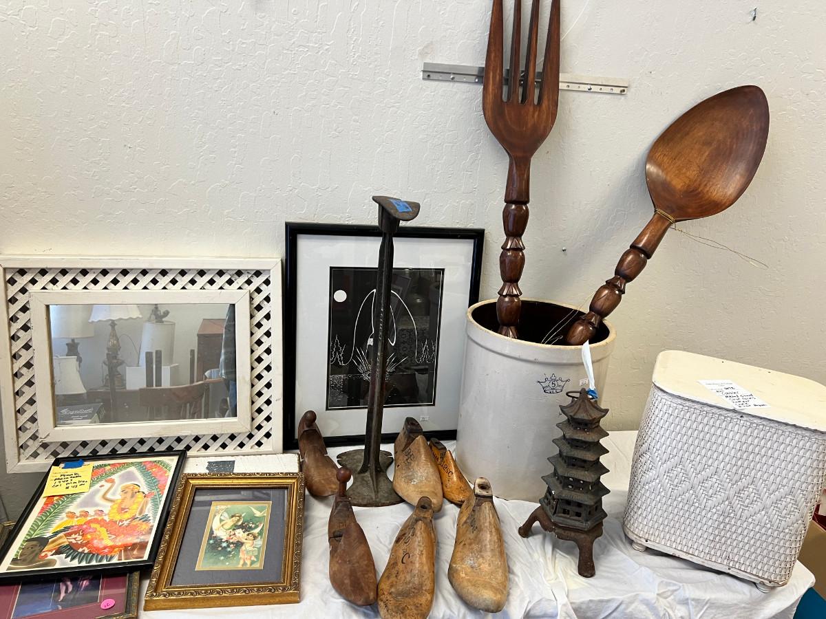 Extra large Teak MCM Decor Spoon and Fork Metal garden Pagoda, White lattice garden mirror, MCM small hamper, 5 Gallon Pottery Crock, Loon Lithograph framed, Hawaiian Air France framed menu.