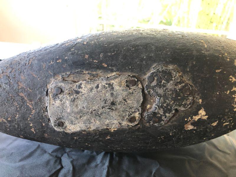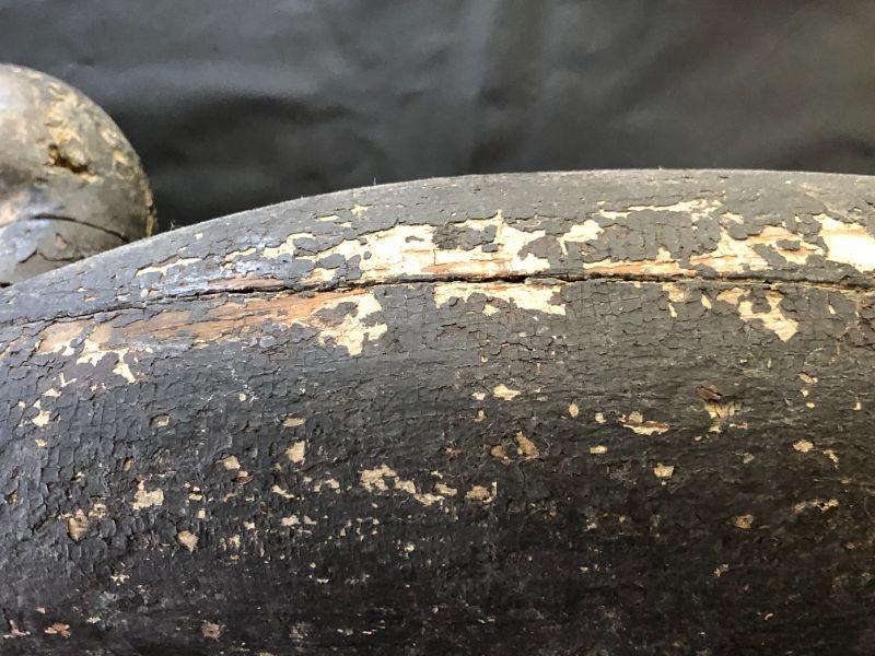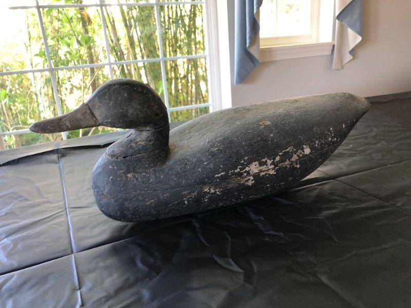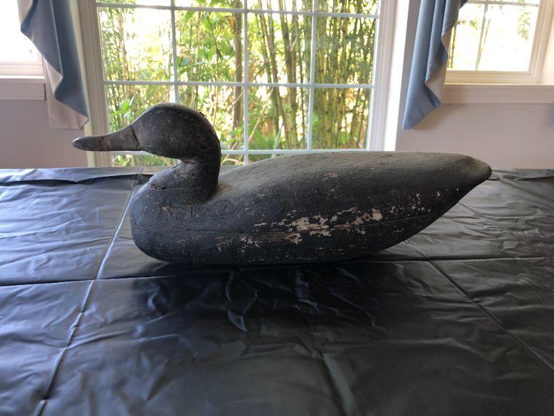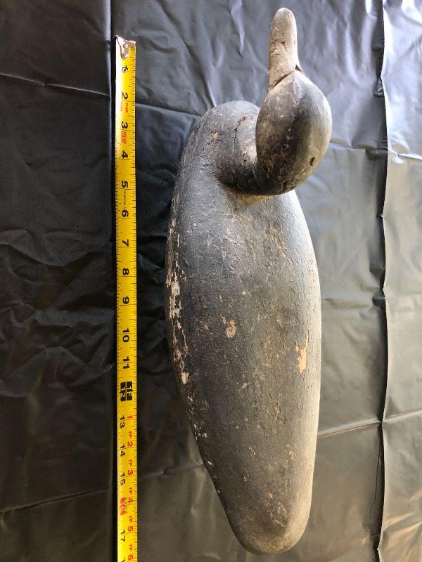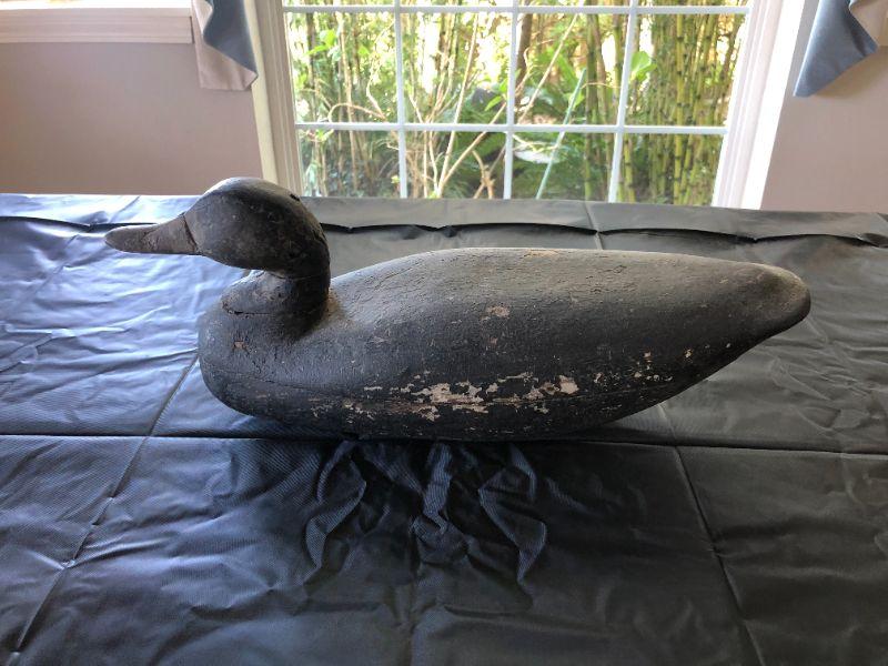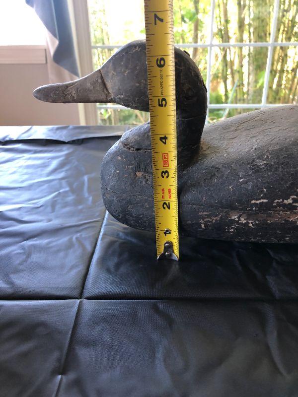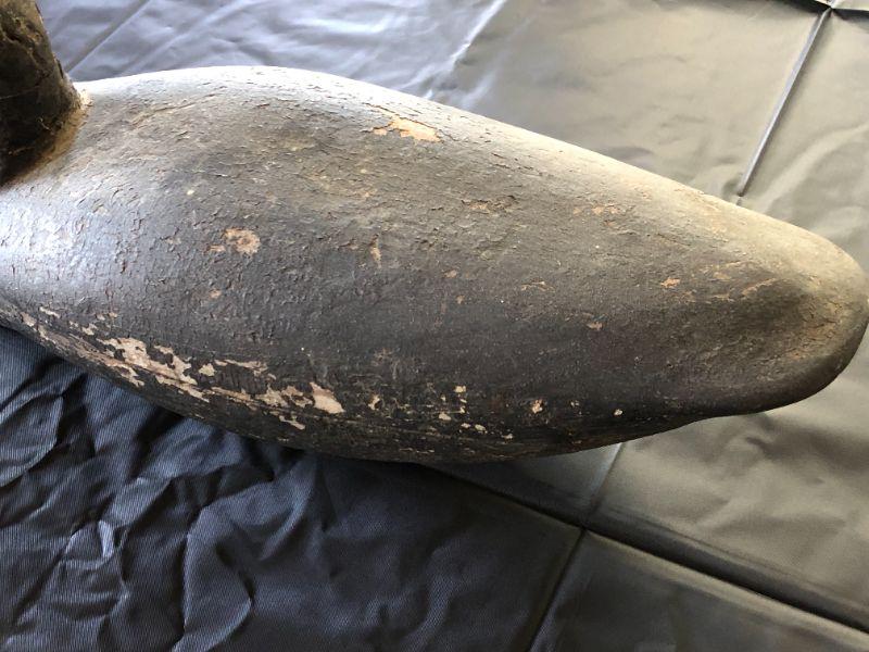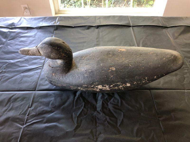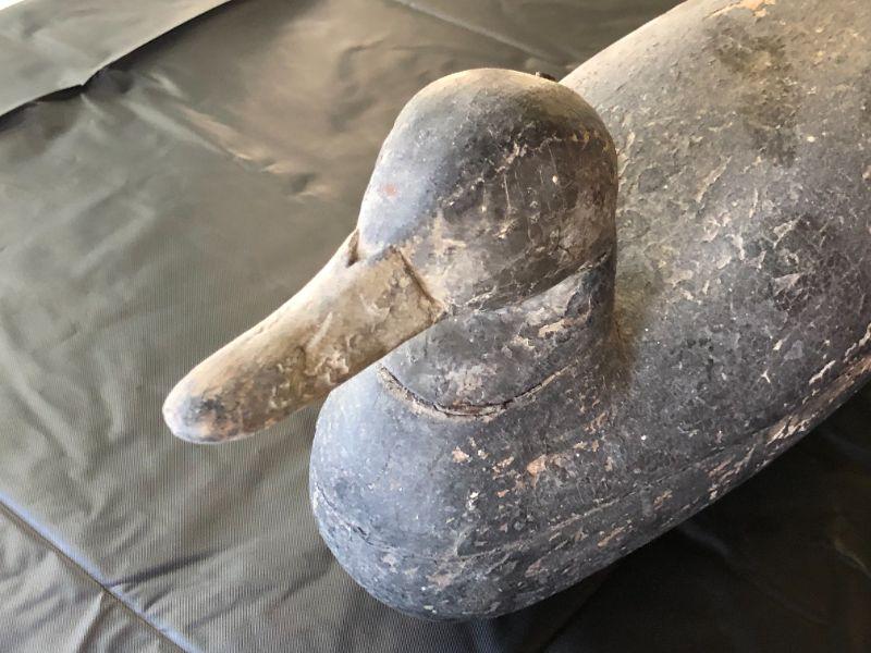 Antique wood decoy duck with black body and yellow beak/bill. In fair condition, with signs of wear from age (shown in photos).