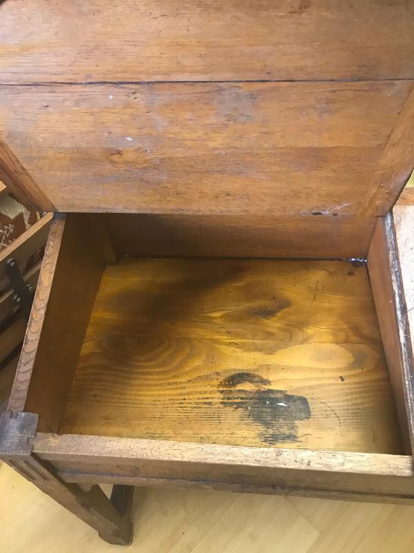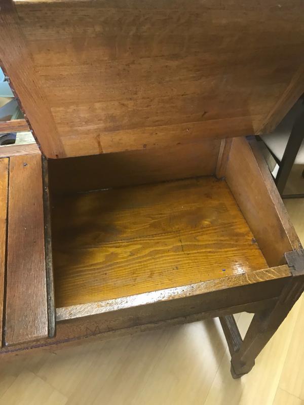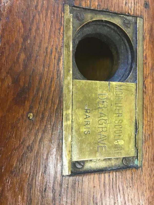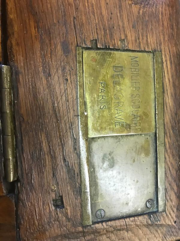 Antique wooden double student desk Brass Ink Well Plates Read “Mobilier Scolaire Delagrave Paris”.