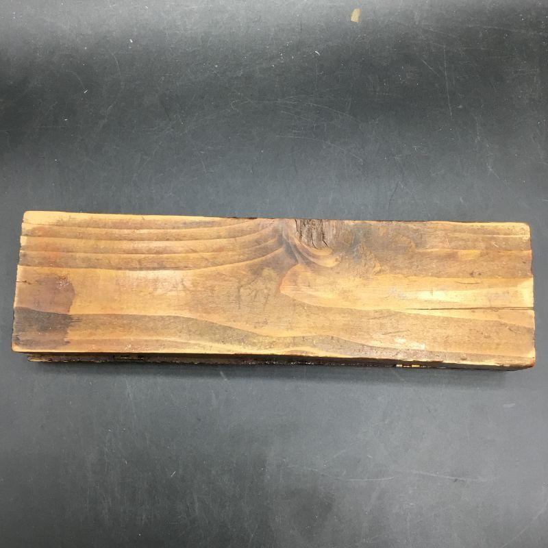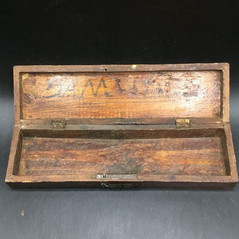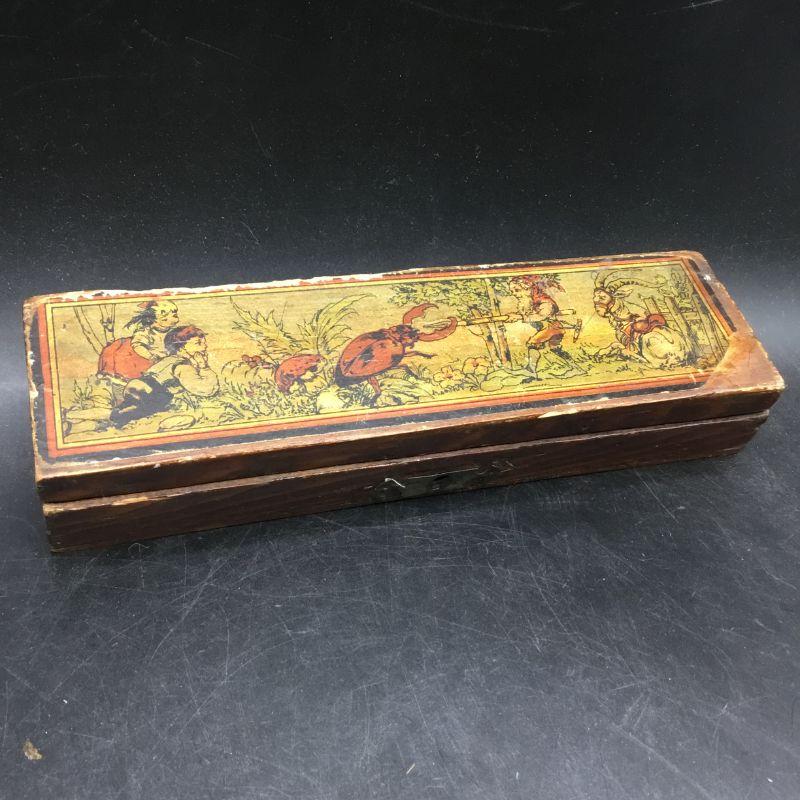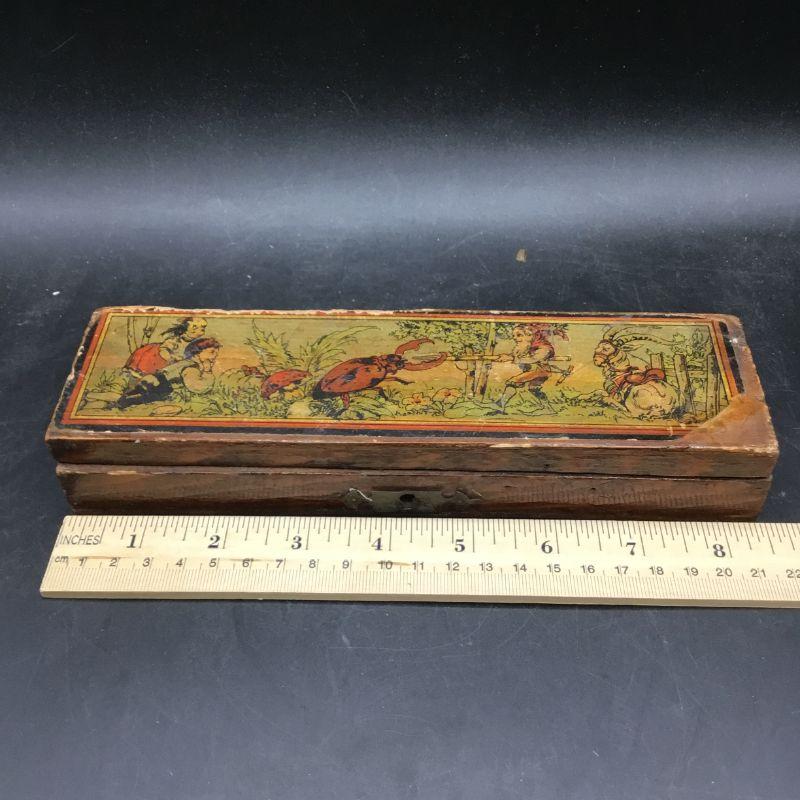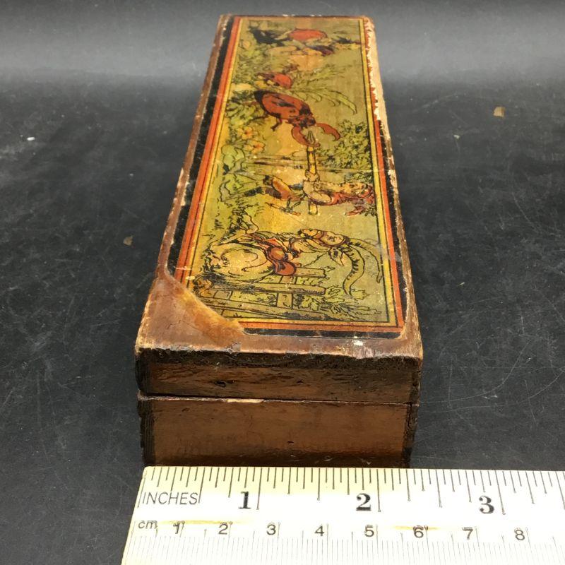 Wood antique pencil/pen box. Has a fairytale like image on the lid. Has signs of age and wear. I believe it is a quill pen box. Has a lock, no key. Measures about 8.5"x2.25". Hinged lid.