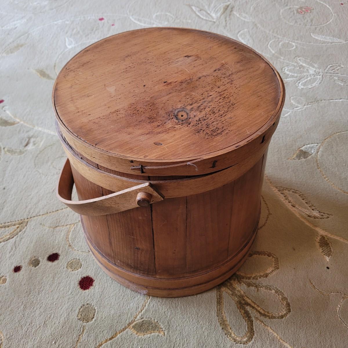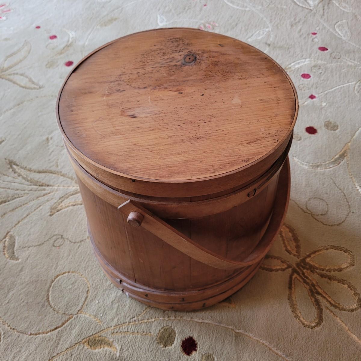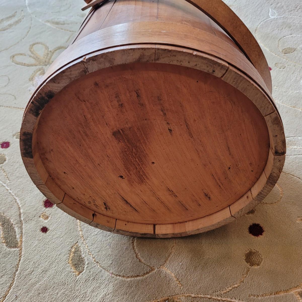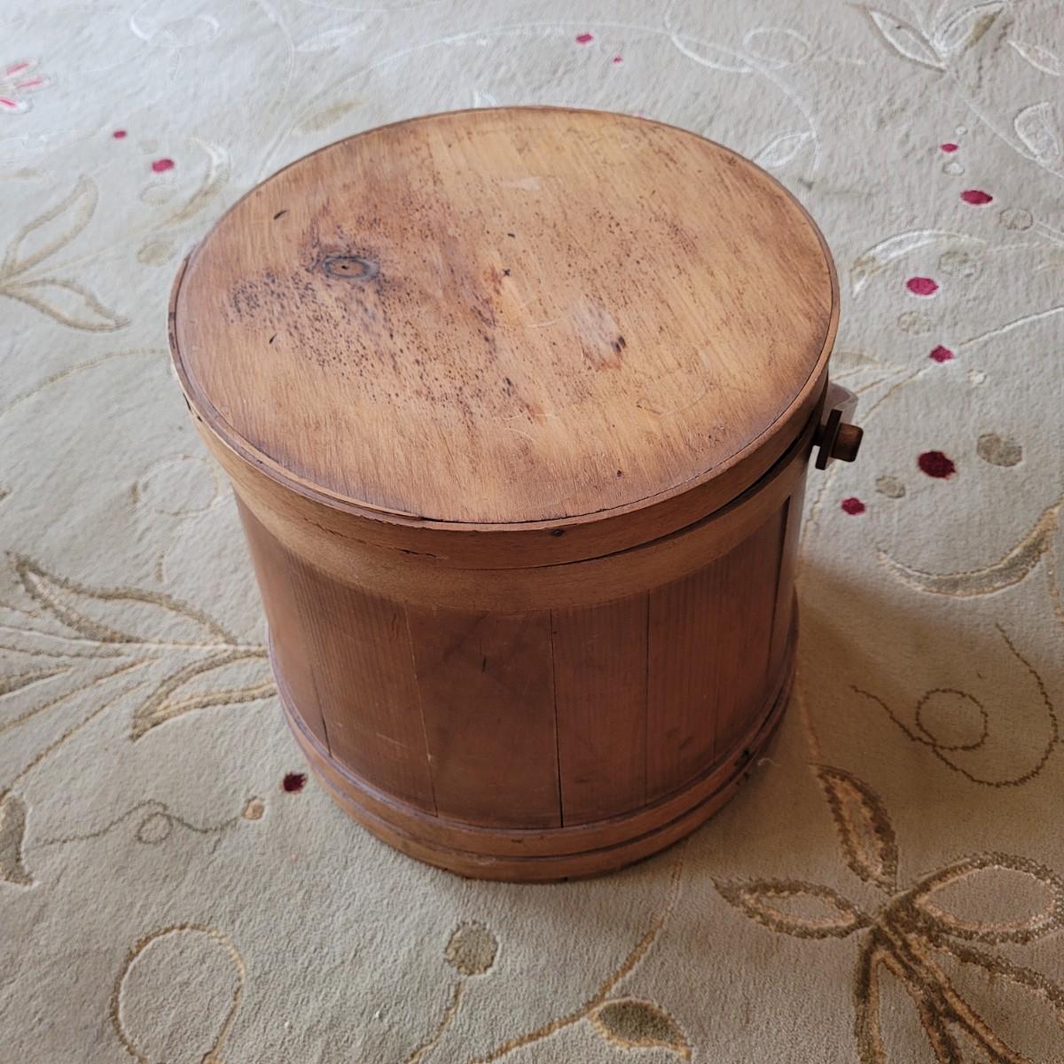 Wooden firkin or sugar bucket in wonderful condition for its age. This item is complete with lid and measures 12" x 12" x 13"H.