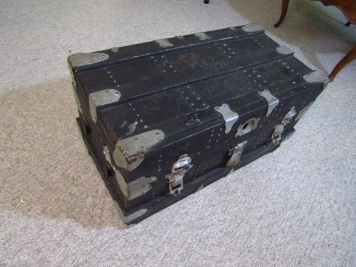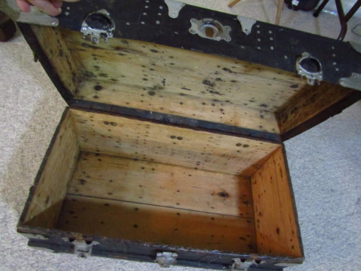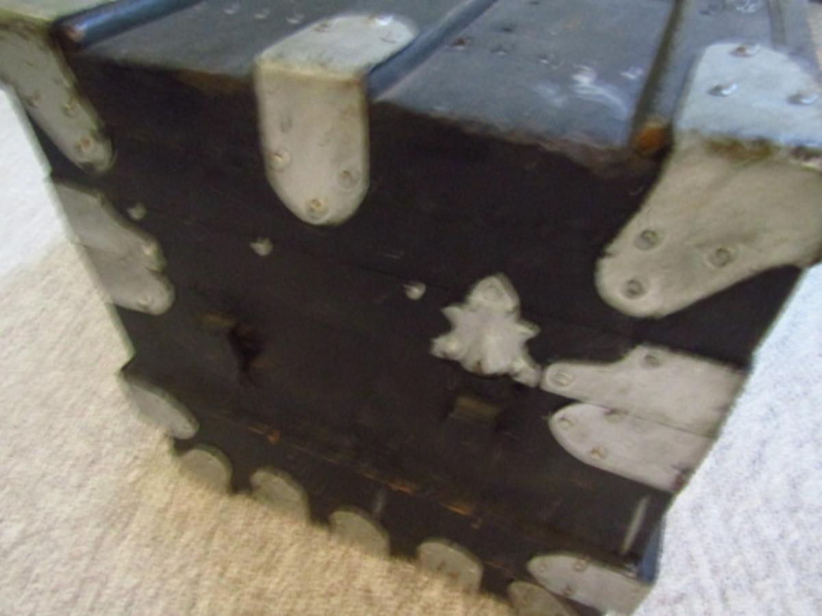 Antique Wood Lined Metal Trunk. Handles are missing.