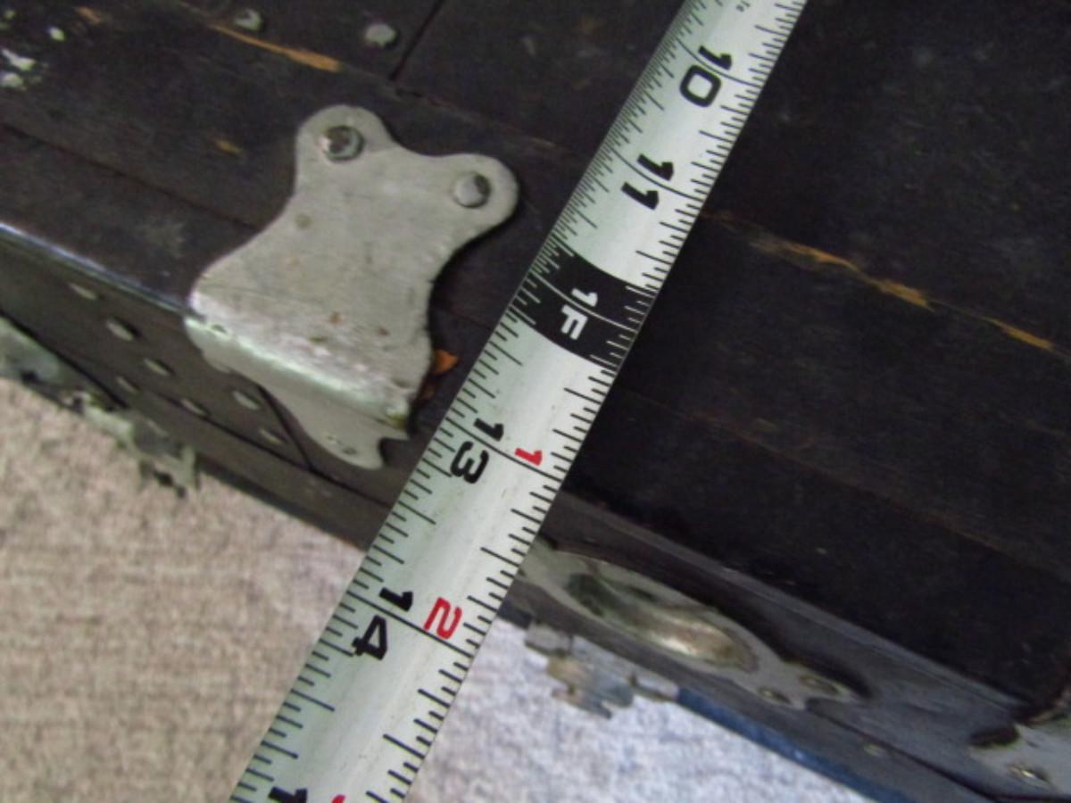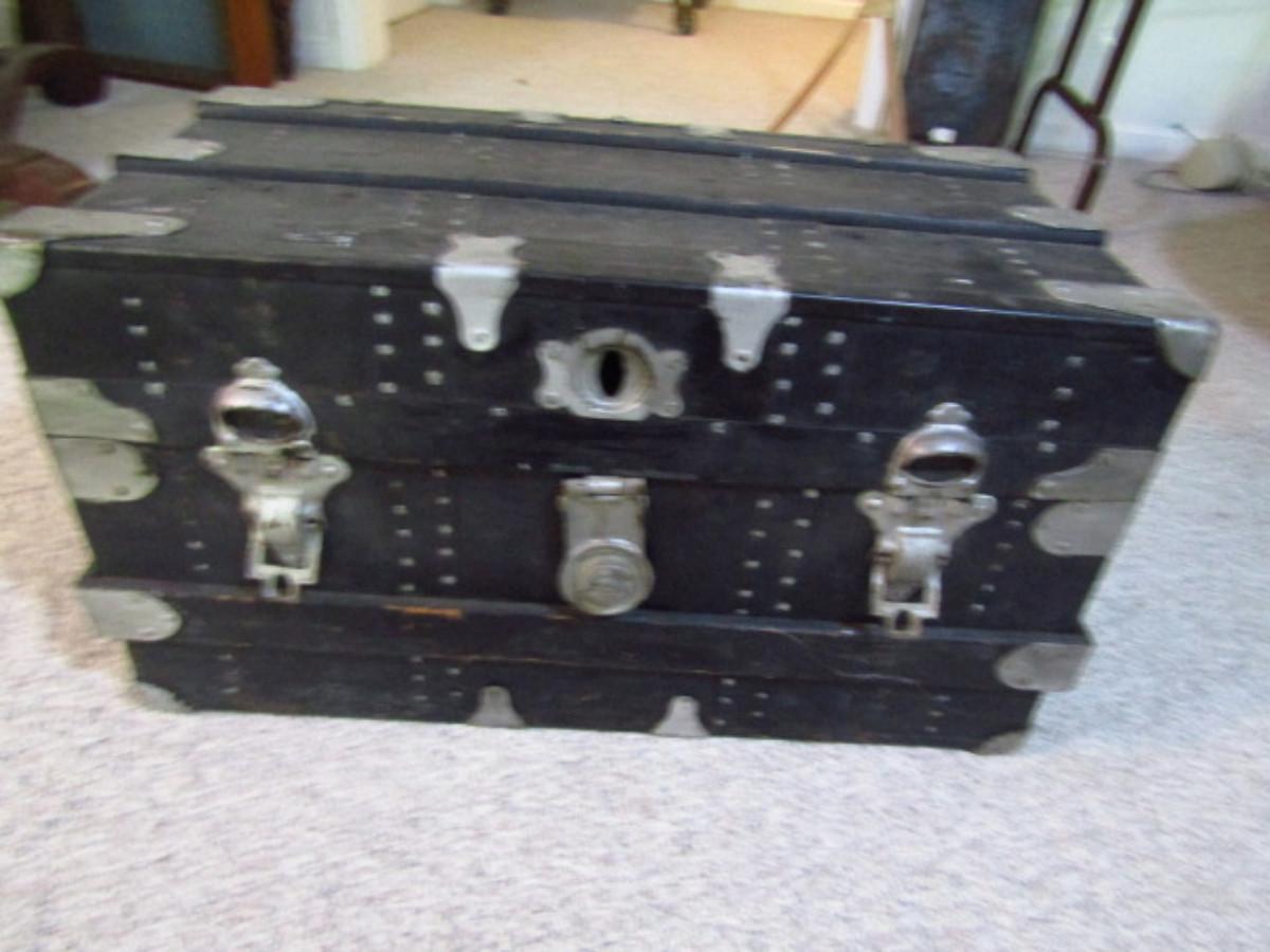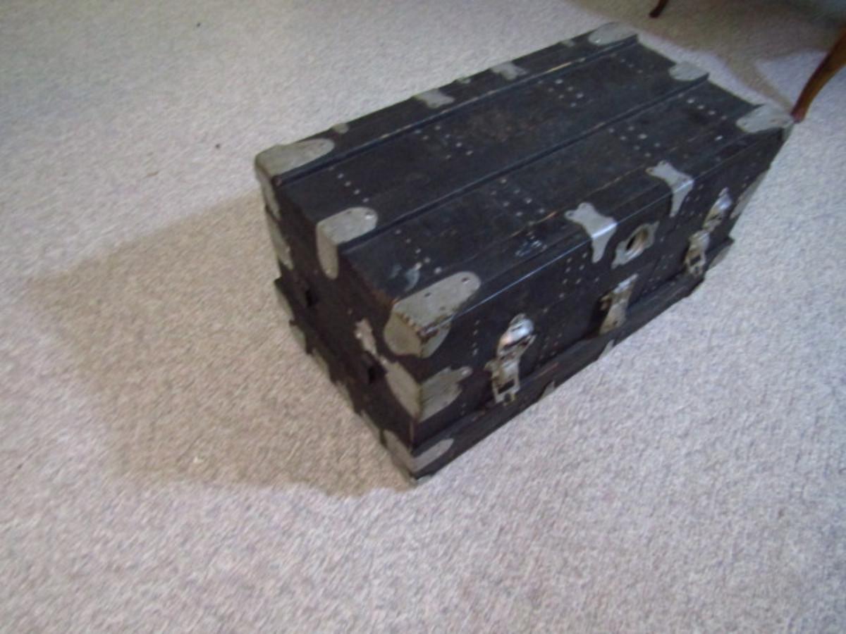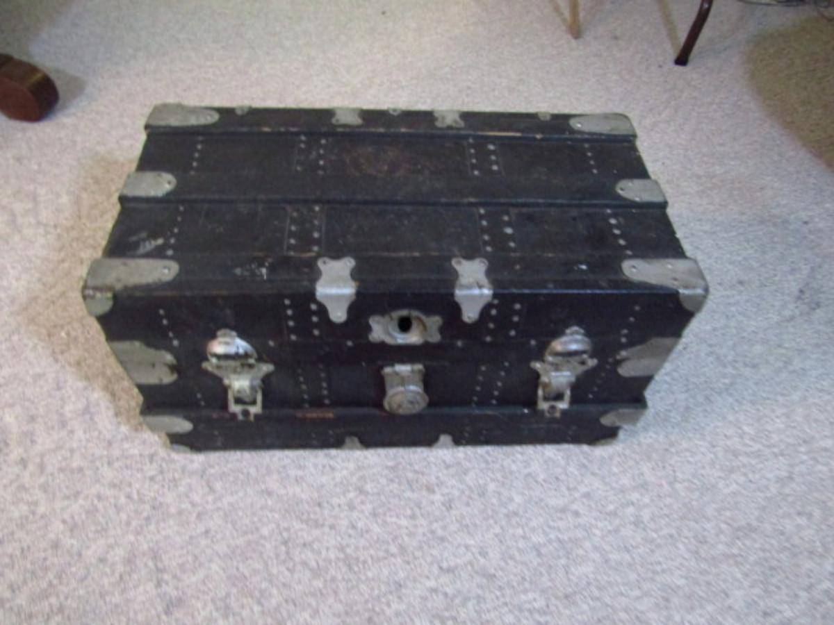 Antique Wood Lined Metal Trunk. Handles are missing.