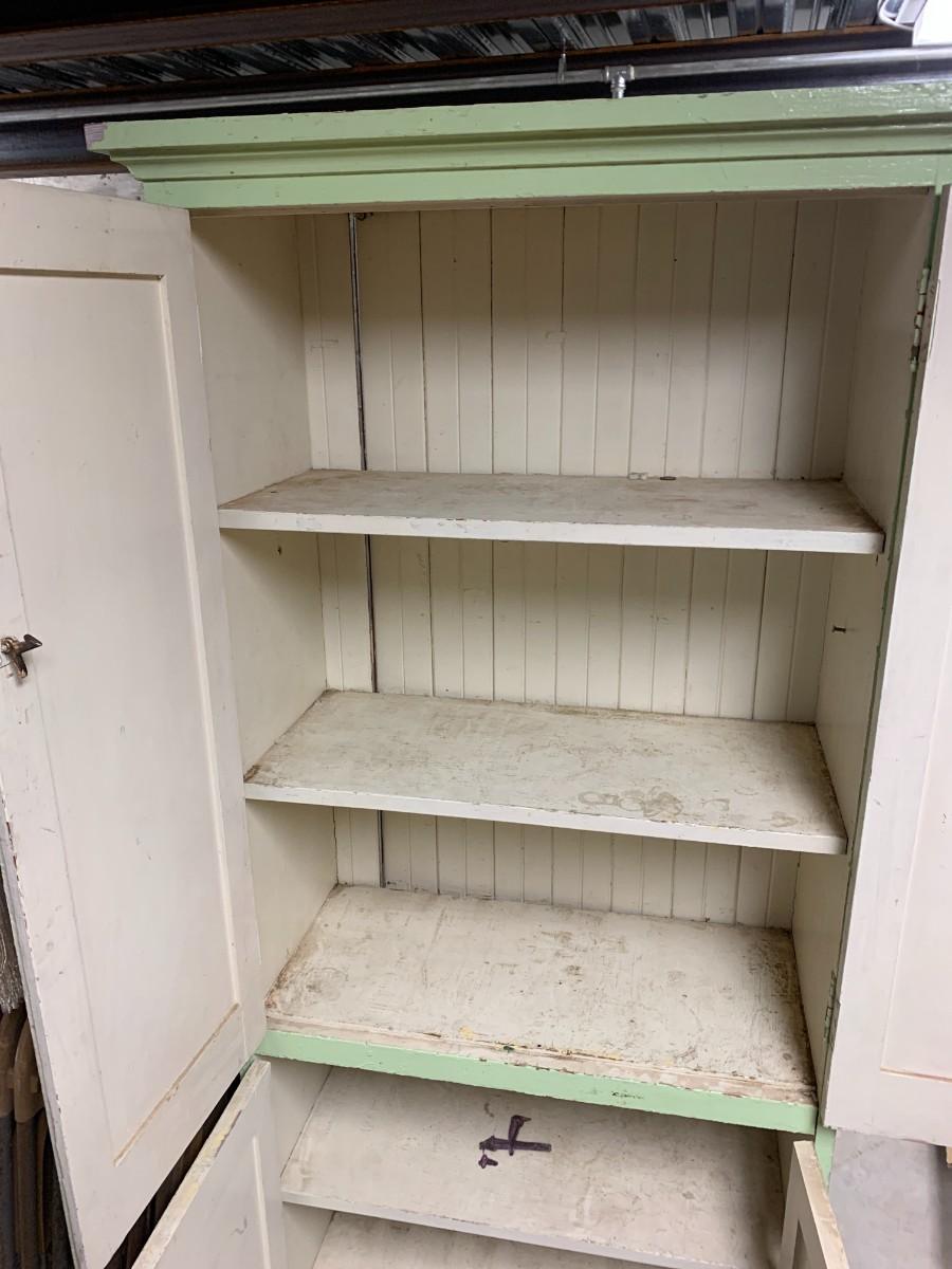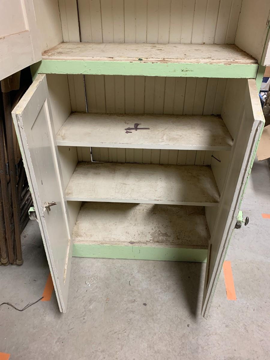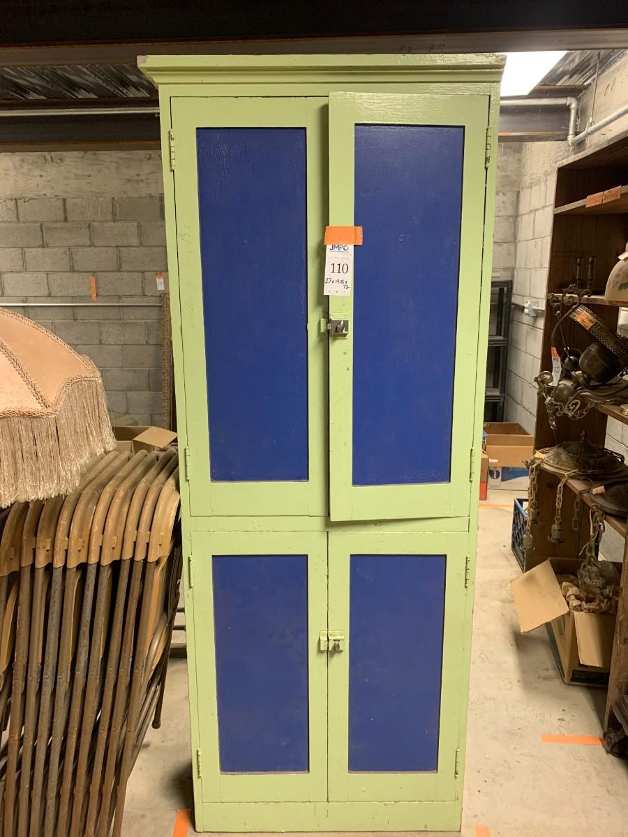 Tall, latching doors, beadboard backing. Painted green and blue.