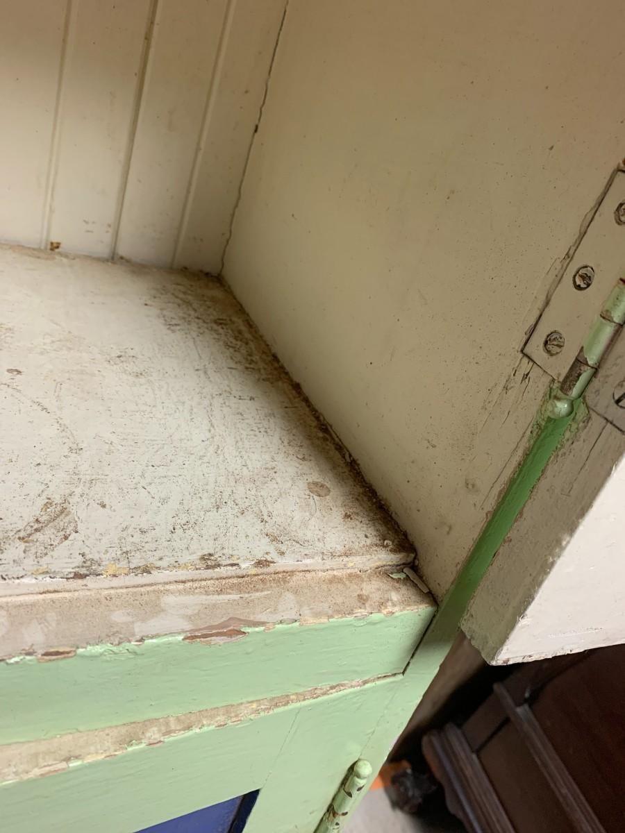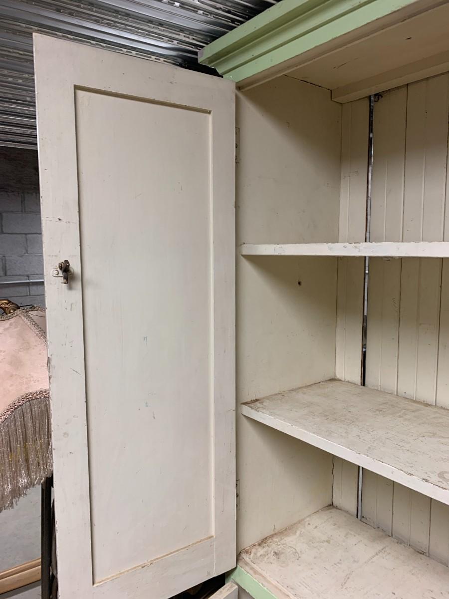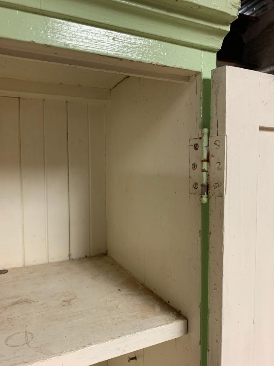 Tall, latching doors, beadboard backing. Painted green and blue.