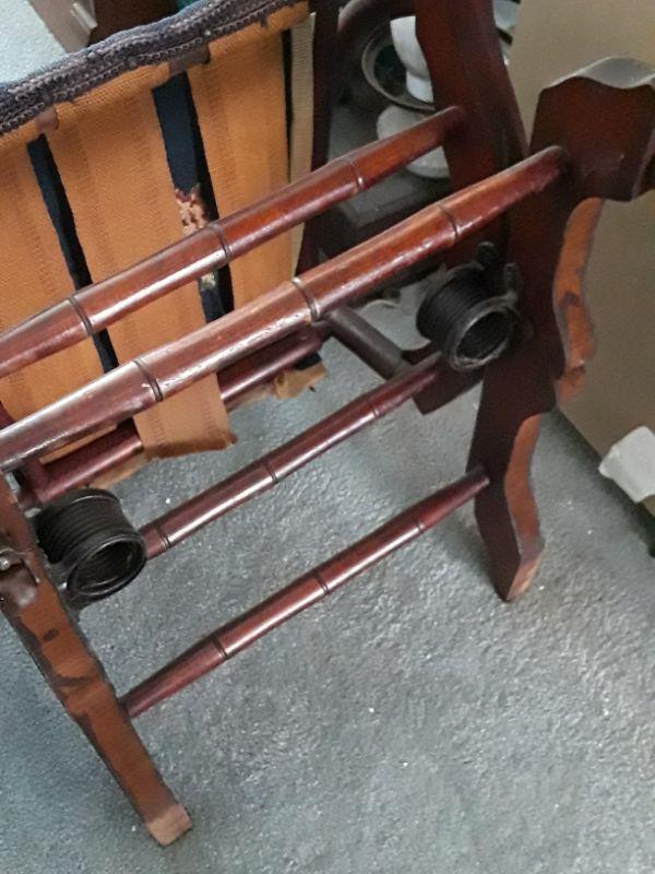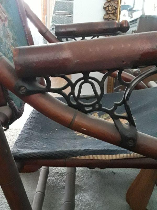 Antique Spring Seat Rocking Chair. Sturdy wood frame. Tapestry seat and back need repair/replace. Cast metal arm supports have a bell shape in the center. Two large springs under the back side of seat. Wonderful details. Great restoration piece.