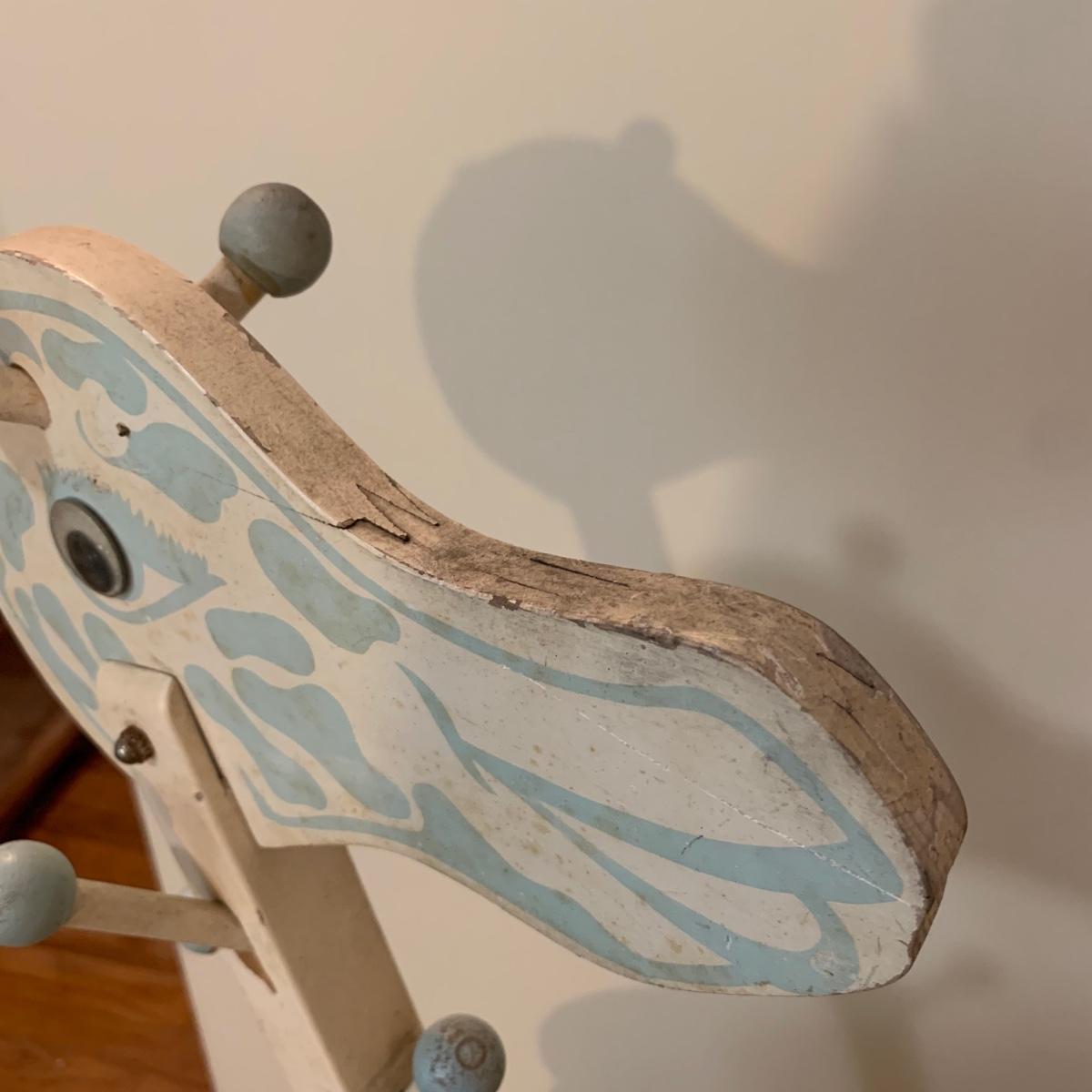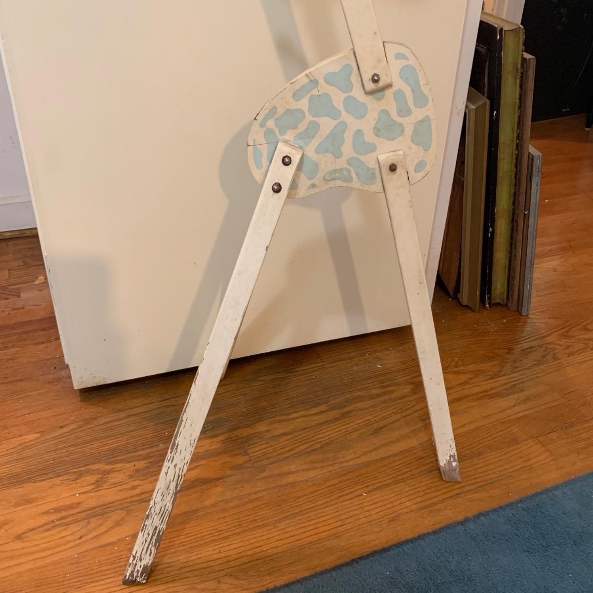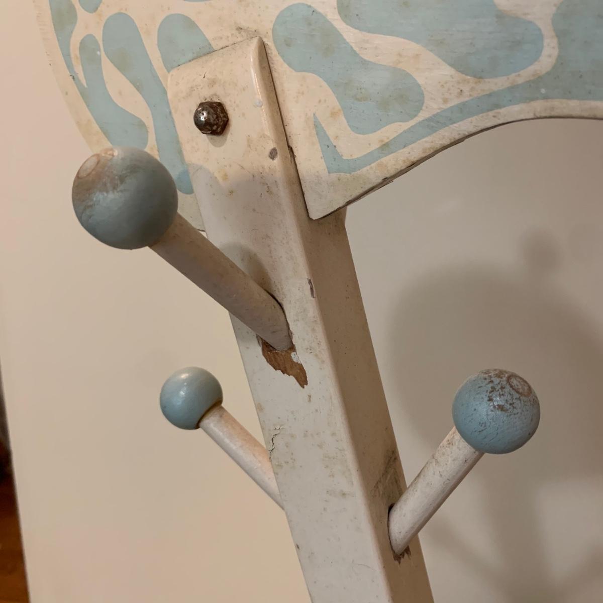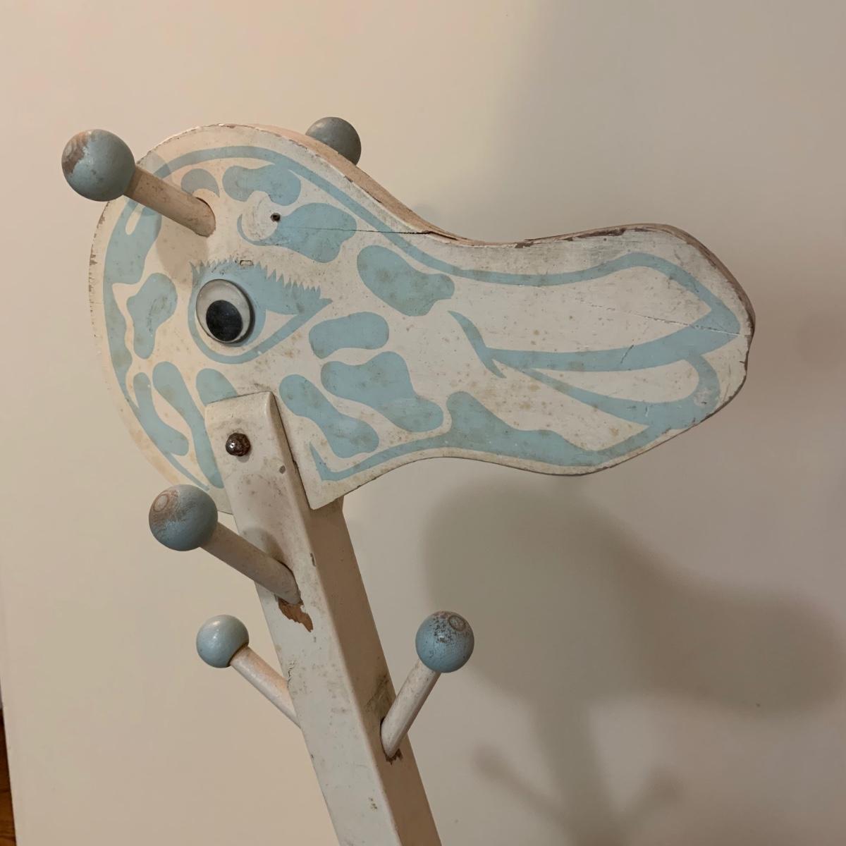 This lot includes five smaller (mostly wood) toys and one large wood giraffe hanging rack. The lot also includes ears that have fallen off the giraffe but can be re-attached. The small wooden toys are in good condition, with some slight signs of wear and aging. The giraffe rack is in fair condition as it has paint chipping and the ears have fallen off. The giraffe measures about 46in x 9in. Local pickup only.