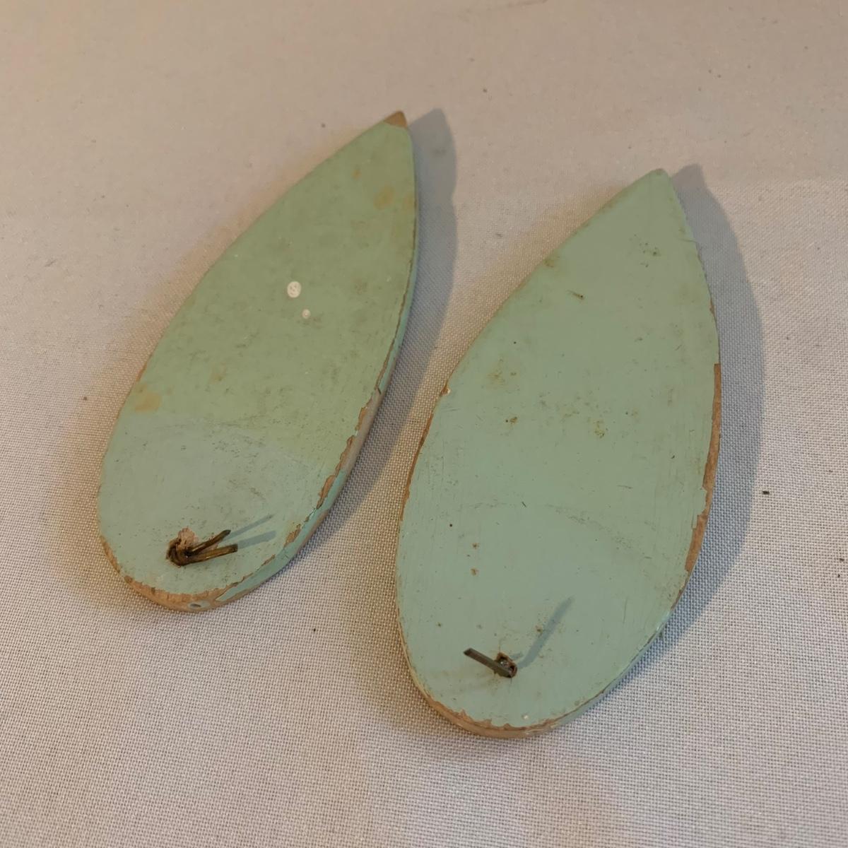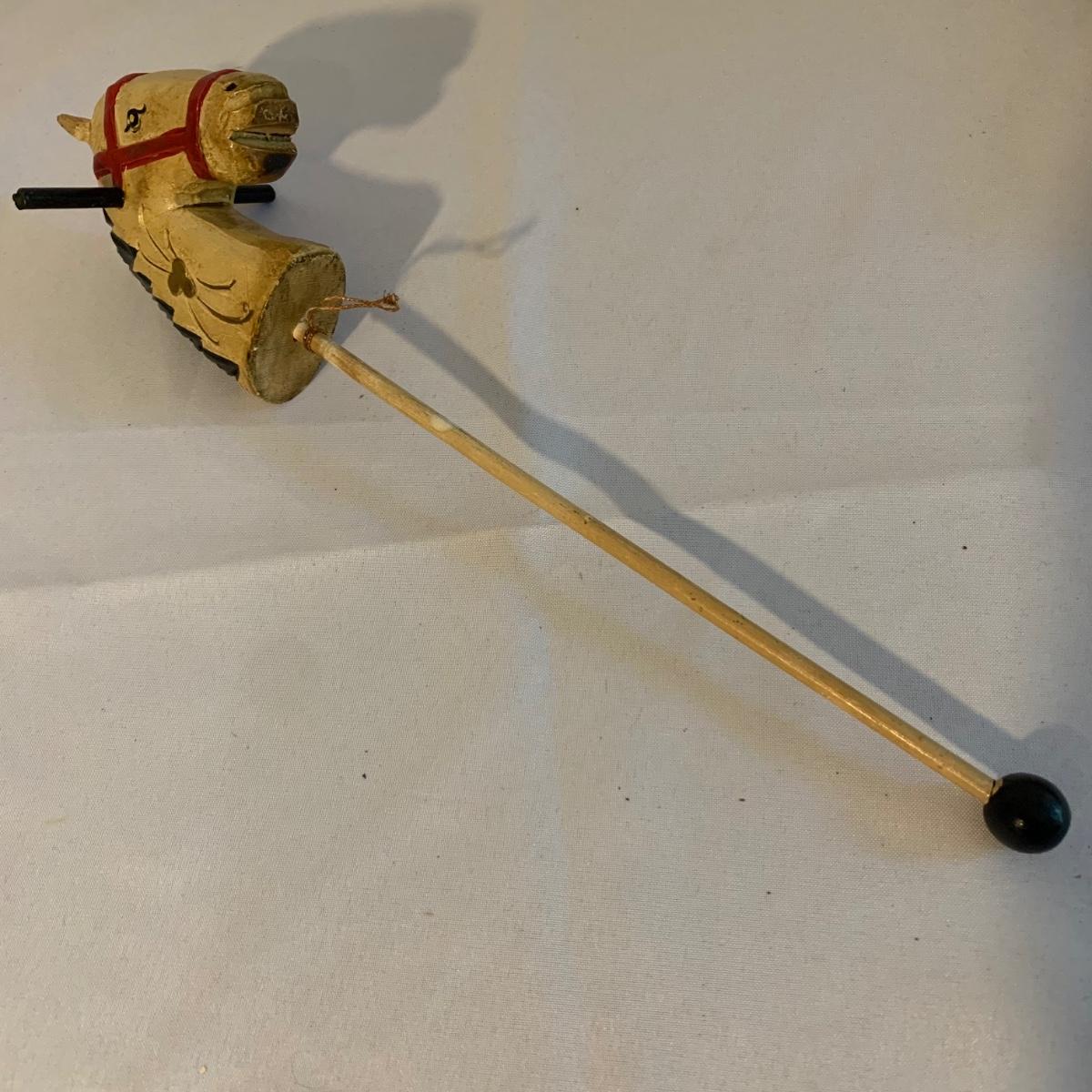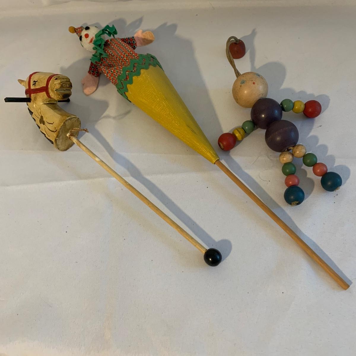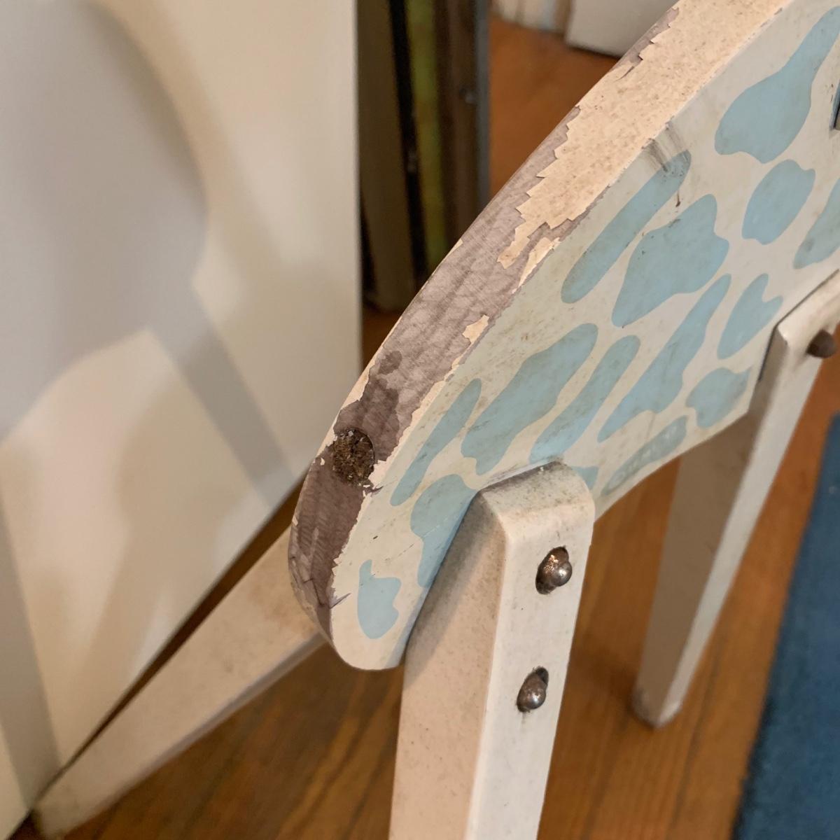 This lot includes five smaller (mostly wood) toys and one large wood giraffe hanging rack. The lot also includes ears that have fallen off the giraffe but can be re-attached. The small wooden toys are in good condition, with some slight signs of wear and aging. The giraffe rack is in fair condition as it has paint chipping and the ears have fallen off. The giraffe measures about 46in x 9in. Local pickup only.