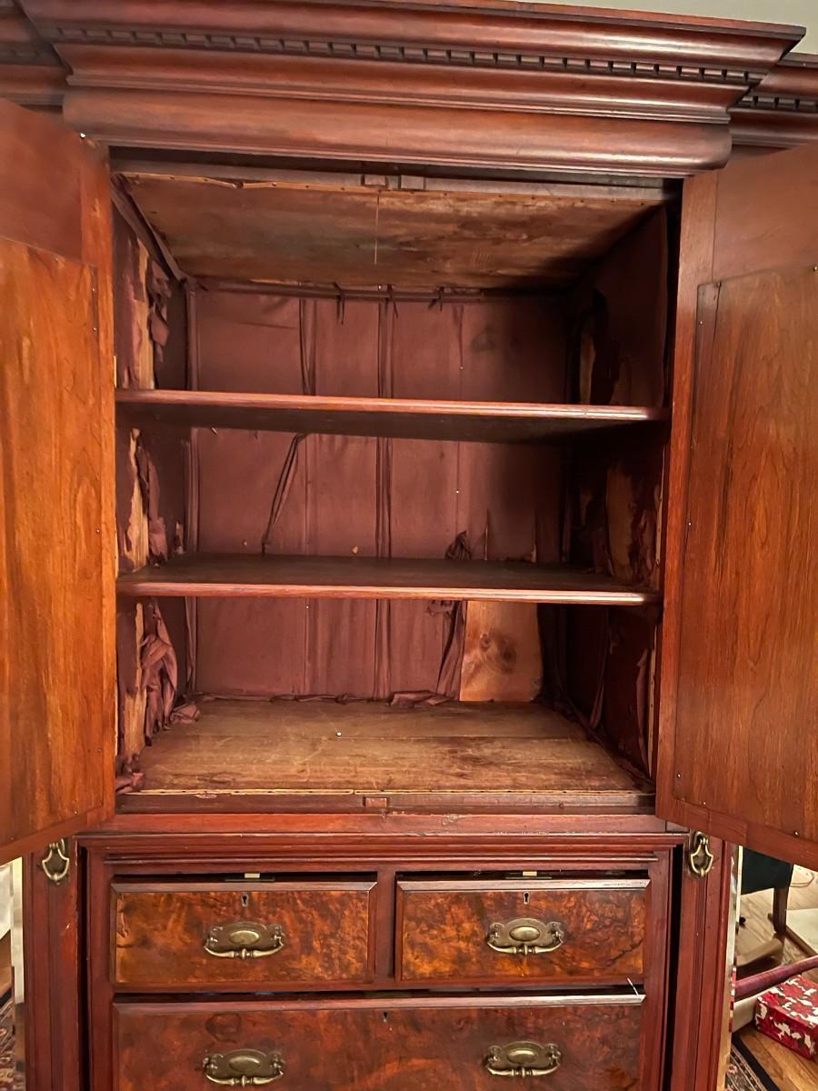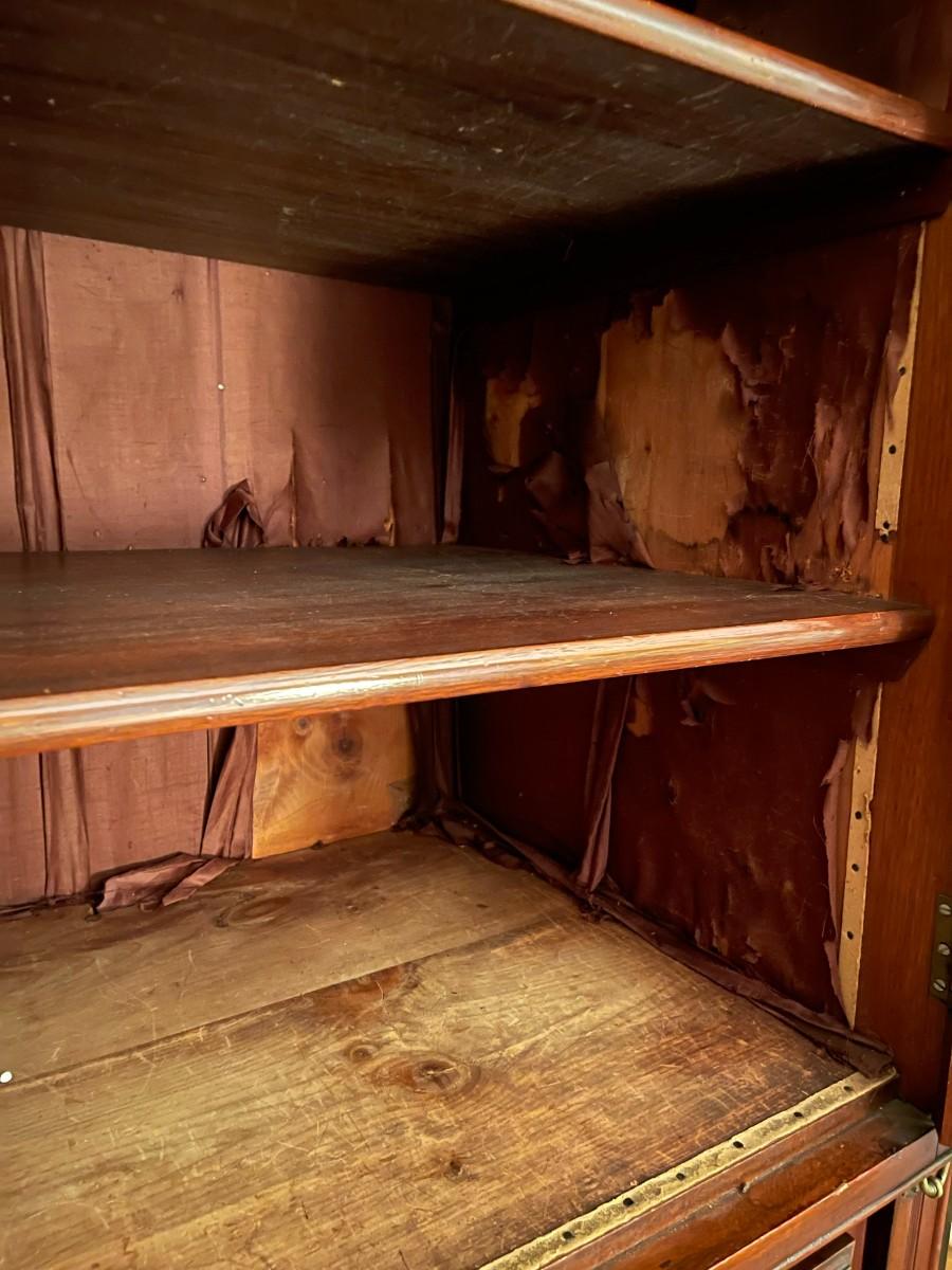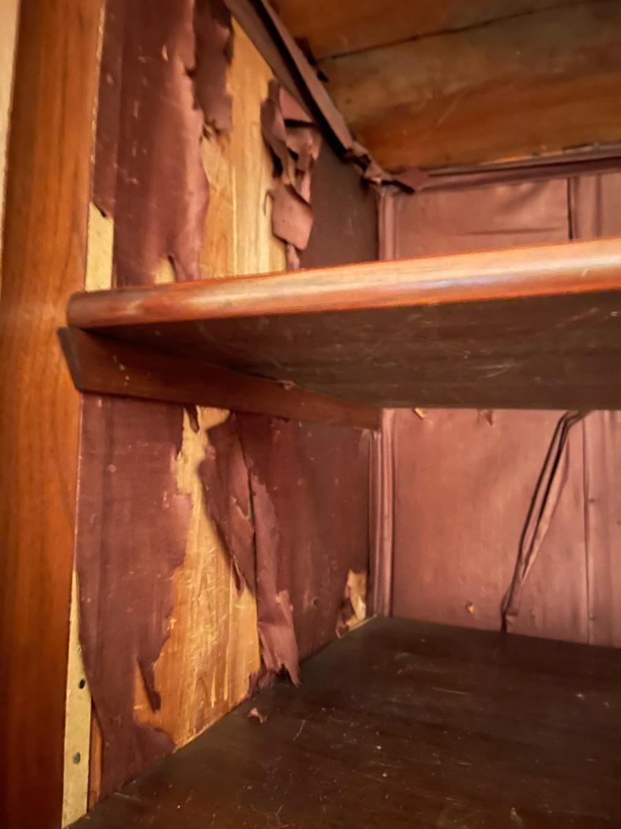 Inside the center cabinet doors, you will see fabric lining around the shelving unit that needs to be replaced or the wood refinished.