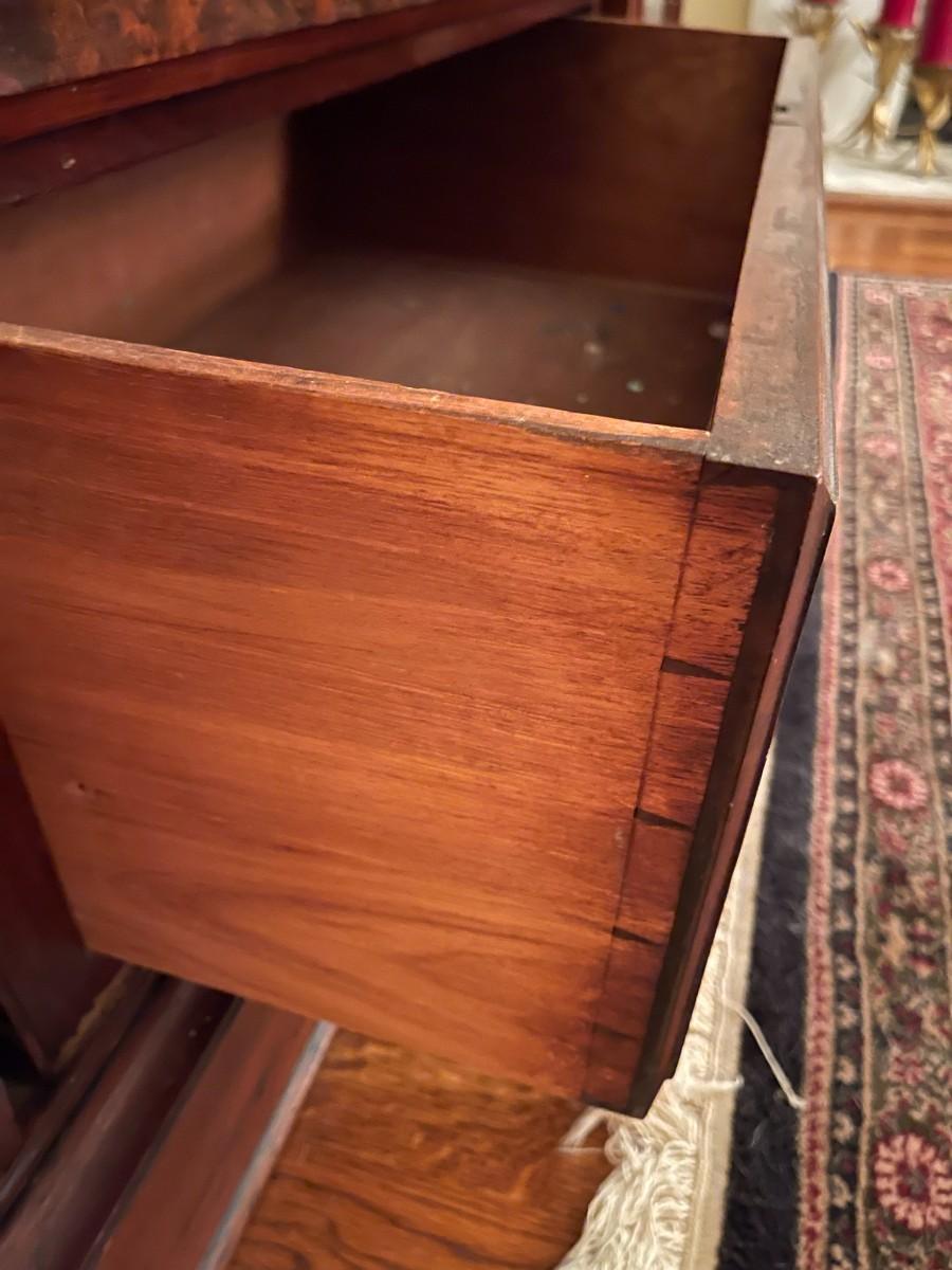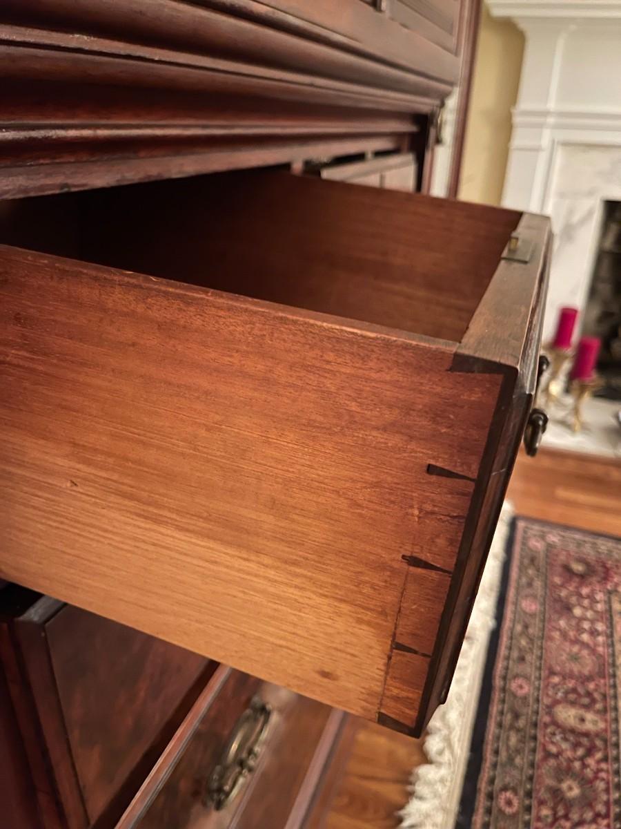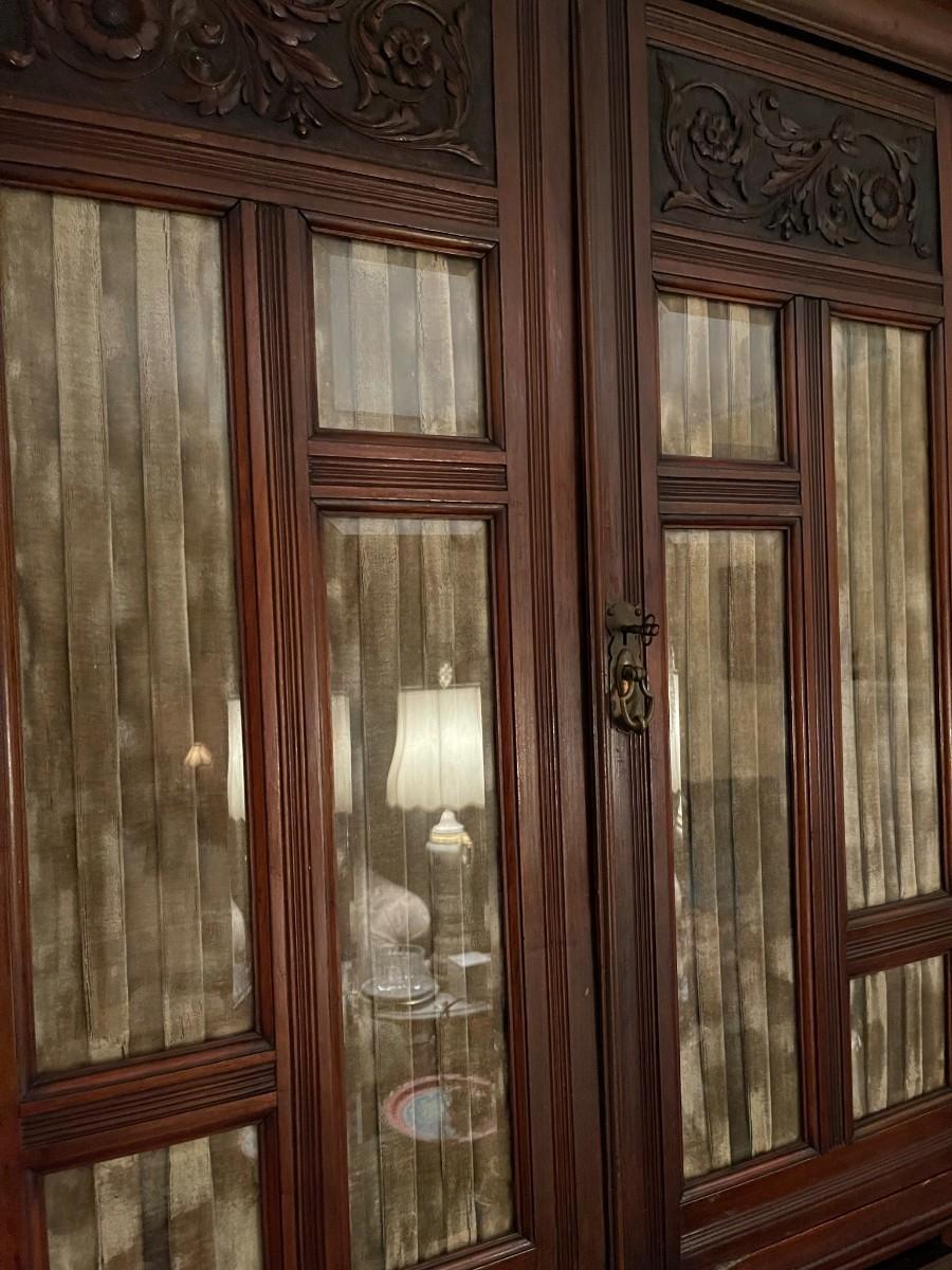 Inside the center cabinet doors, you will see fabric lining around the shelving unit that needs to be replaced or the wood refinished.
