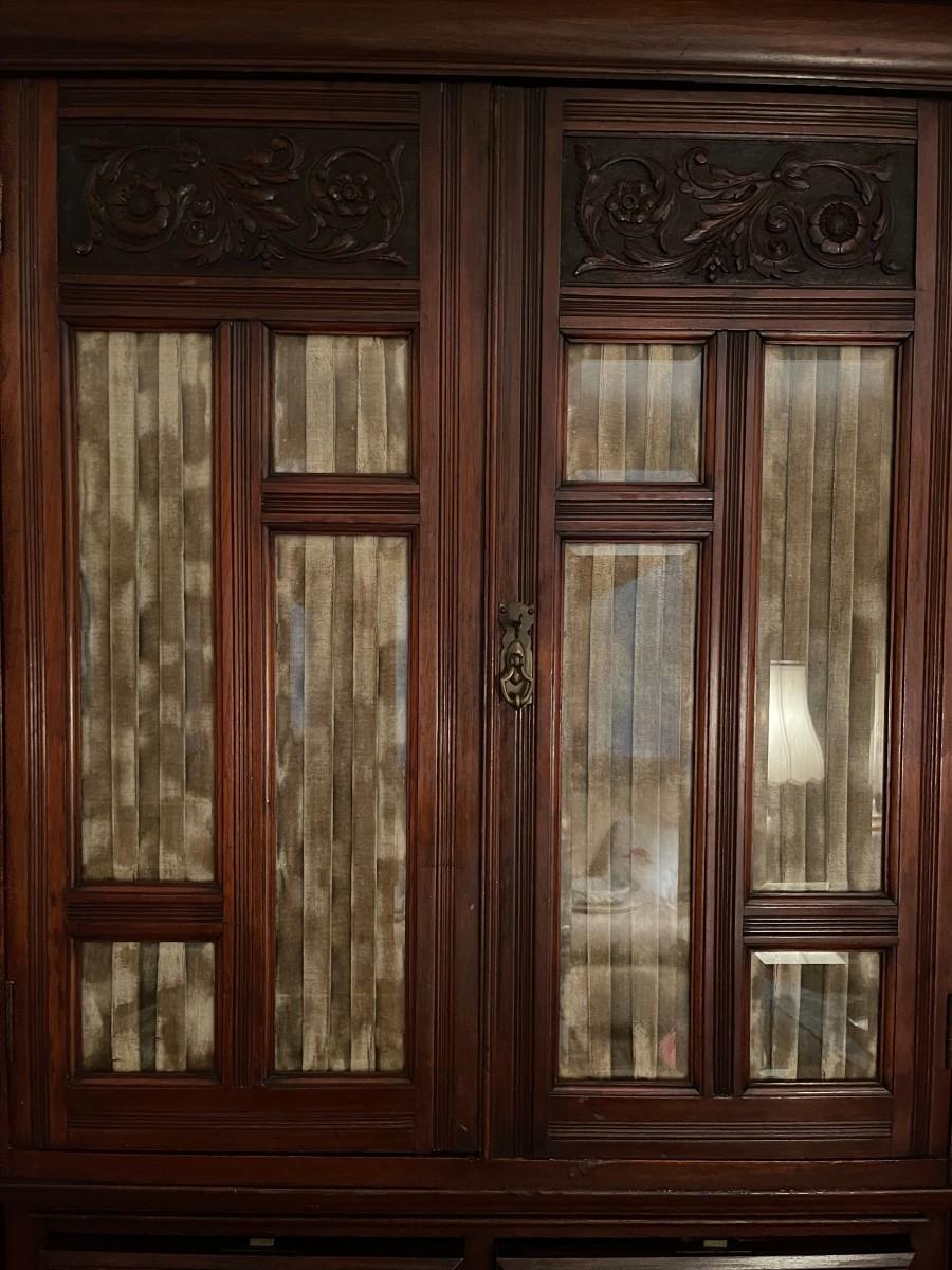 The center cabinet doors have glass panels and a velvet-type brown/cream fabric behind them.