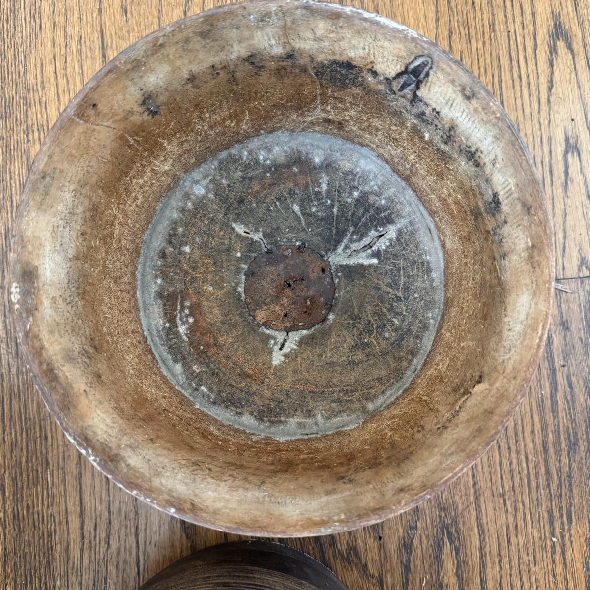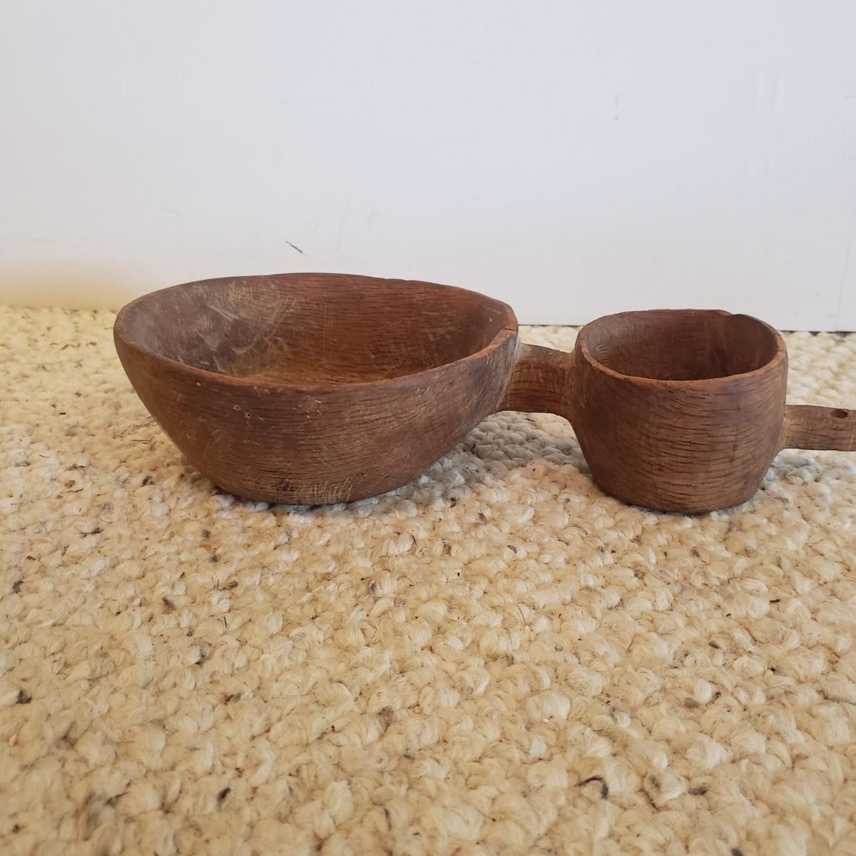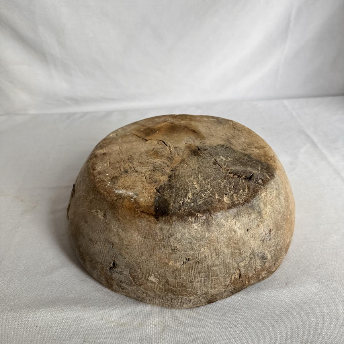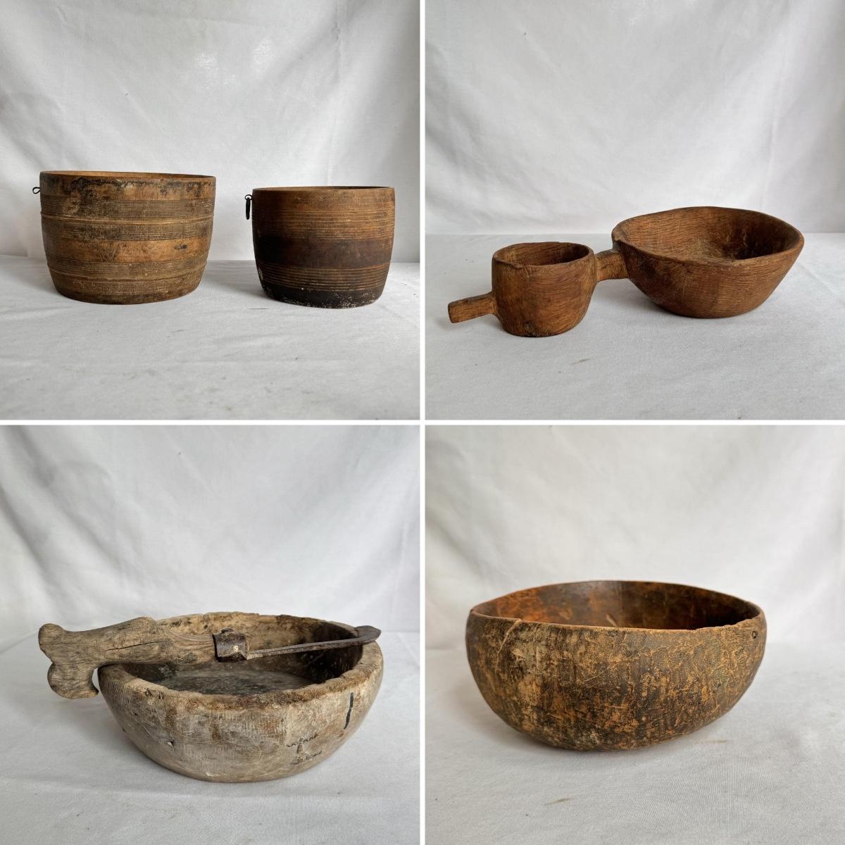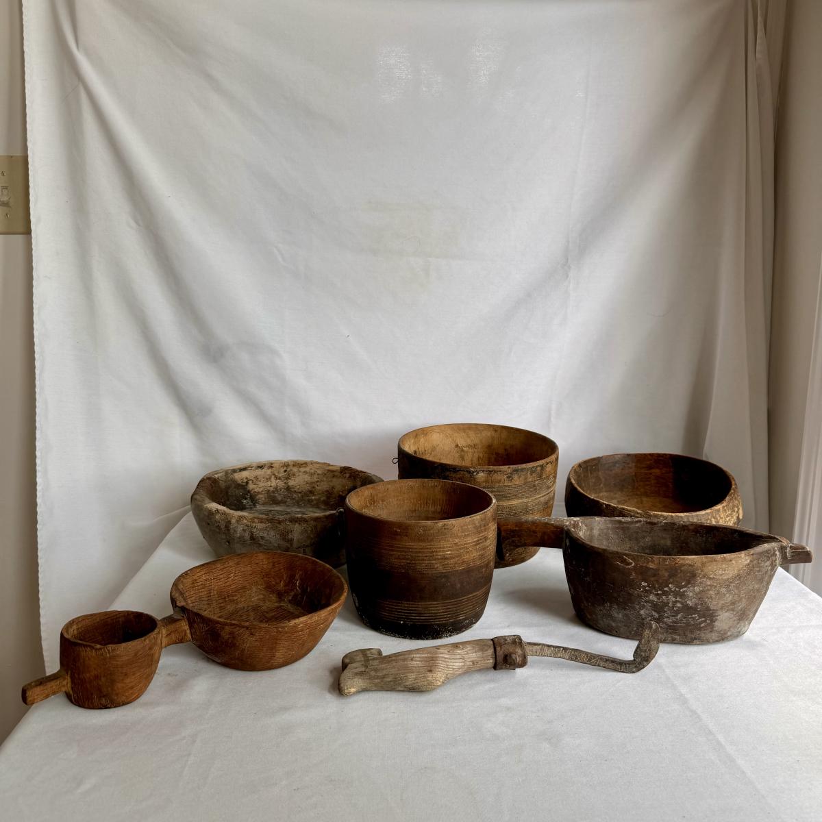This lot includes six unique wooden bowls and one wooden and iron kitchen tool. The largest bowl is the one pictured with the kitchen tool resting on top. The bowl measures 10” x 4”H.