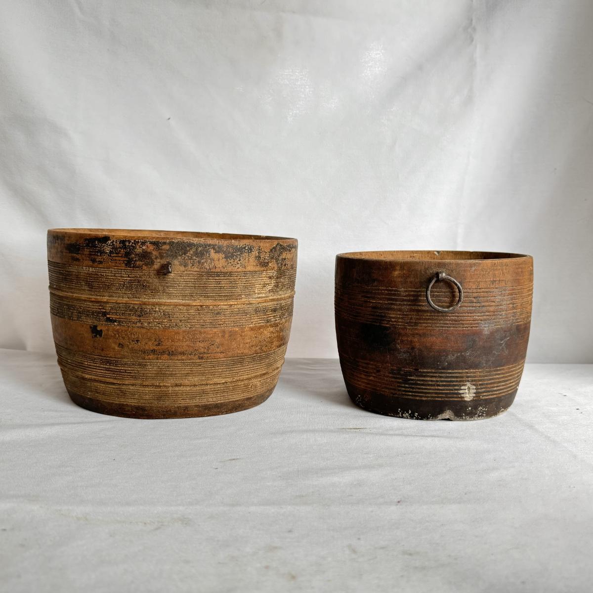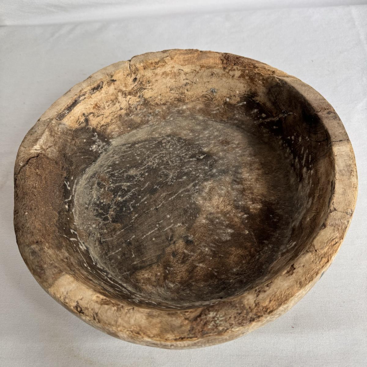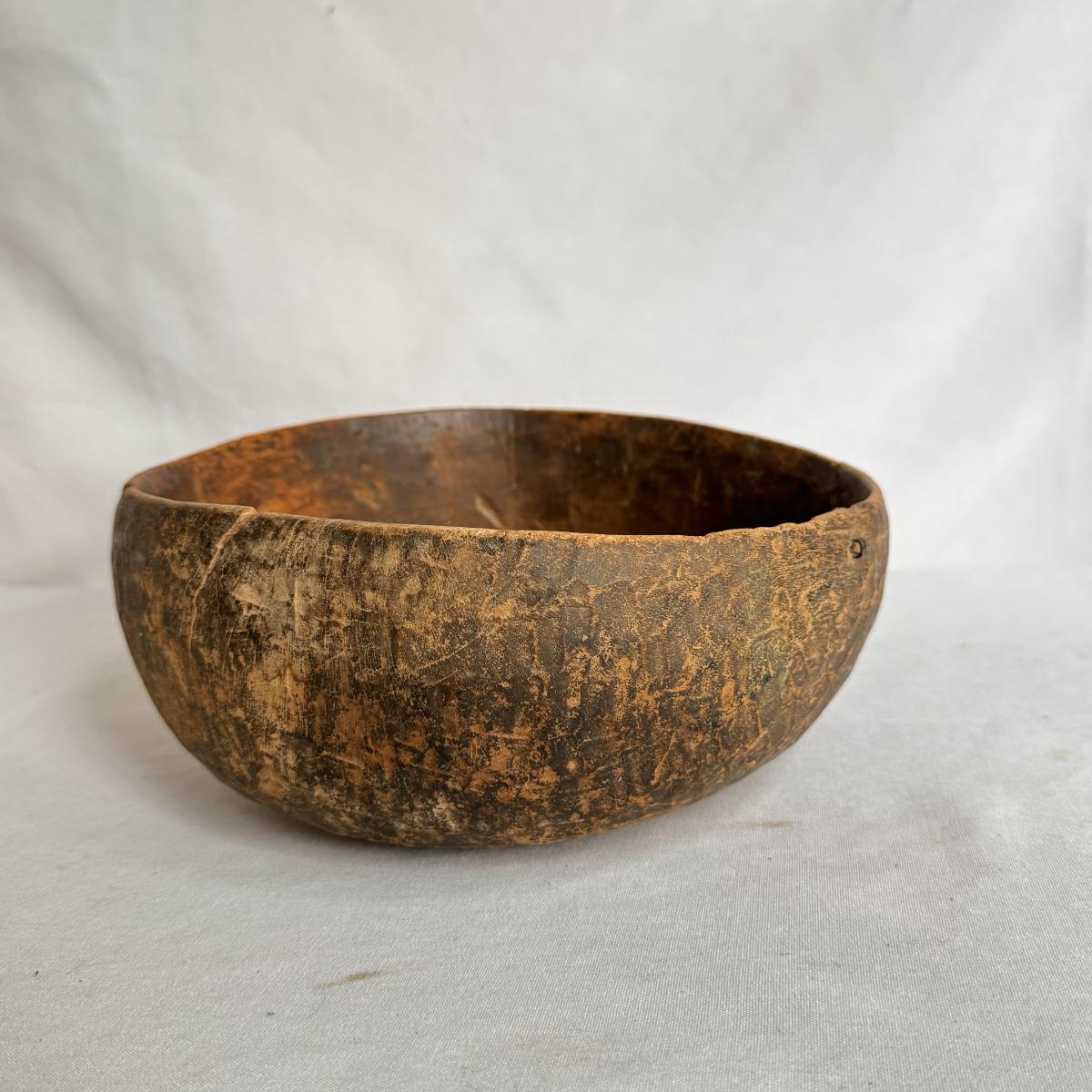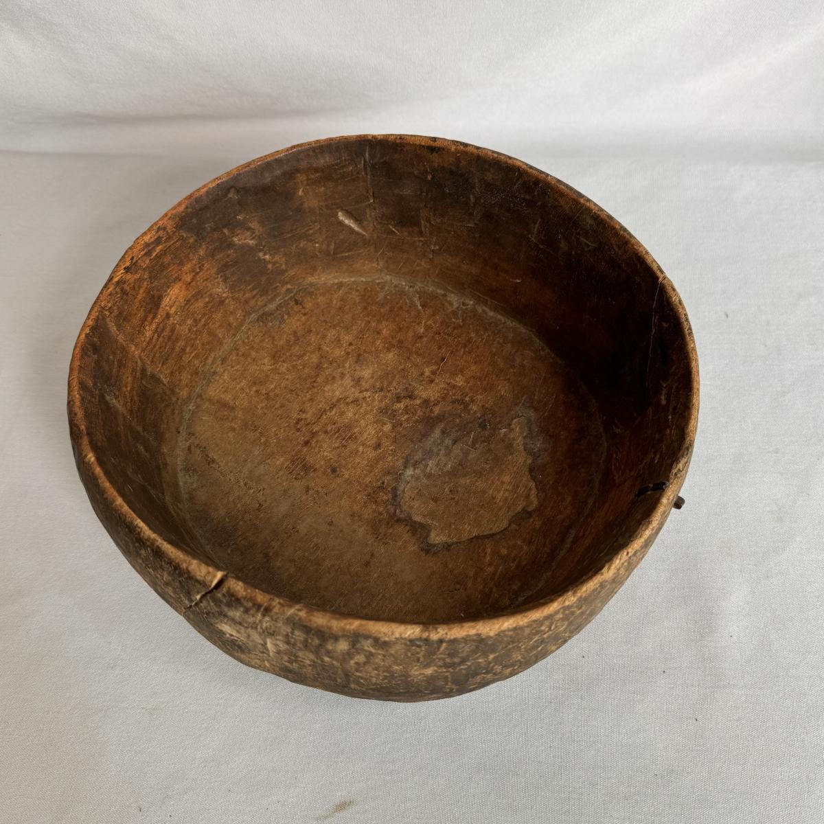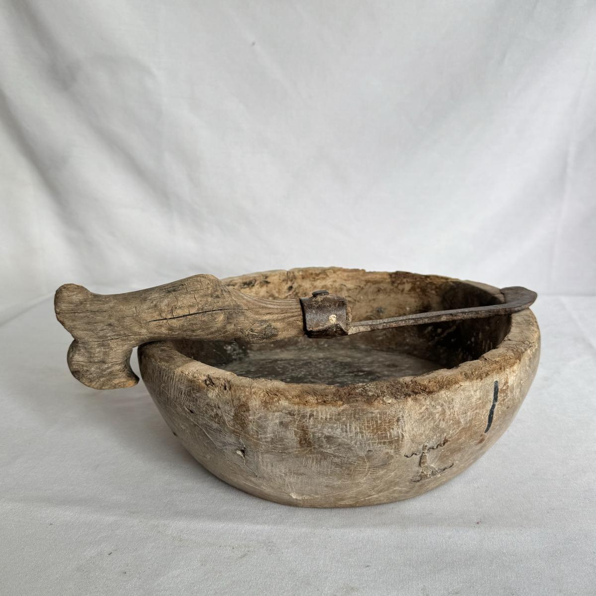 This lot includes six unique wooden bowls and one wooden and iron kitchen tool. The largest bowl is the one pictured with the kitchen tool resting on top. The bowl measures 10” x 4”H.