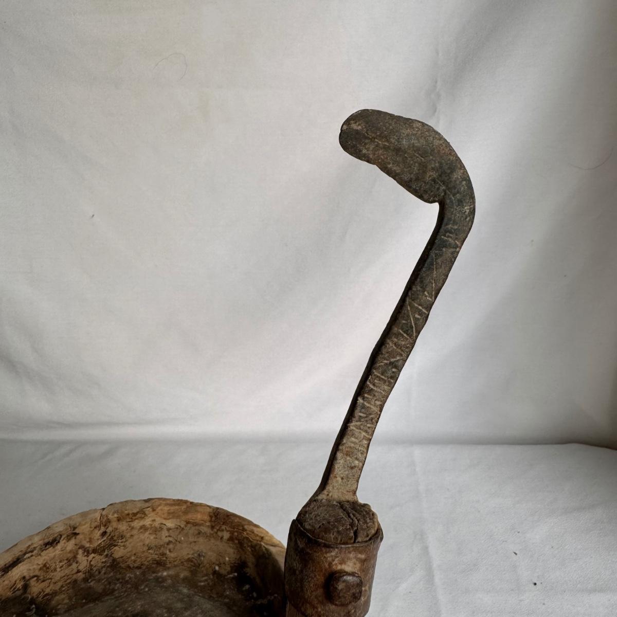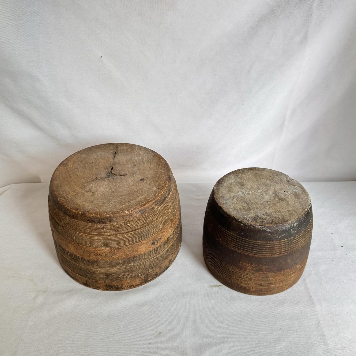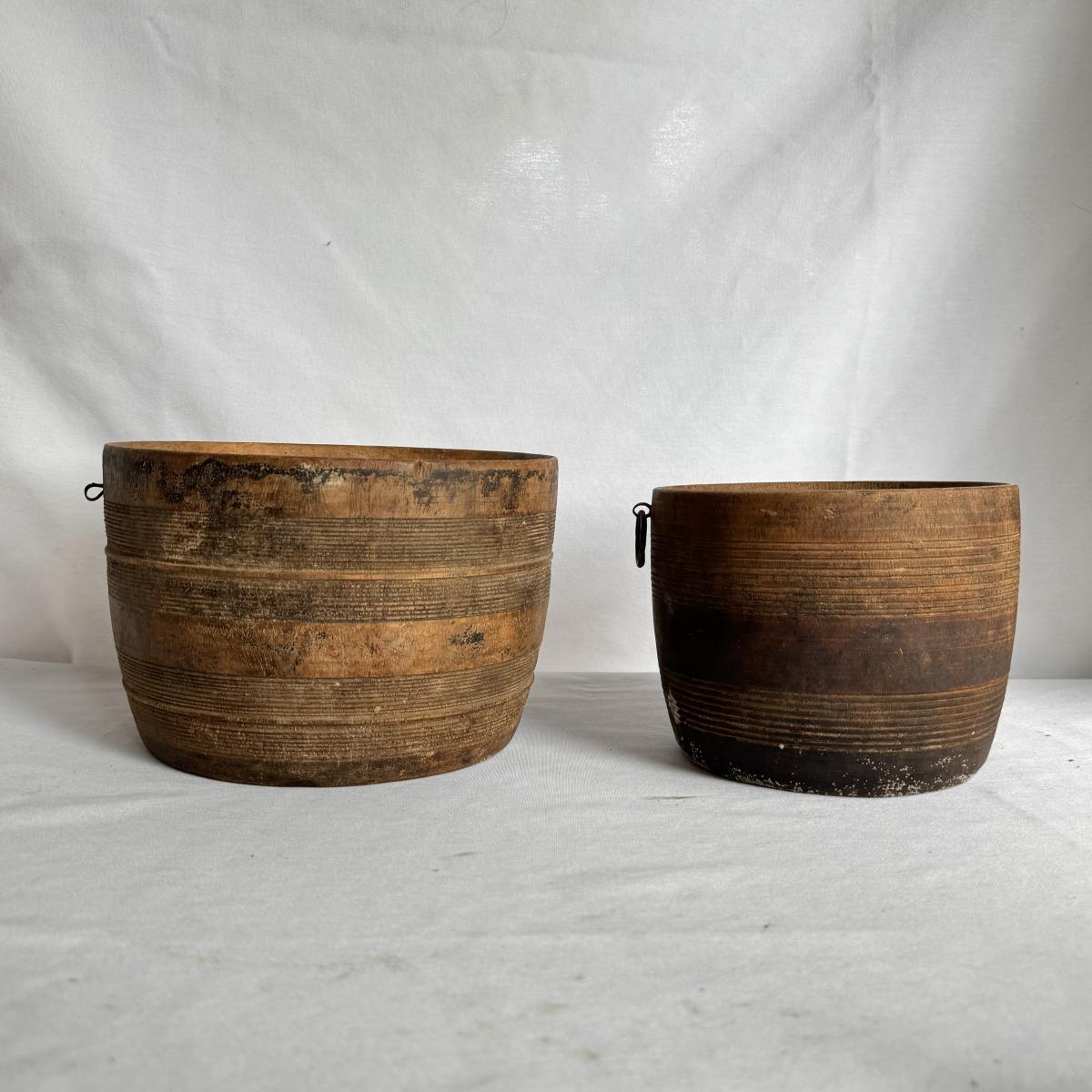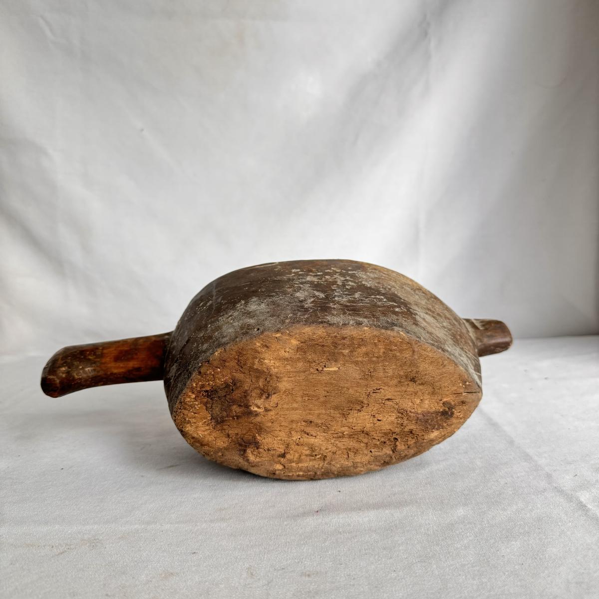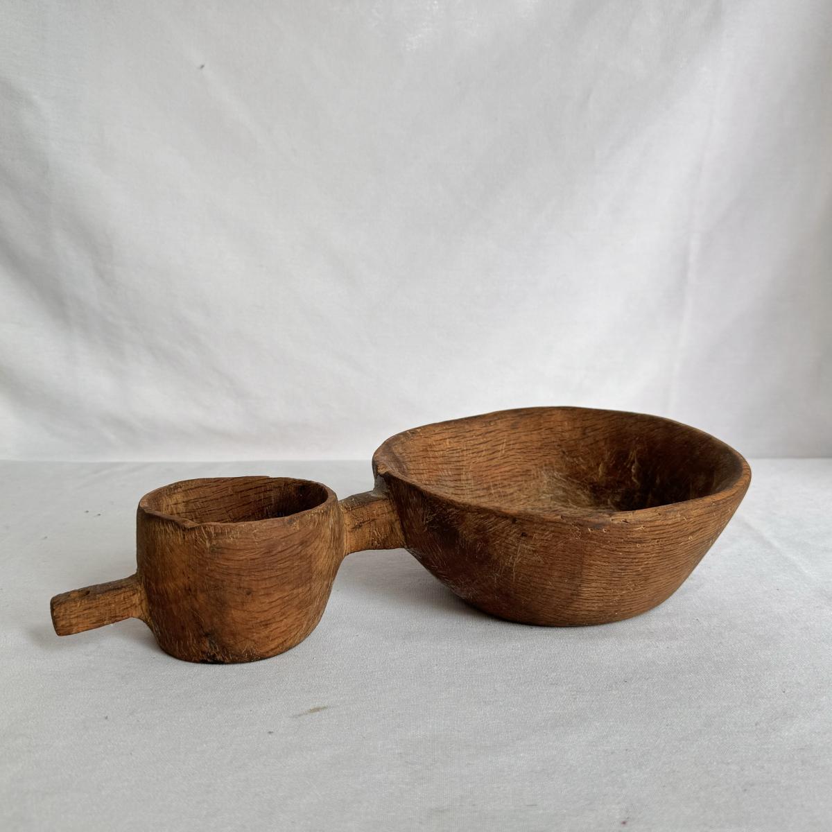 This lot includes six unique wooden bowls and one wooden and iron kitchen tool. The largest bowl is the one pictured with the kitchen tool resting on top. The bowl measures 10” x 4”H.