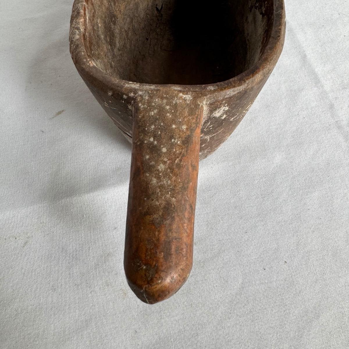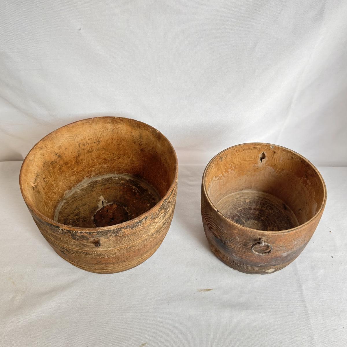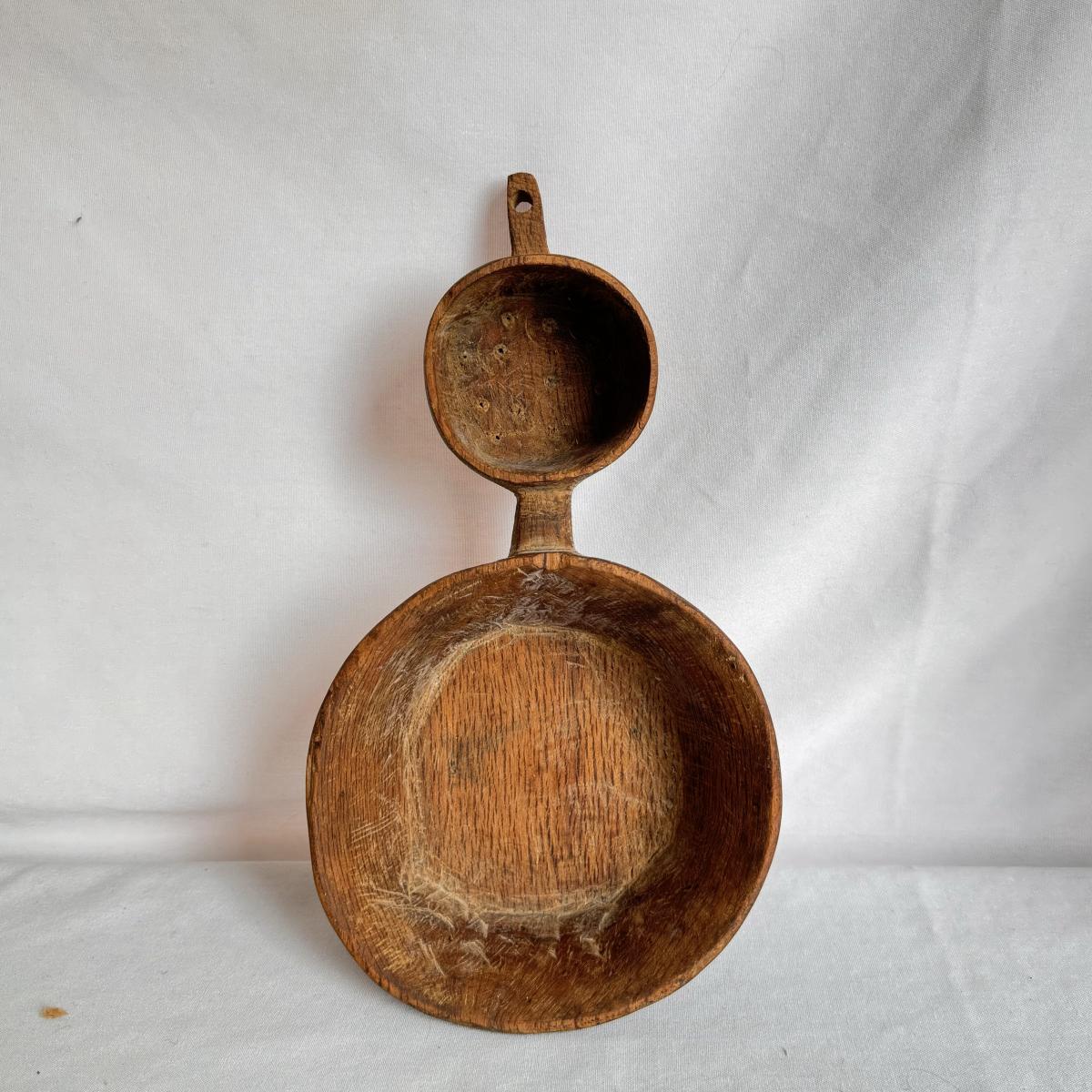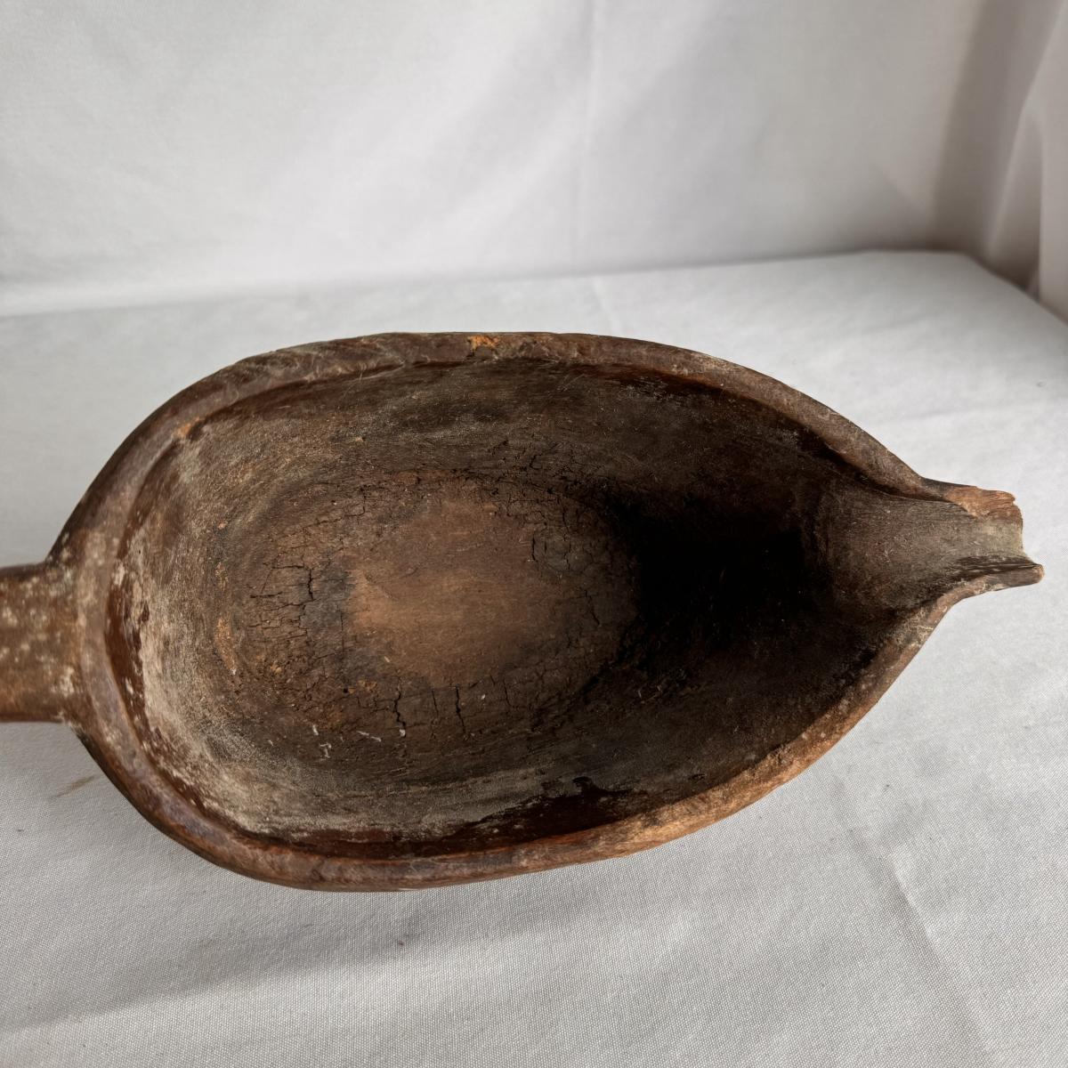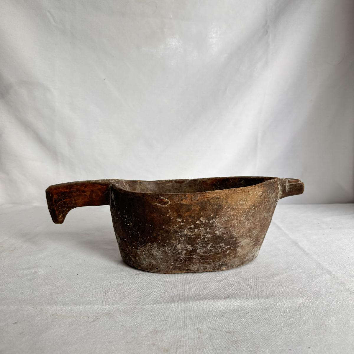 This lot includes six unique wooden bowls and one wooden and iron kitchen tool. The largest bowl is the one pictured with the kitchen tool resting on top. The bowl measures 10” x 4”H.