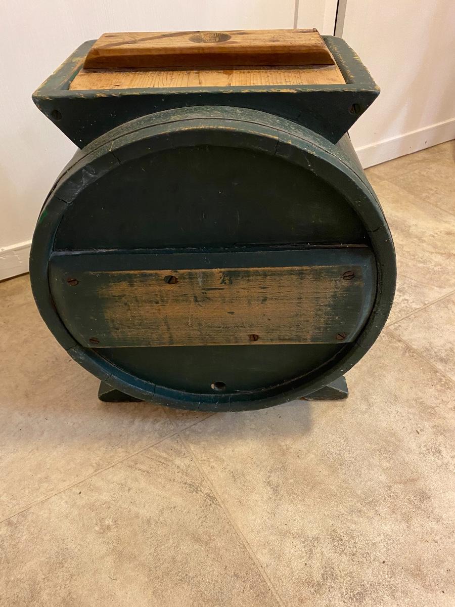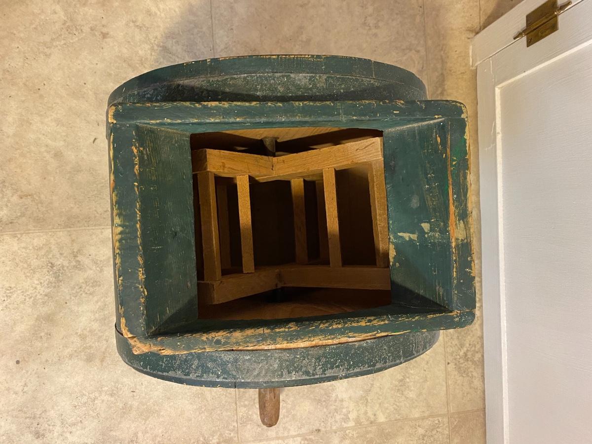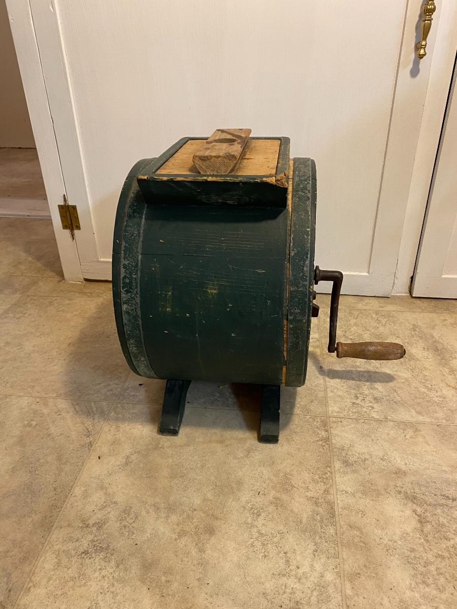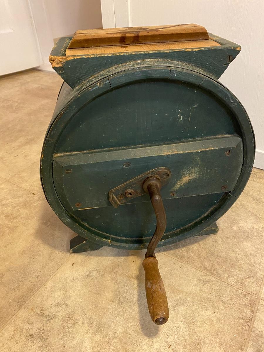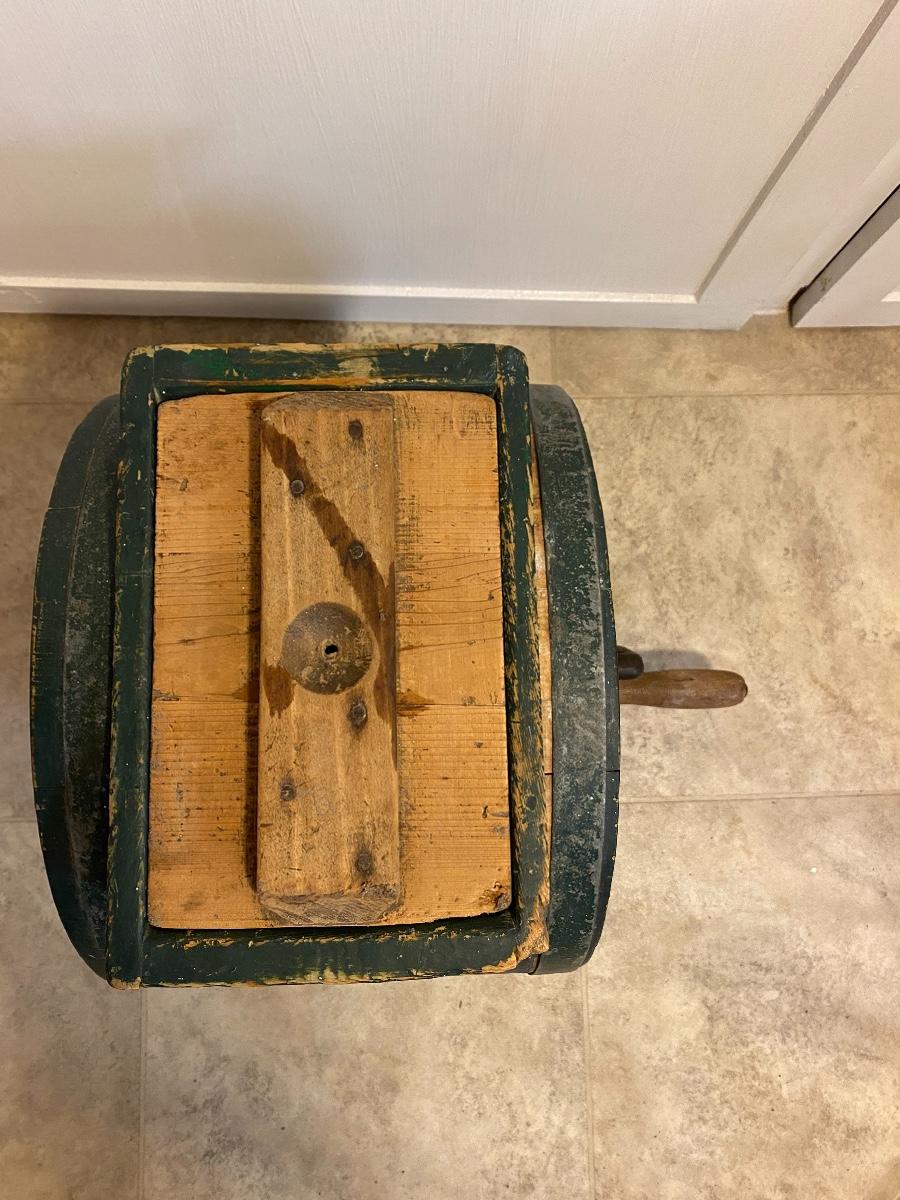 Antique wooden butter churn, original green paint, handle turns. Approx 15”H x 14”W