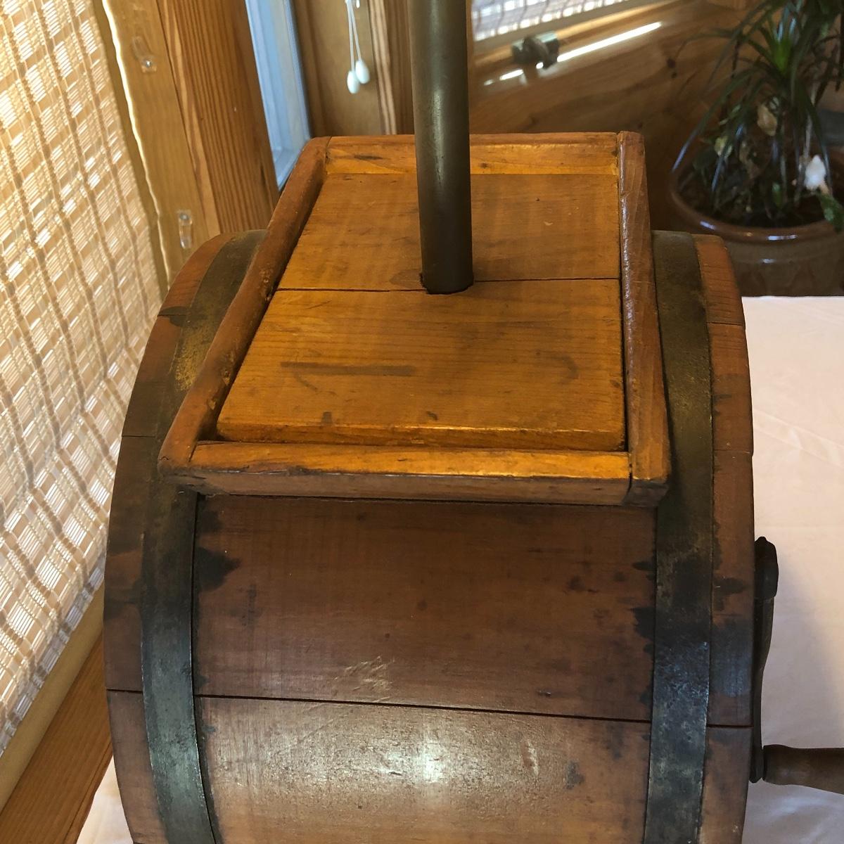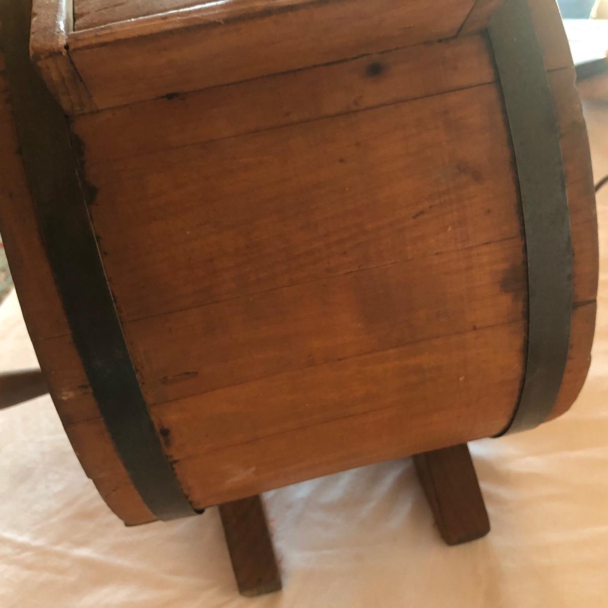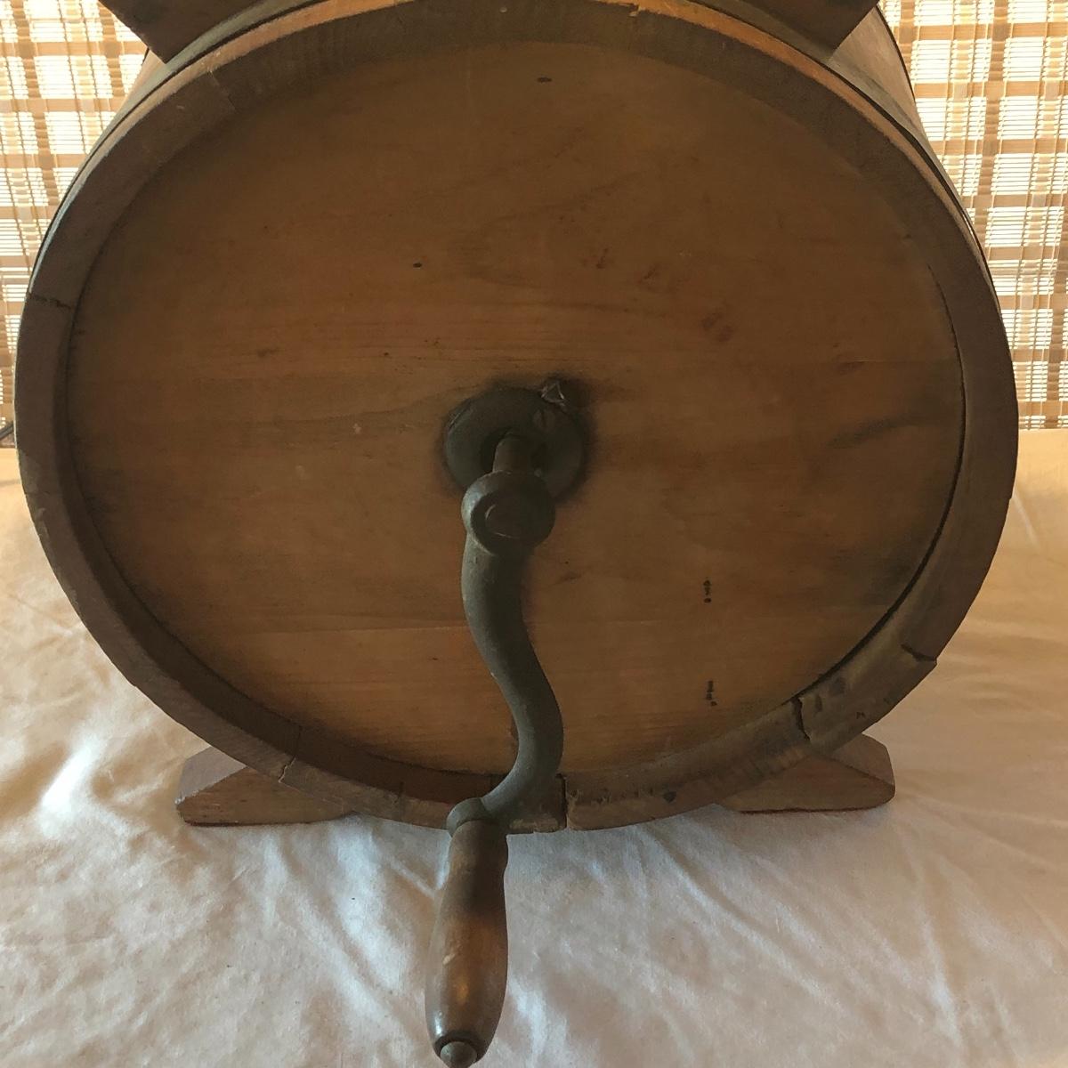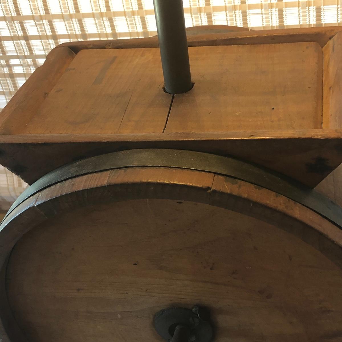 This a wooden antique butter churn with handle; dimensions 12.5” x 9.5” x 14.5”. The butter churn has no chips and is in great condition. The wood appears to be maple and it appears that the original red stencil is still on the back with maker markings on the front. Local pick up only.