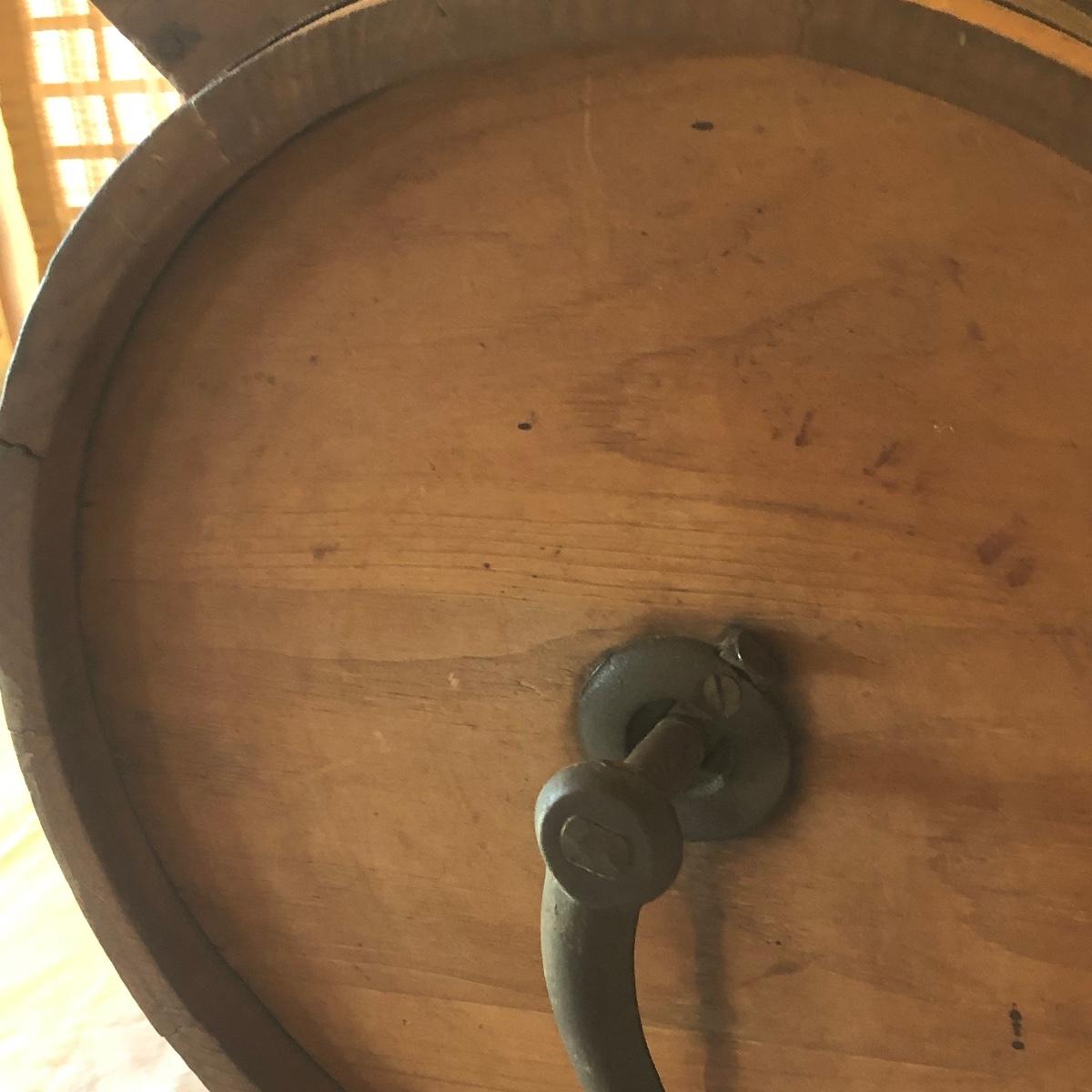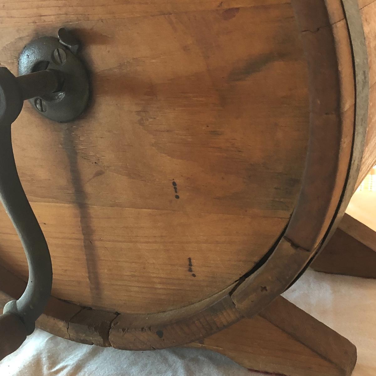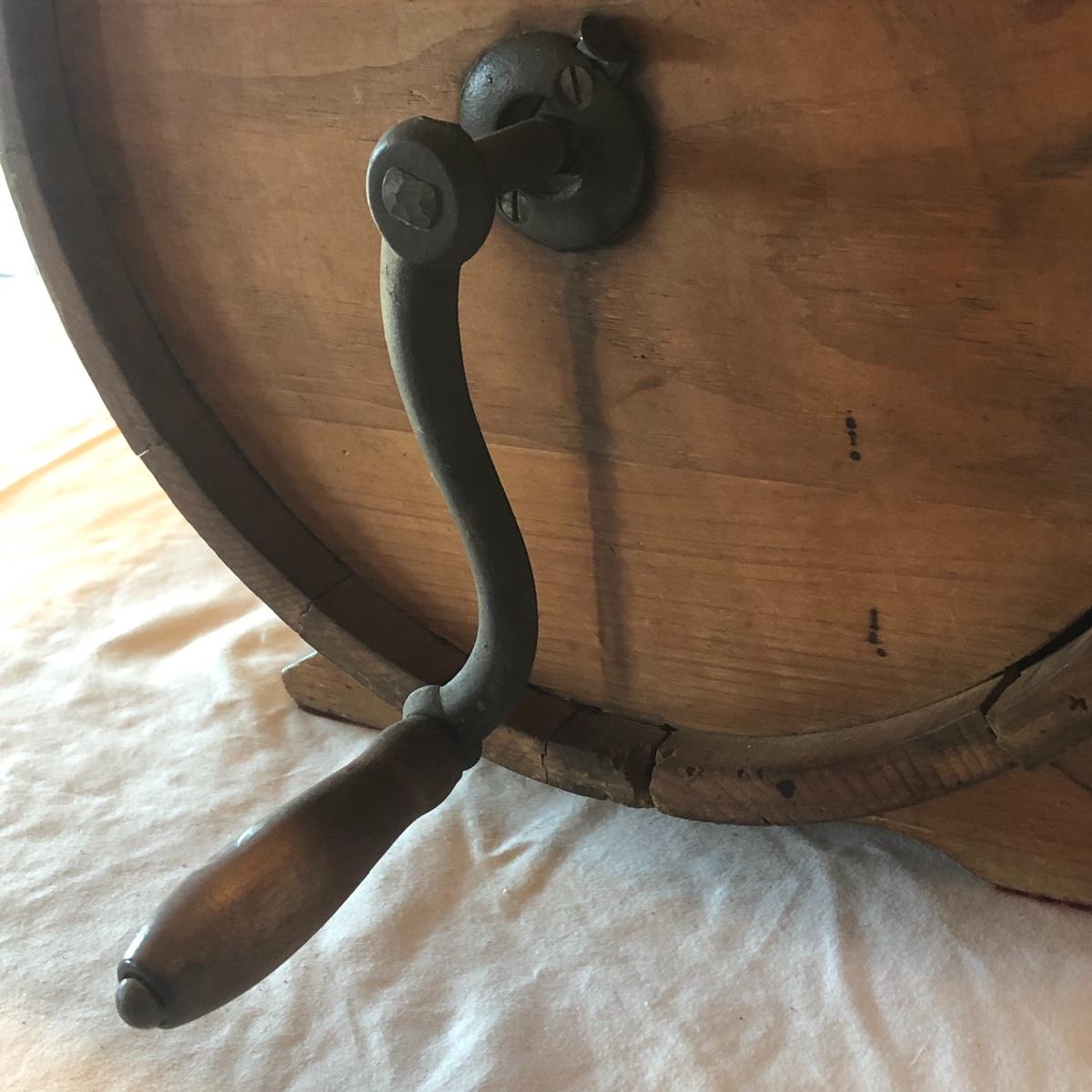 This a wooden antique butter churn with handle; dimensions 12.5” x 9.5” x 14.5”. The butter churn has no chips and is in great condition. The wood appears to be maple and it appears that the original red stencil is still on the back with maker markings on the front. Local pick up only.