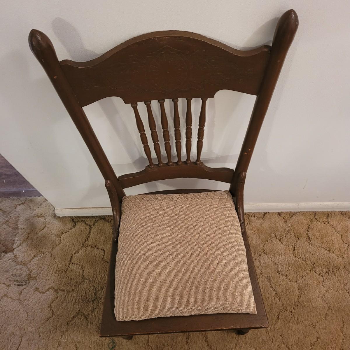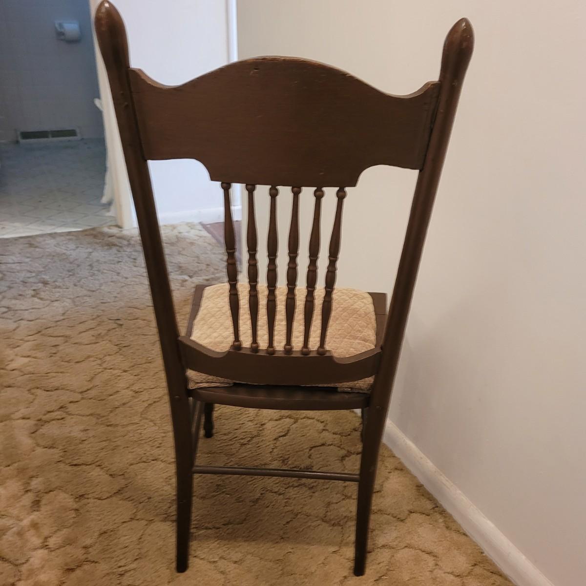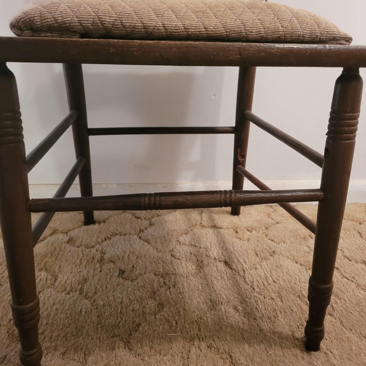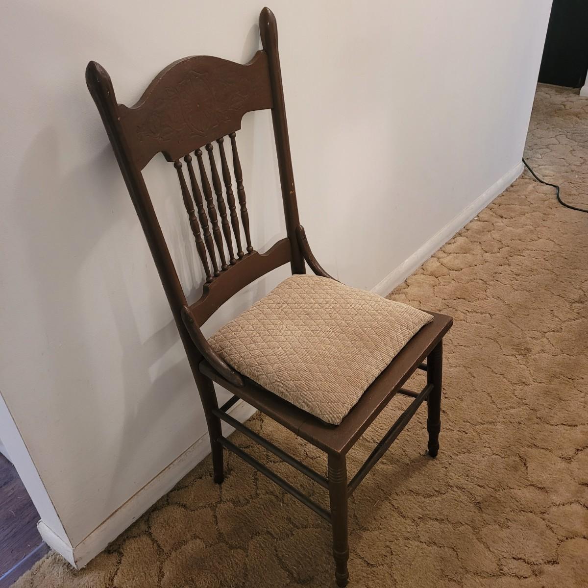 This lot includes one wooden chair with attached cushion. The chair features fine carvings and examples of skilled wood turning. The chair measures 18" x 18" x 42"H with a seat height of 18.5".