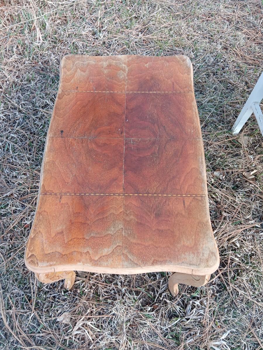 Antique wooden chair with small inlayed design top end table (needs tightened)