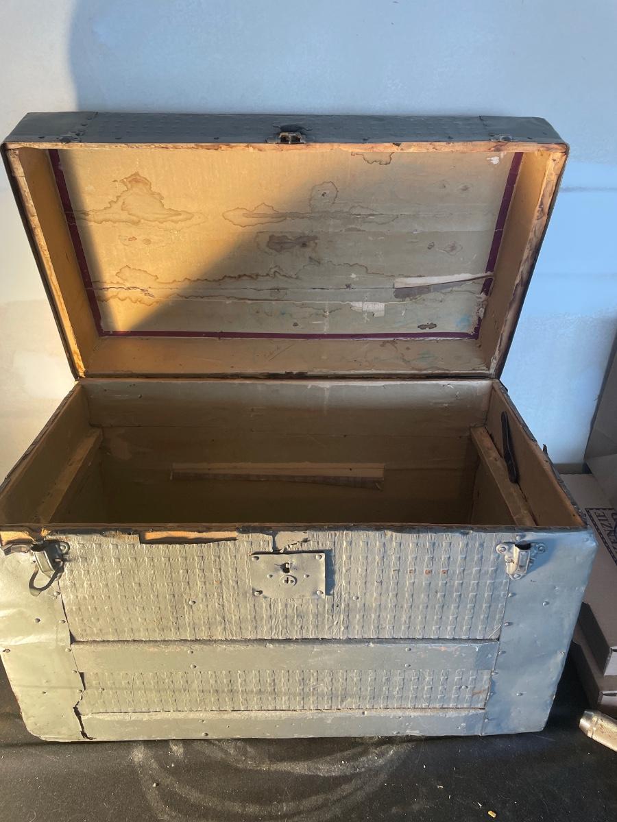 Antique wooden trunk dimensions are 26” long x 14” wide x 18” tall