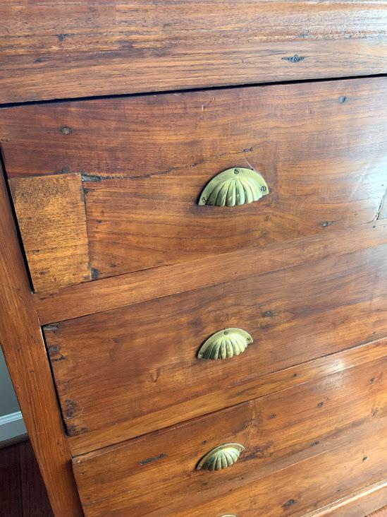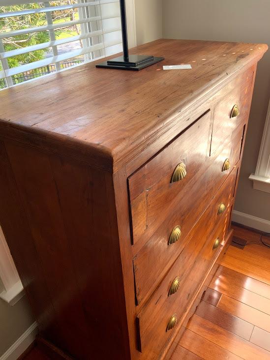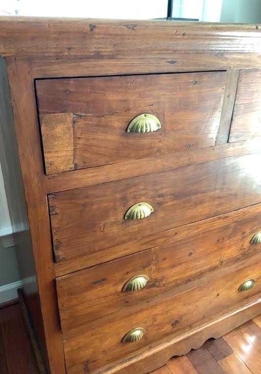 Gorgeous wooden dresser, chest with 5 x drawers and brass vintage looking handles accenting this antique looking treasure.