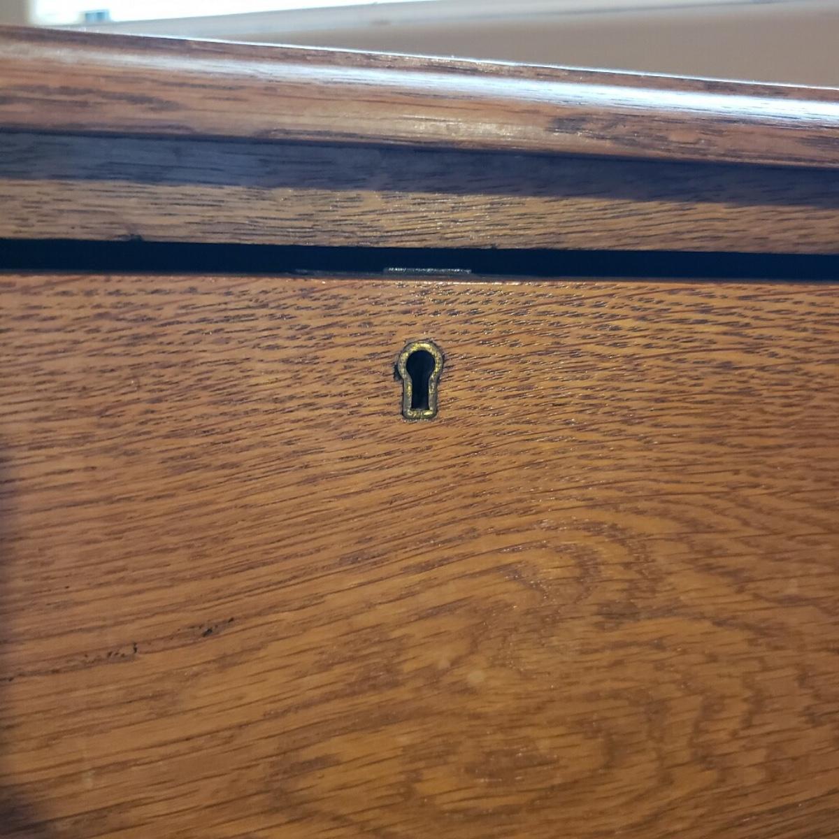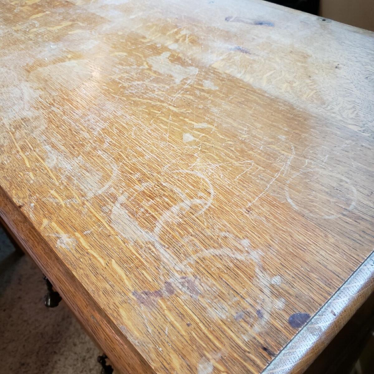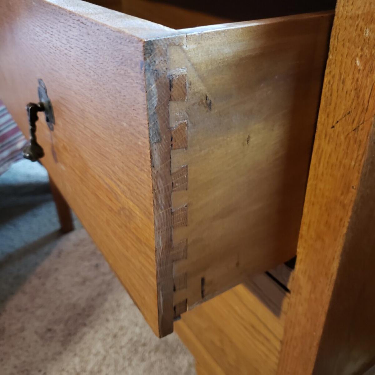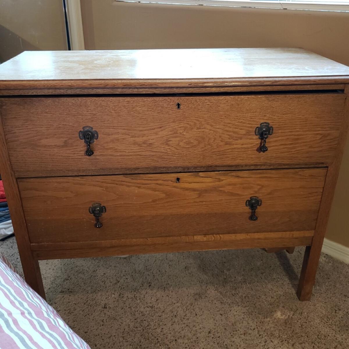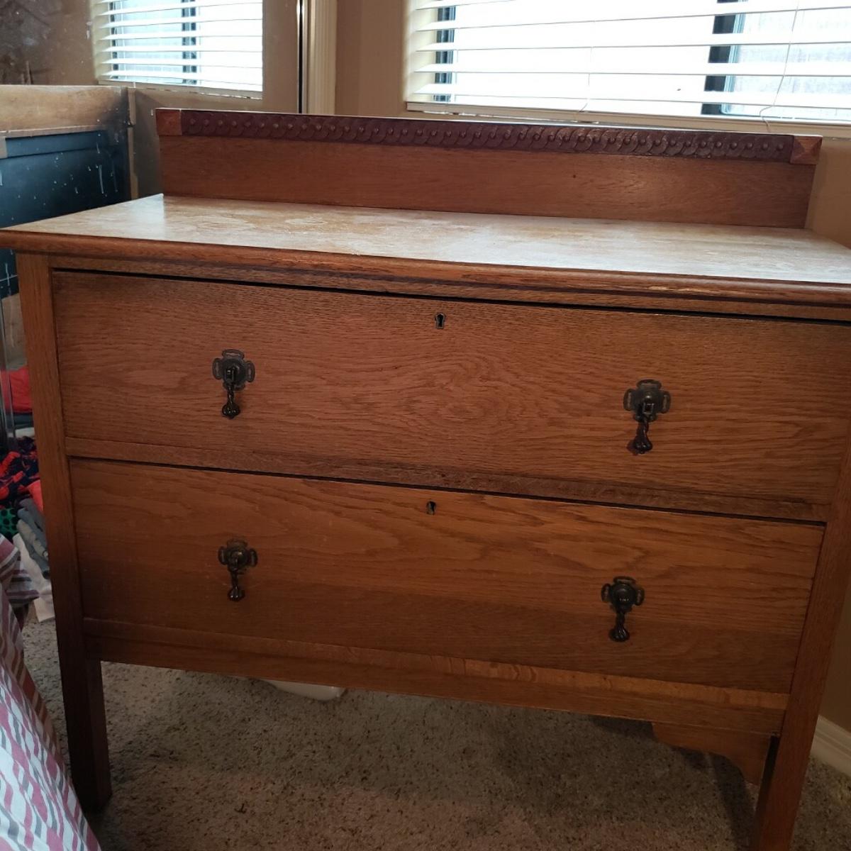 Beautiful antique wooden dresser with dovetail drawers in good condition (39 inches in length, 17 1/2 in depth, 31 inches in height) **missing decorative corner piece on the left bottom side. Heavy wear and water rings on the top. Top decorative piece in pictures needs to be reattached, currently unattached