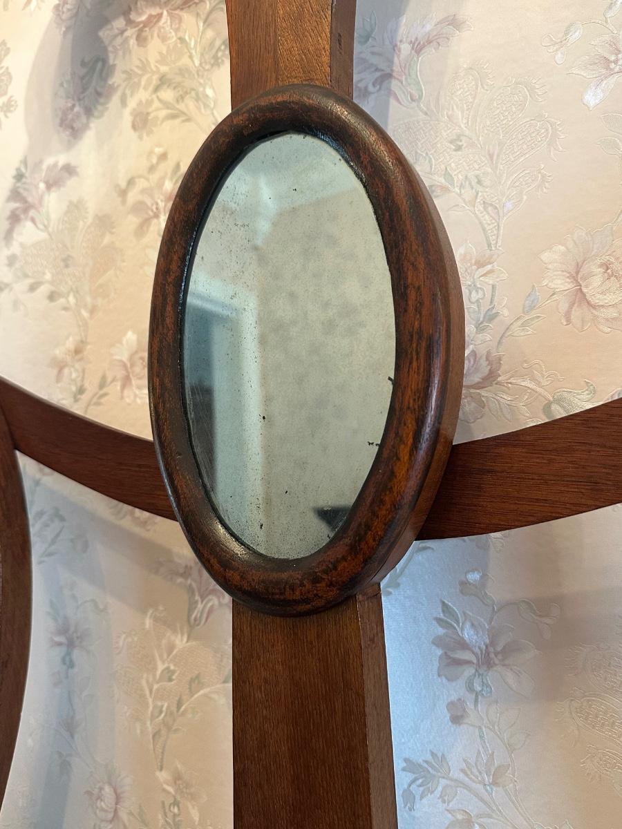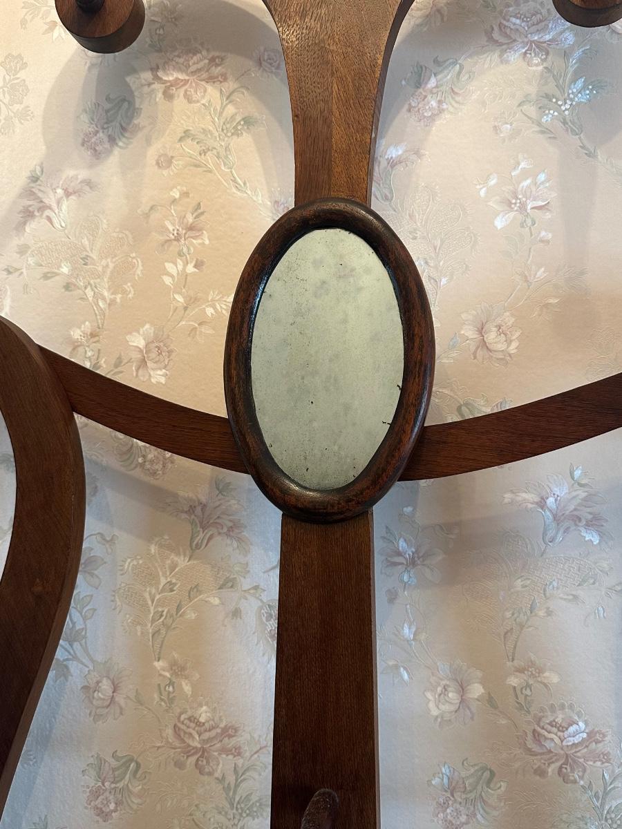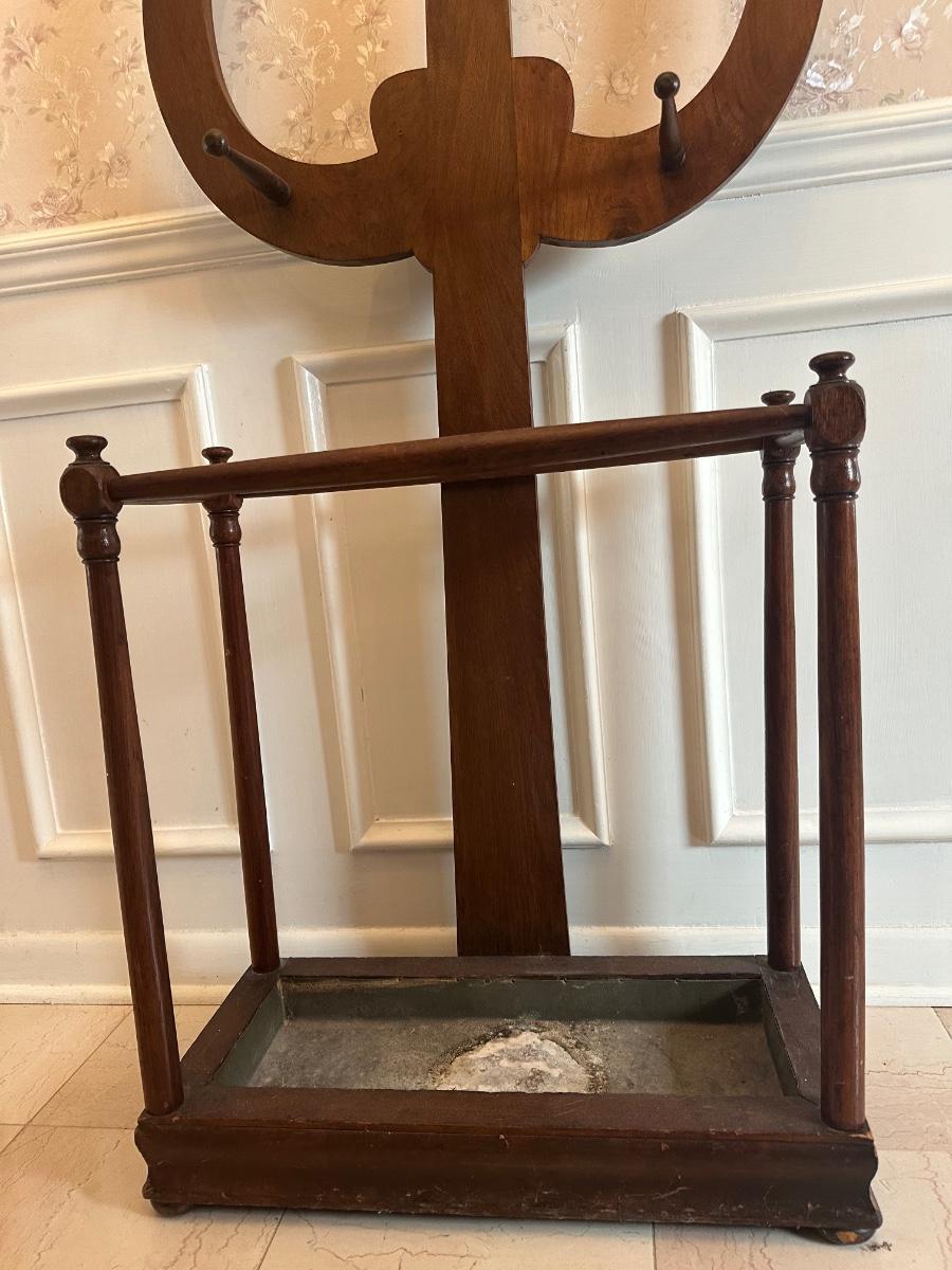 Antique wooden hall tree featuring an original oval mirror, multiple coat and hat pegs, and a lower umbrella stand with metal drip tray. Shows age-appropriate wear including finish wear, mirror silvering loss, and oxidation to umbrella tray. Structurally solid and ready for use.