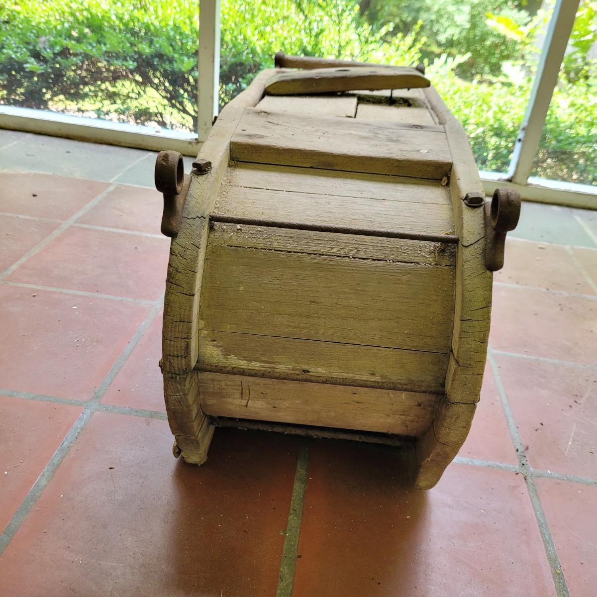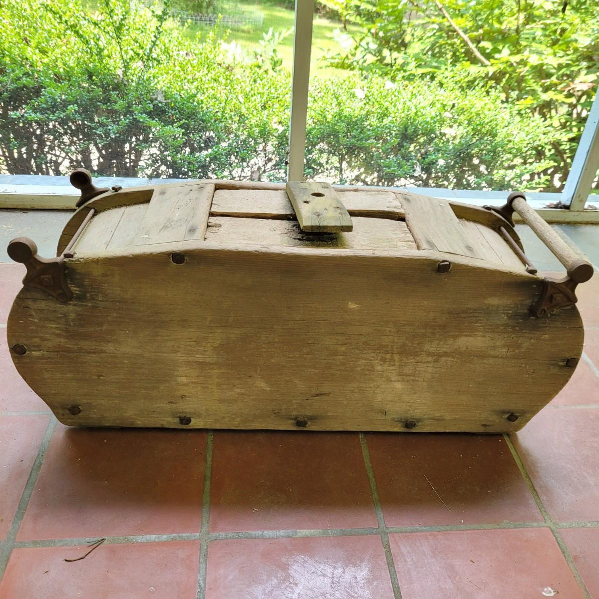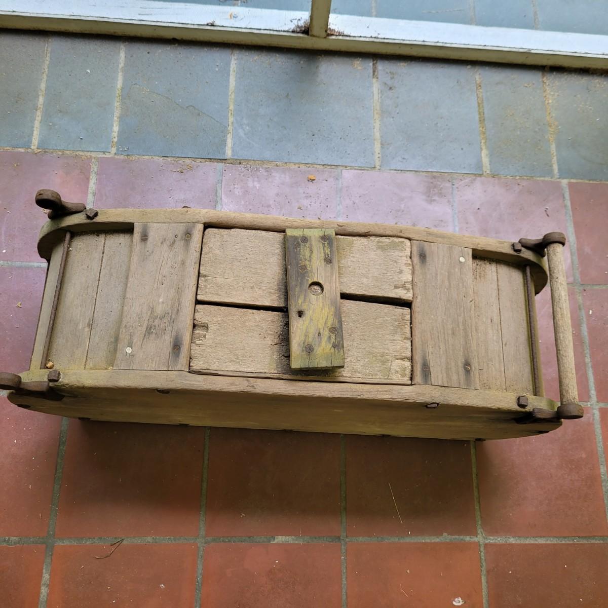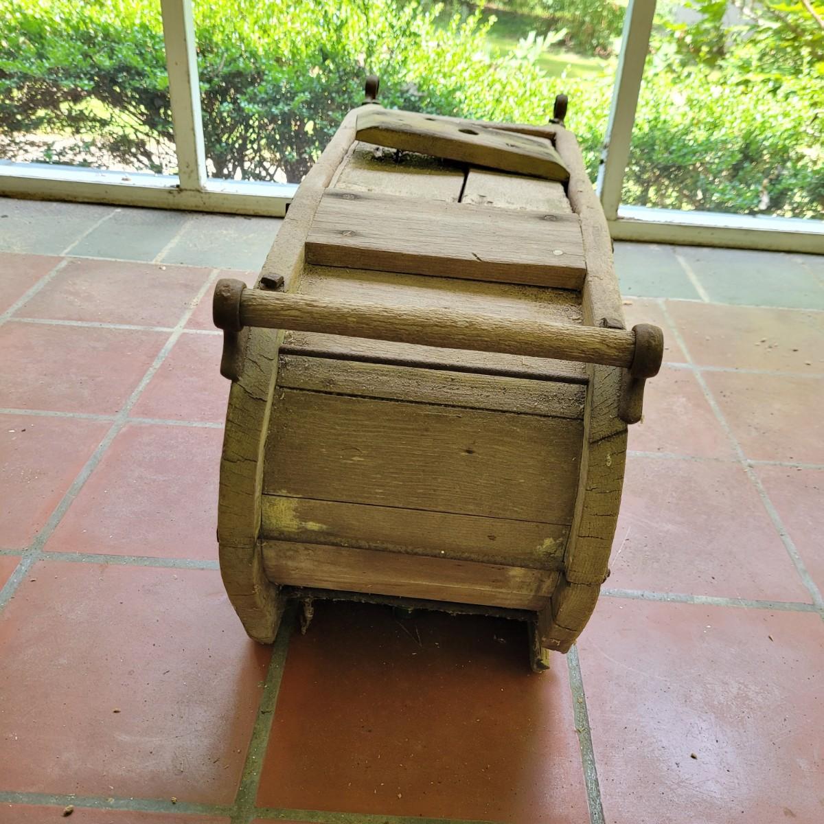 Antique wooden rocker churn without stand, in fair condition. Wood is weathered and rod is missing on one side. Lid is loose. Measures approximately 32"L x10.5"D x13.5"H. Local pick up only.