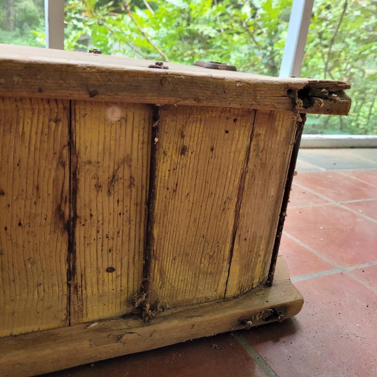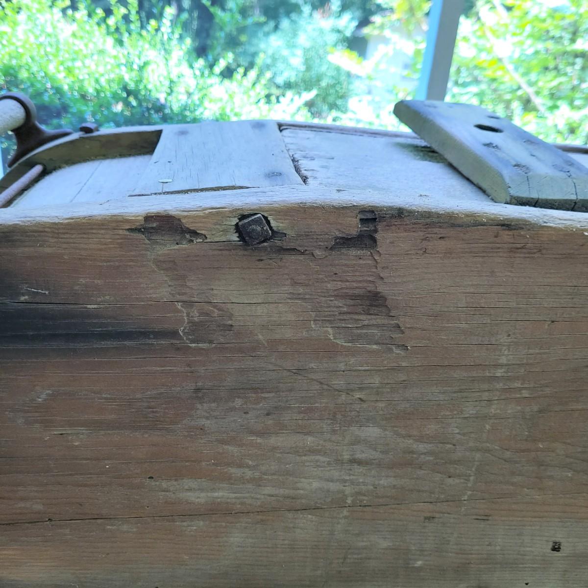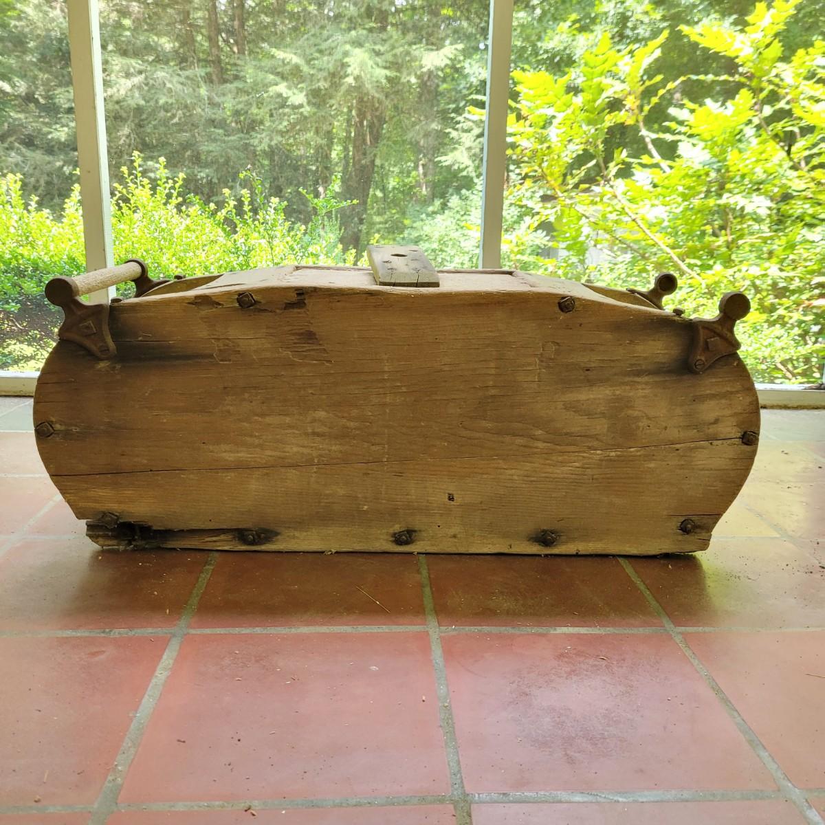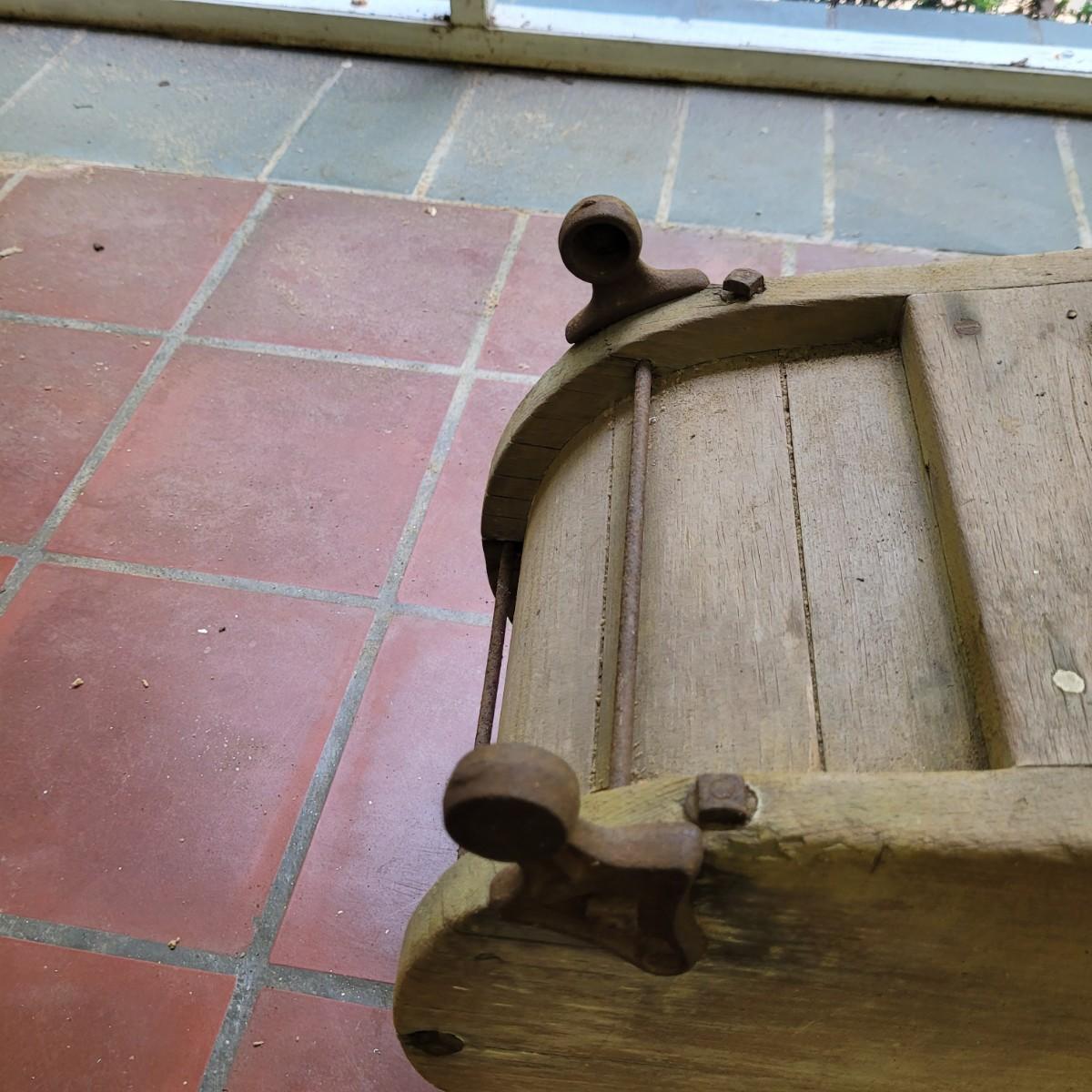 Antique wooden rocker churn without stand, in fair condition. Wood is weathered and rod is missing on one side. Lid is loose. Measures approximately 32"L x10.5"D x13.5"H. Local pick up only.
