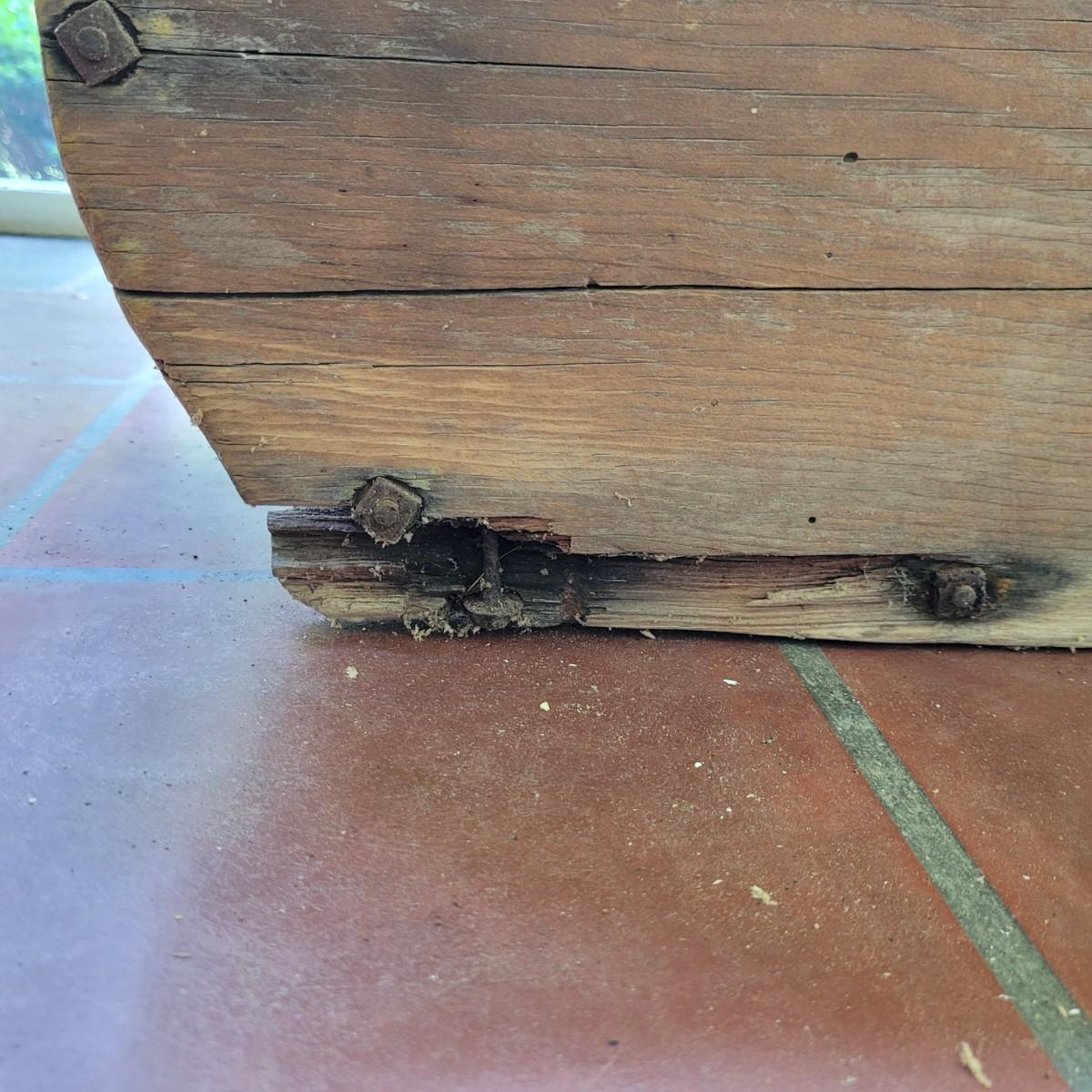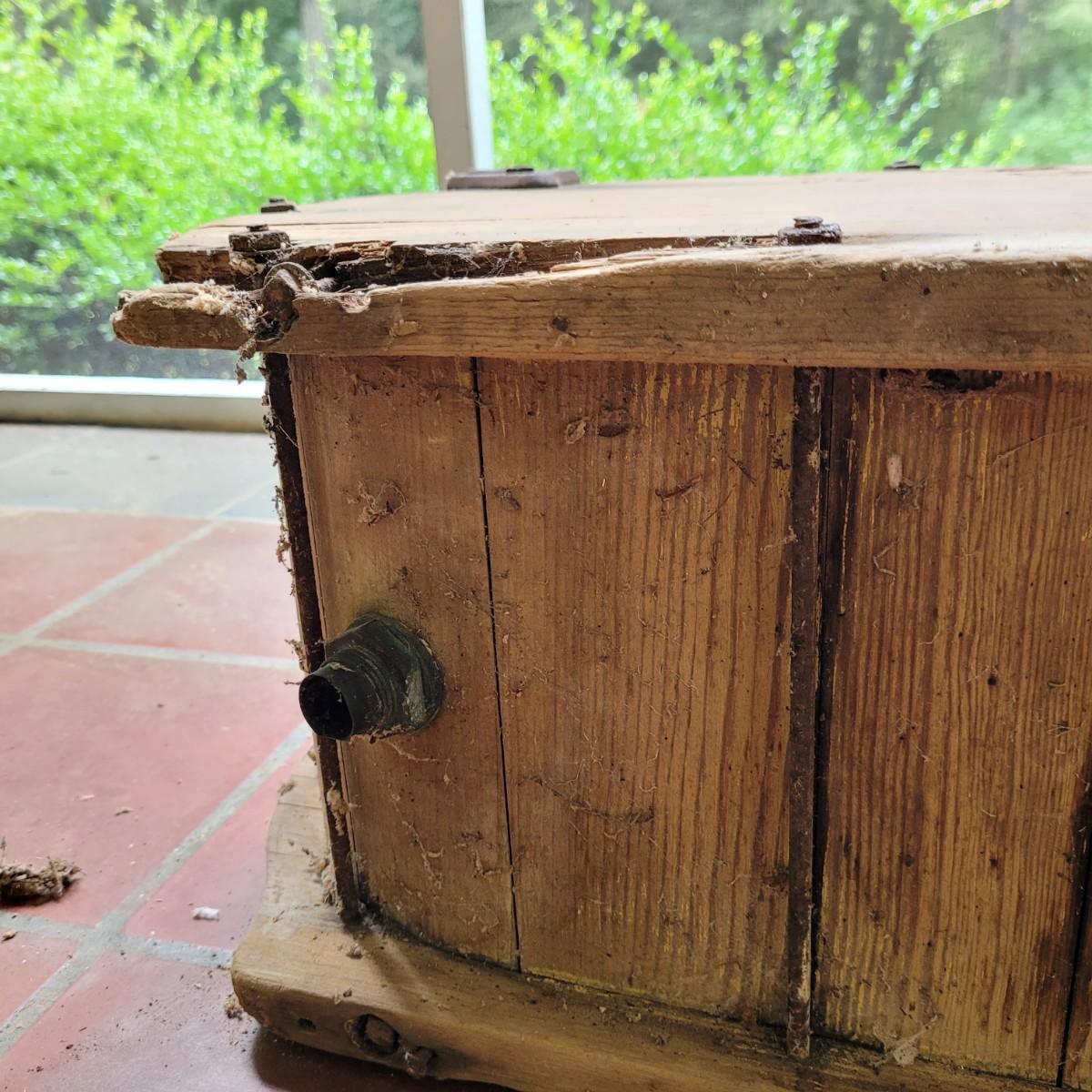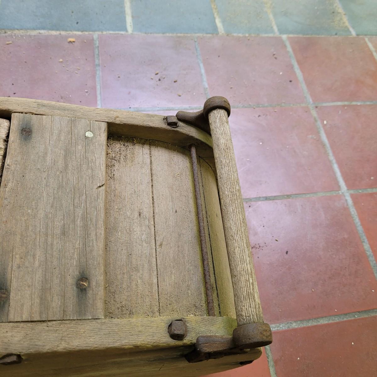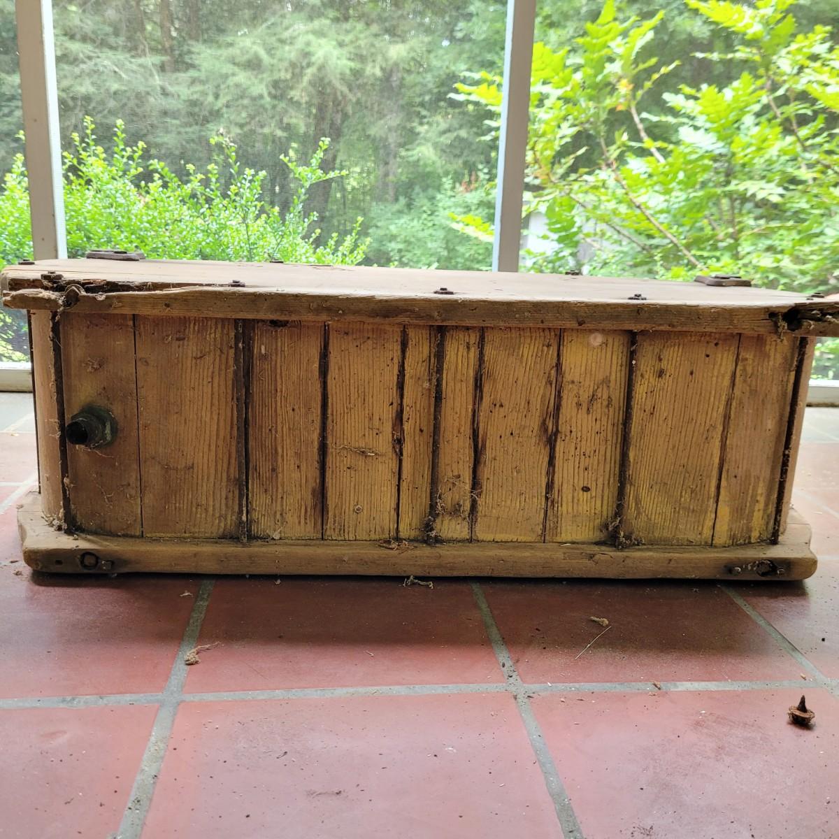 Antique wooden rocker churn without stand, in fair condition. Wood is weathered and rod is missing on one side. Lid is loose. Measures approximately 32"L x10.5"D x13.5"H. Local pick up only.