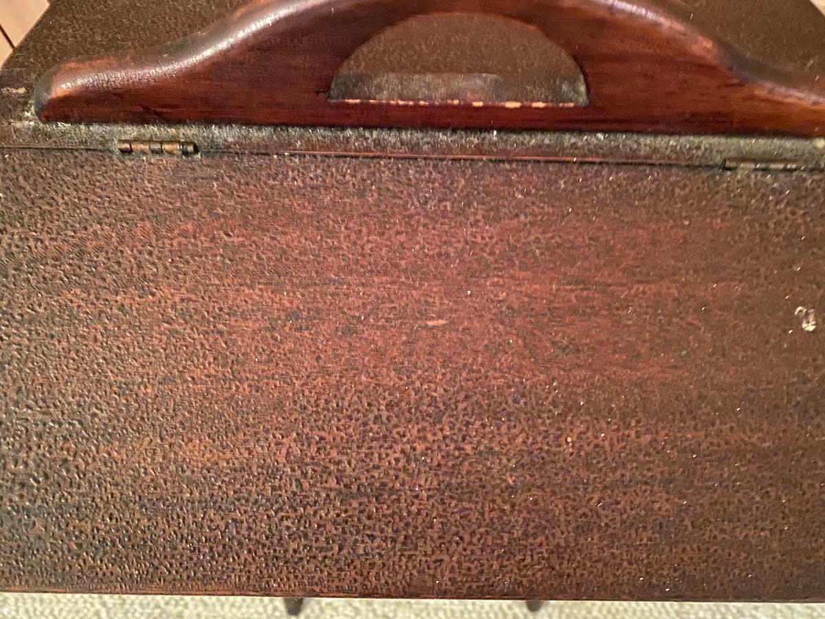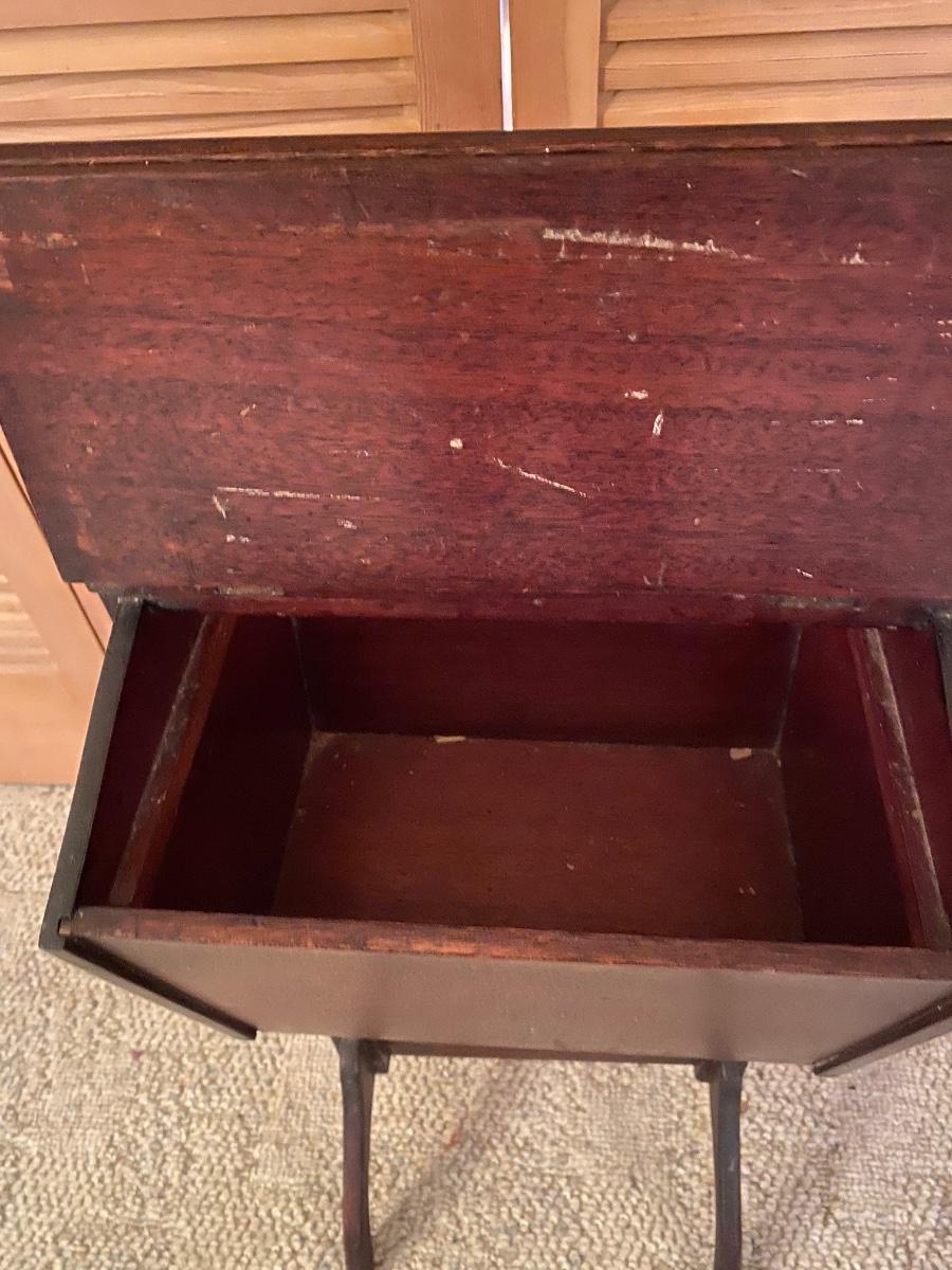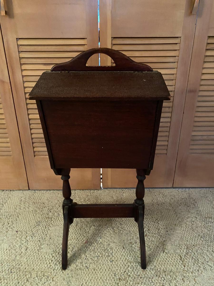 Antique wooden Sewing stand, 2 flip-up lids. In good antique condition, except the finish is alligatored