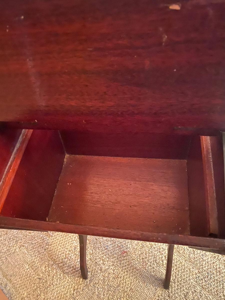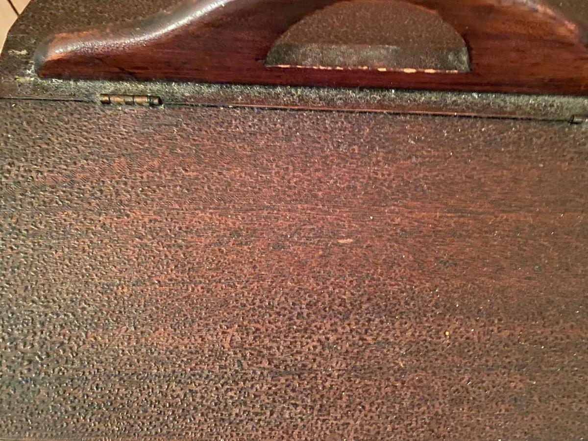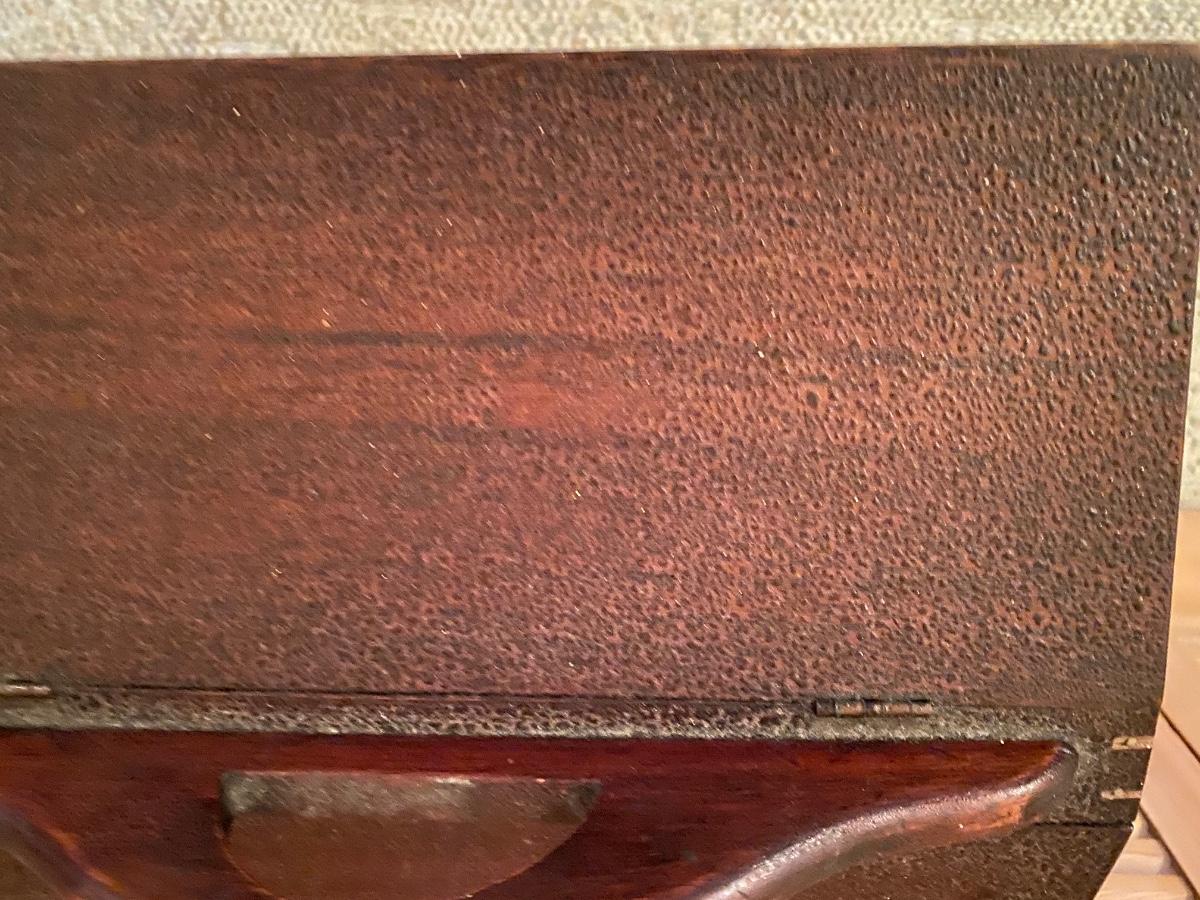 Antique wooden Sewing stand, 2 flip-up lids. In good antique condition, except the finish is alligatored