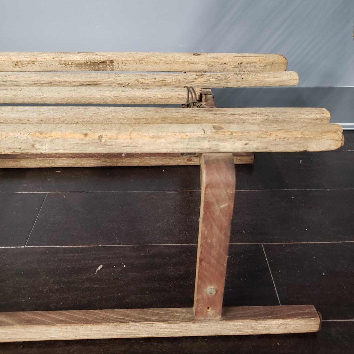 This lot has an antique wooden sled that measures approximately 40"x15"x10". There appears to be the name "turmbarg" on the top of the sled. The metal support is dislocated and the top middle rung is broken off, but other than that its a solid piece considering its visual age.