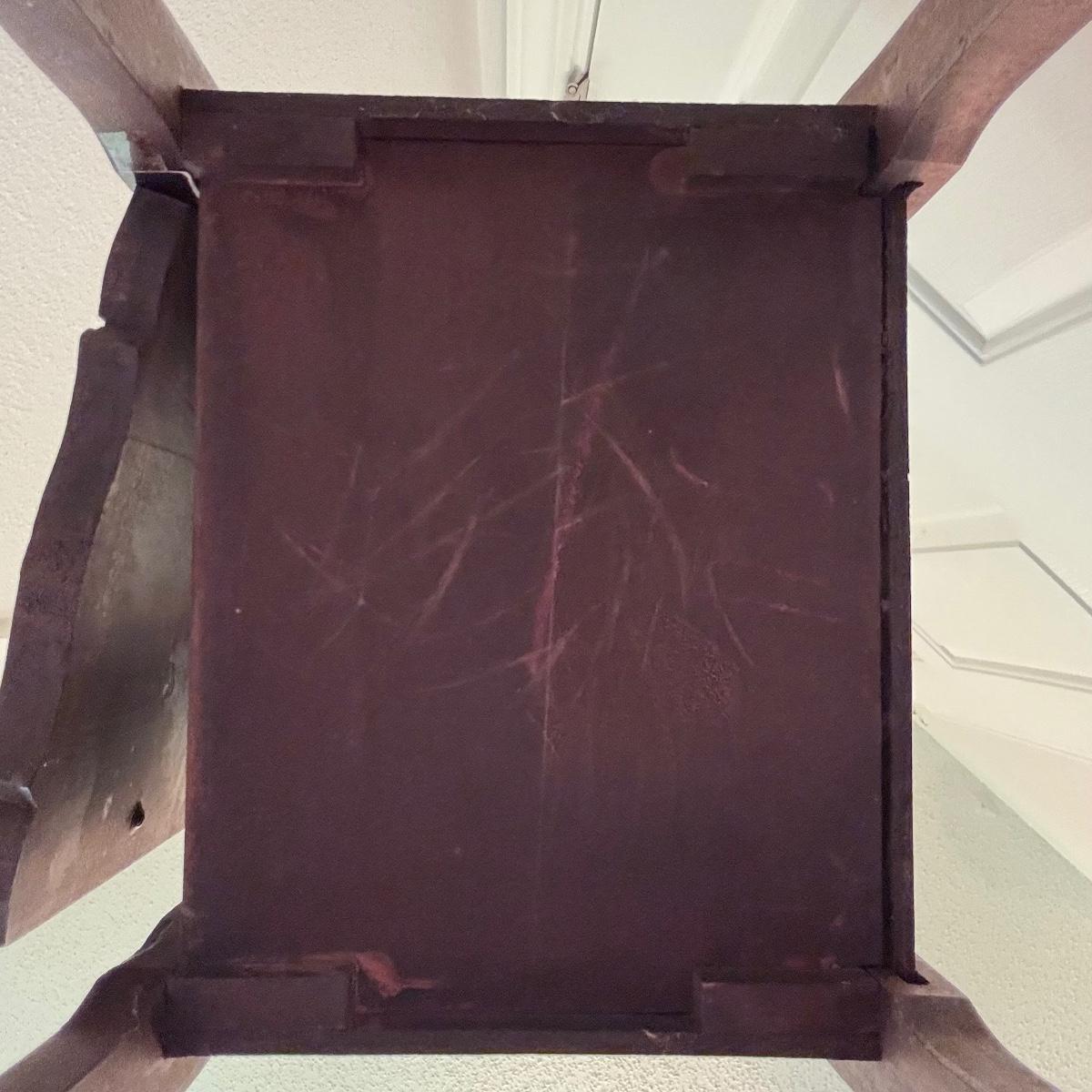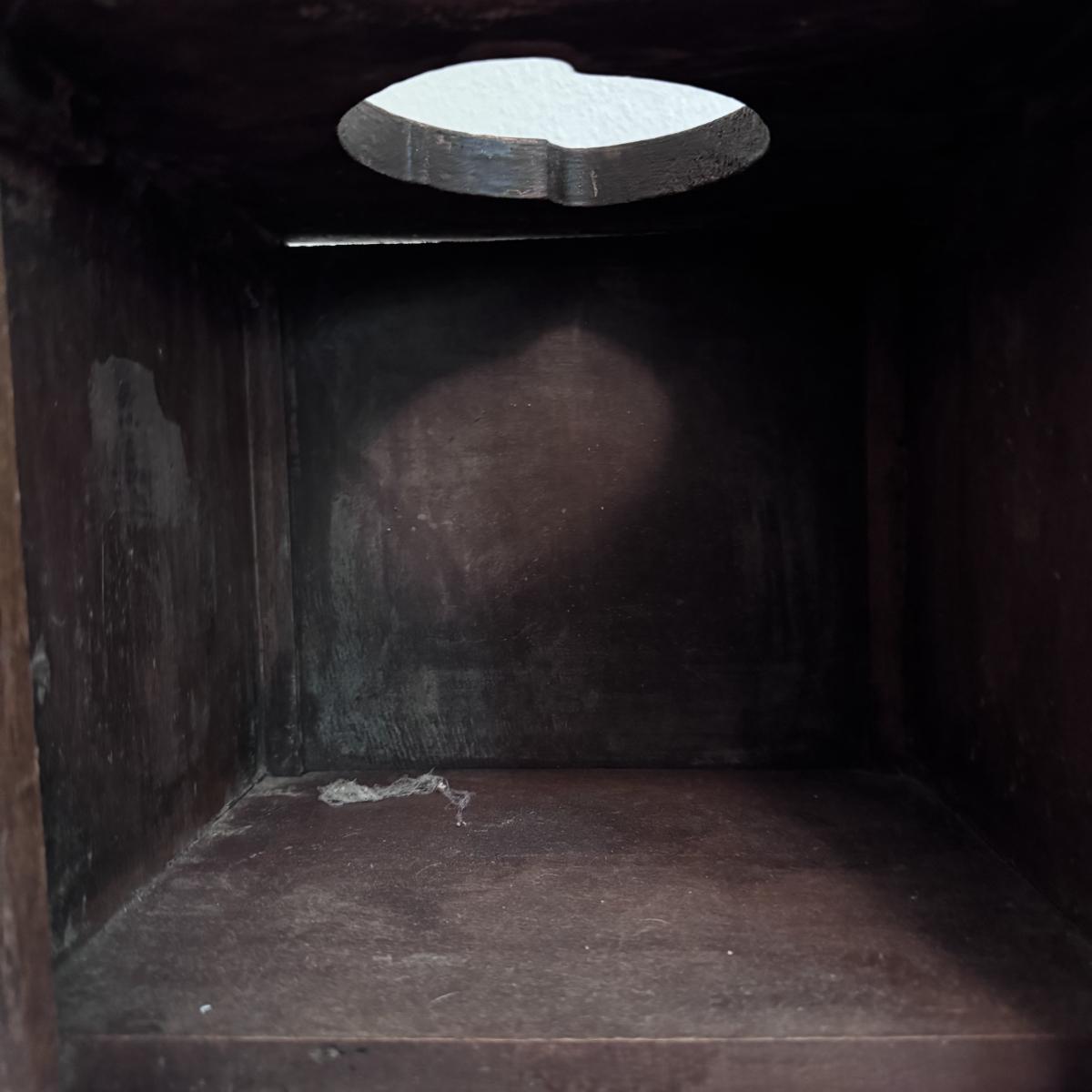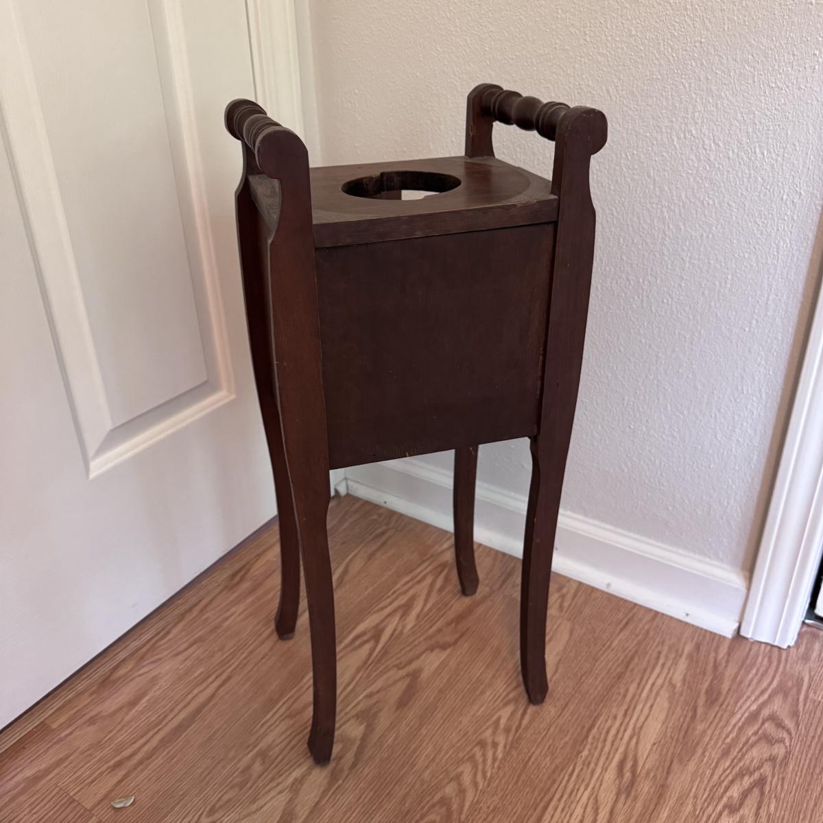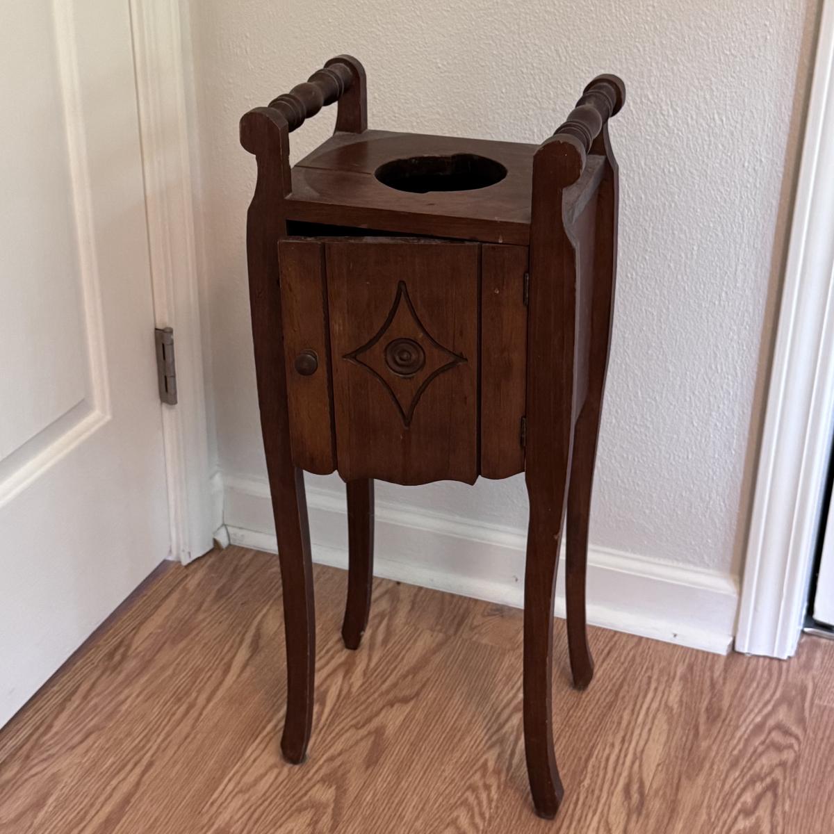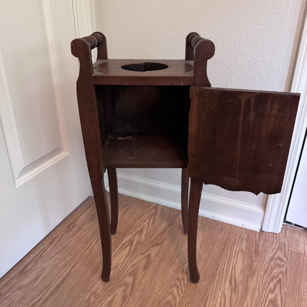 This lot includes, what appears to be, one antique wooden smoking cabinet. The cabinet is solid wood and has a hole on the top meant to hold an ashtray. The door on the cabinet does not stay fully closed. It looks like someone added a piece of paper and tape to help close the piece - see pictures inclided. The table measures 11” x 9” x 25”H . Local pickup only.