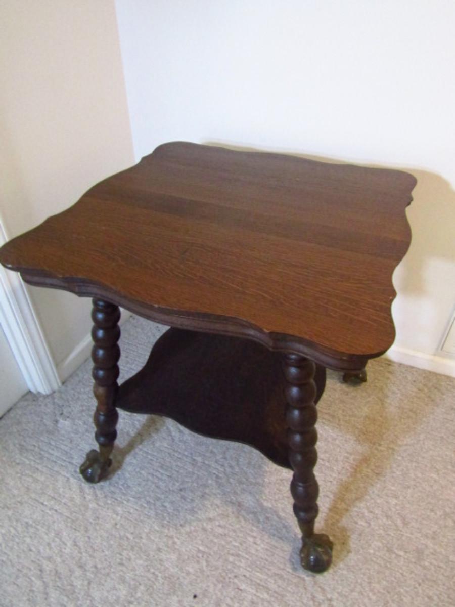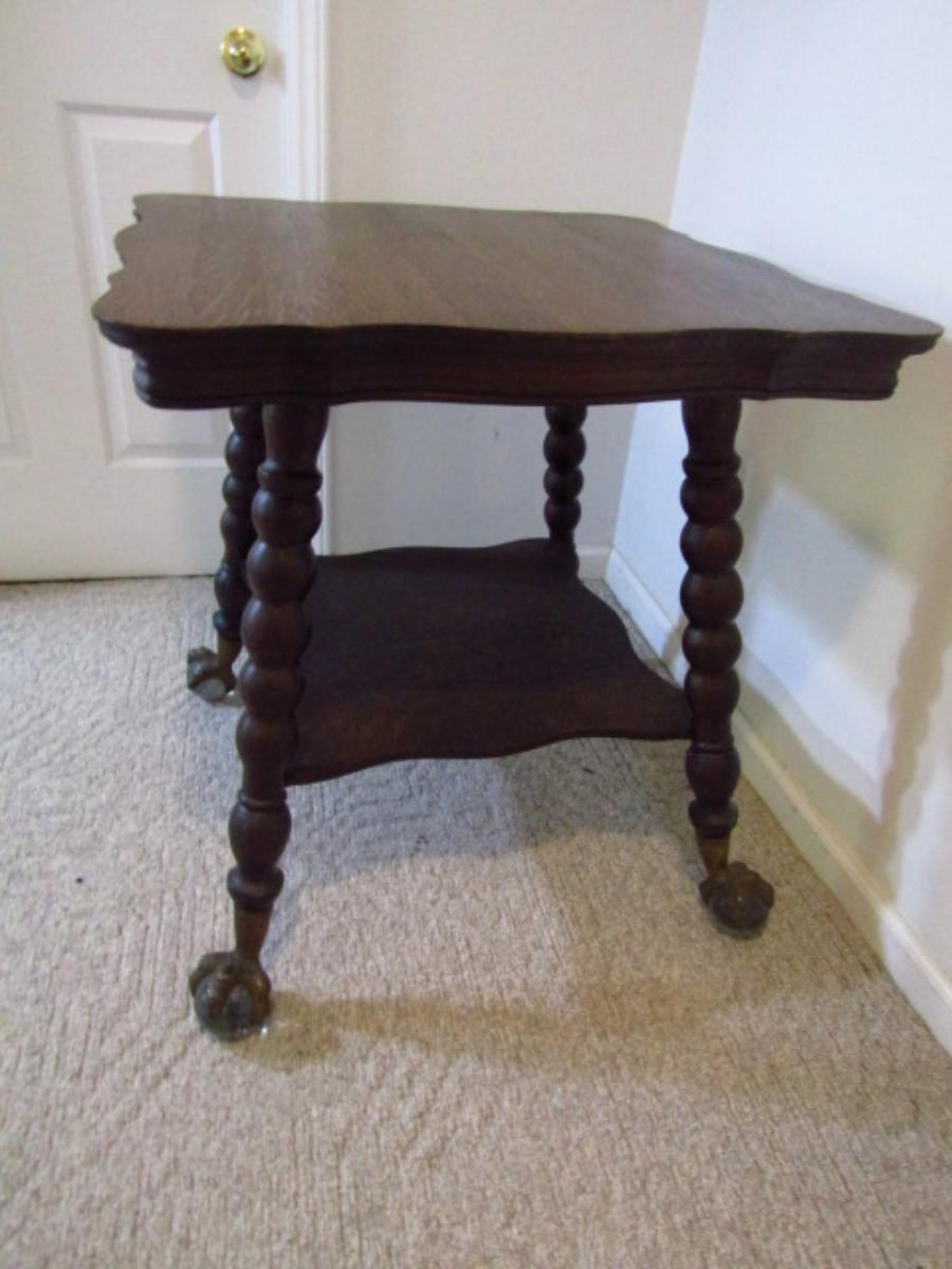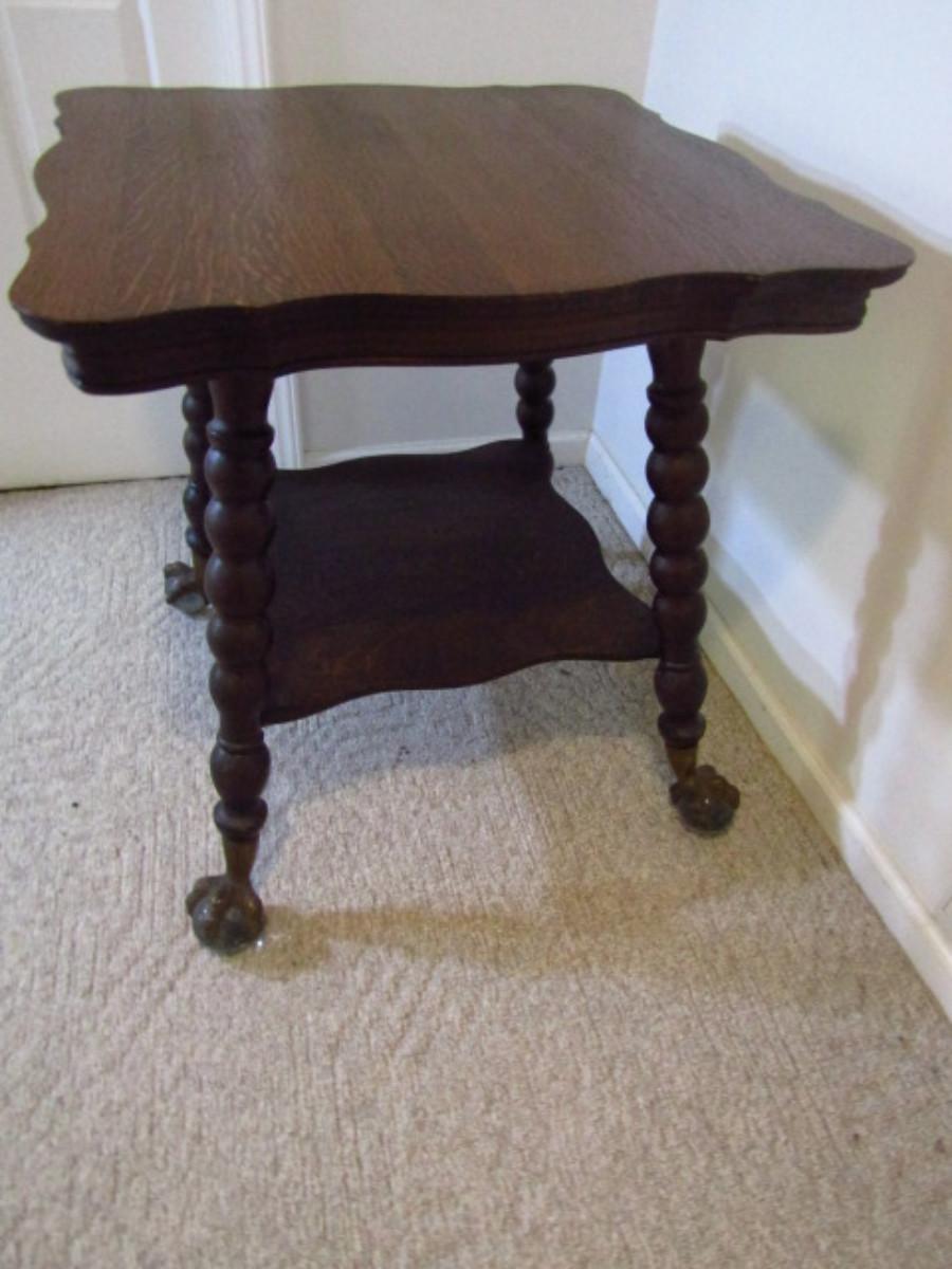 Antique Wooden Table with Stretcher Shelf and Glass Ball and Metal Claw Feet. Measures approx 27 1/2" square and 29 3/4" tall. Please see all pictures- there is a small spot of damage to one edge. Maker's mark not found.