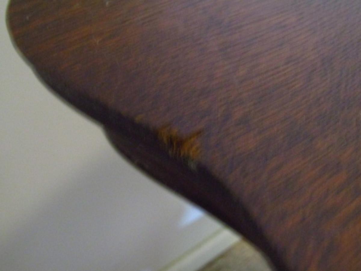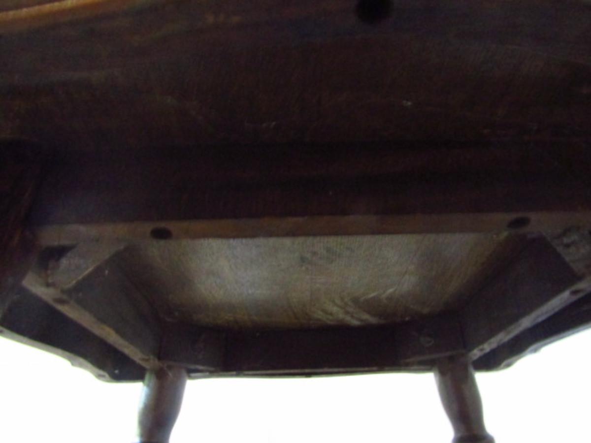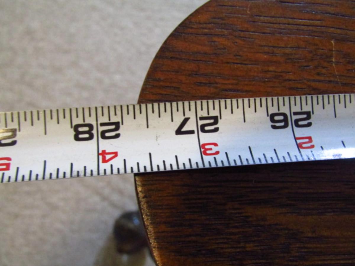 Antique Wooden Table with Stretcher Shelf and Glass Ball and Metal Claw Feet. Measures approx 27 1/2" square and 29 3/4" tall. Please see all pictures- there is a small spot of damage to one edge. Maker's mark not found.