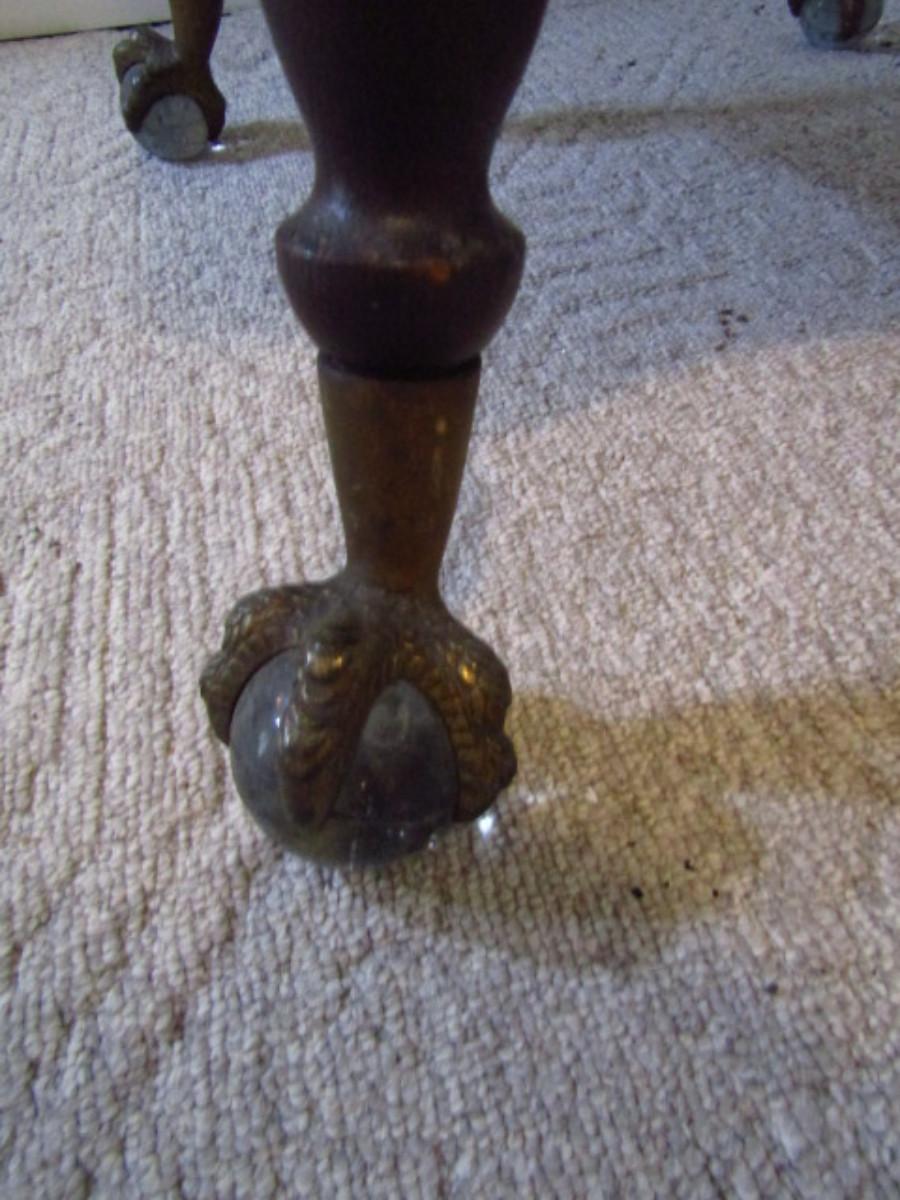 Antique Wooden Table with Stretcher Shelf and Glass Ball and Metal Claw Feet