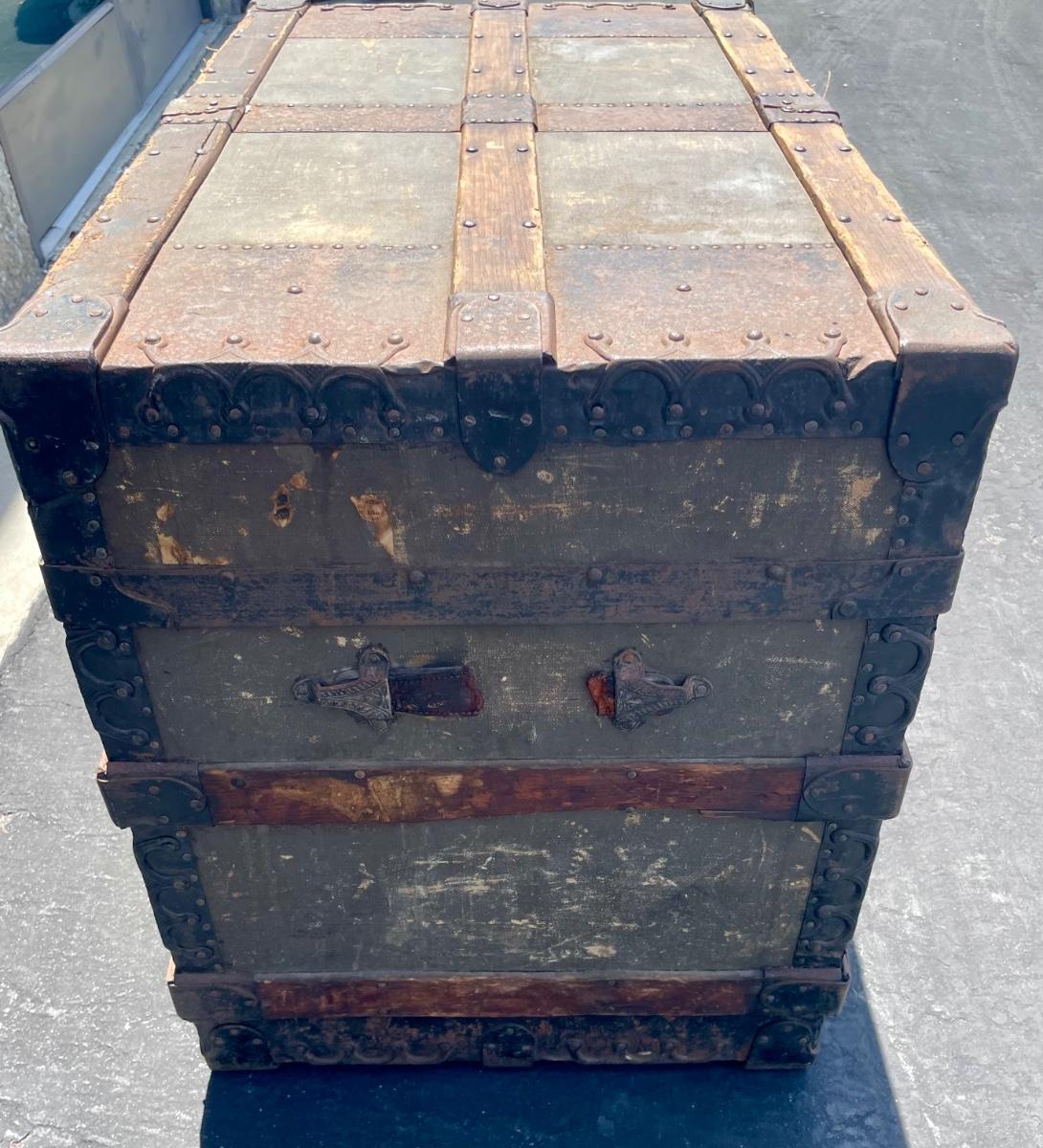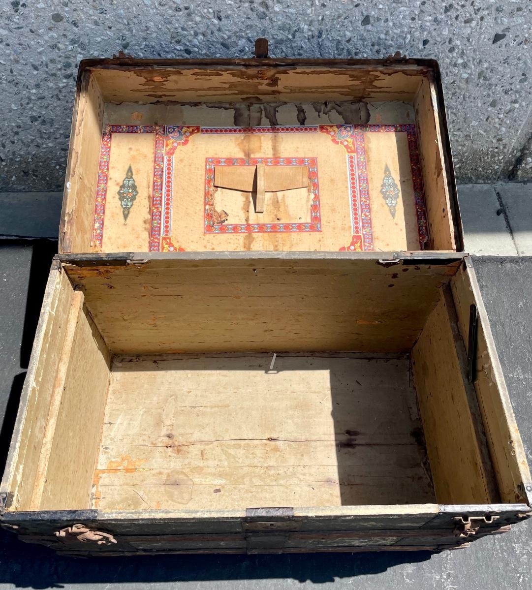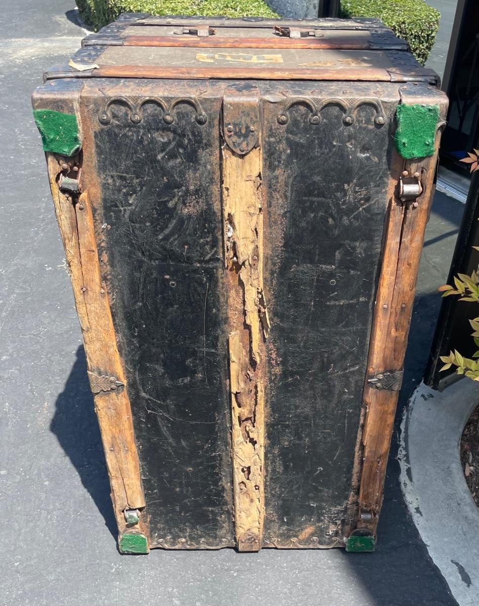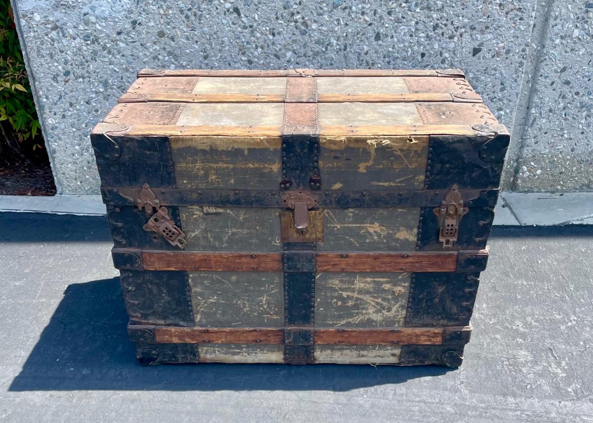 Antique wood trunk. Hinged lid, Measures approx 25" tall x 34" long x 20" deep. Hasp on the left side is loose. Has fixed metal rollers on the bottom to allow trunk to be easily pushed sideways. Minor dry rot on one board on the bottom, see photos.