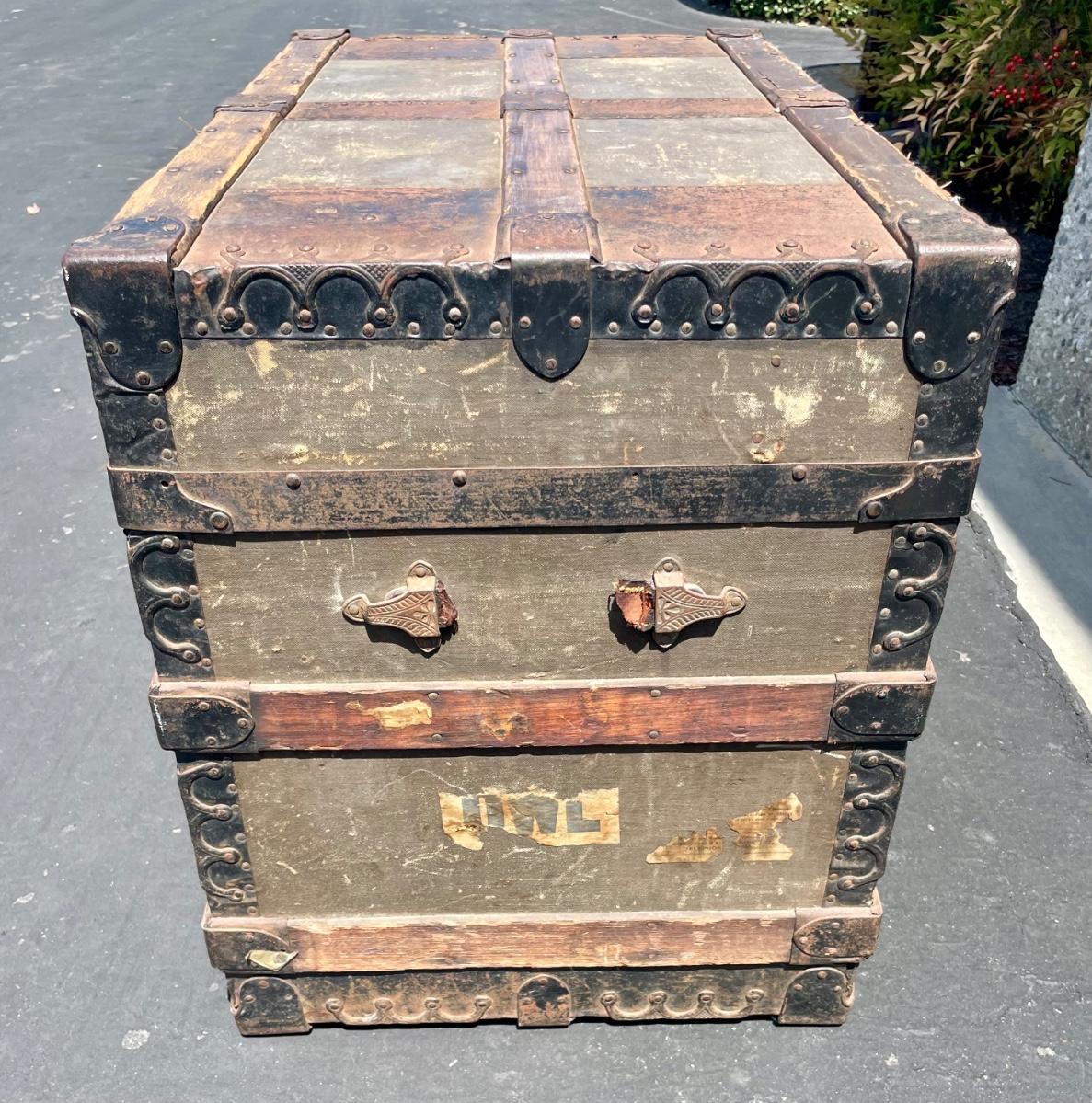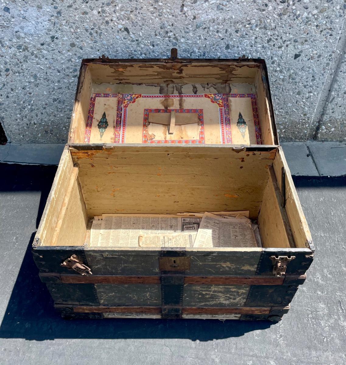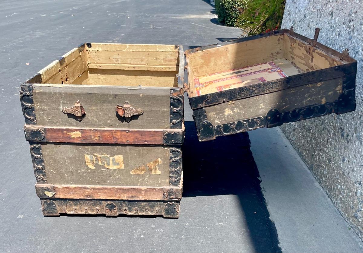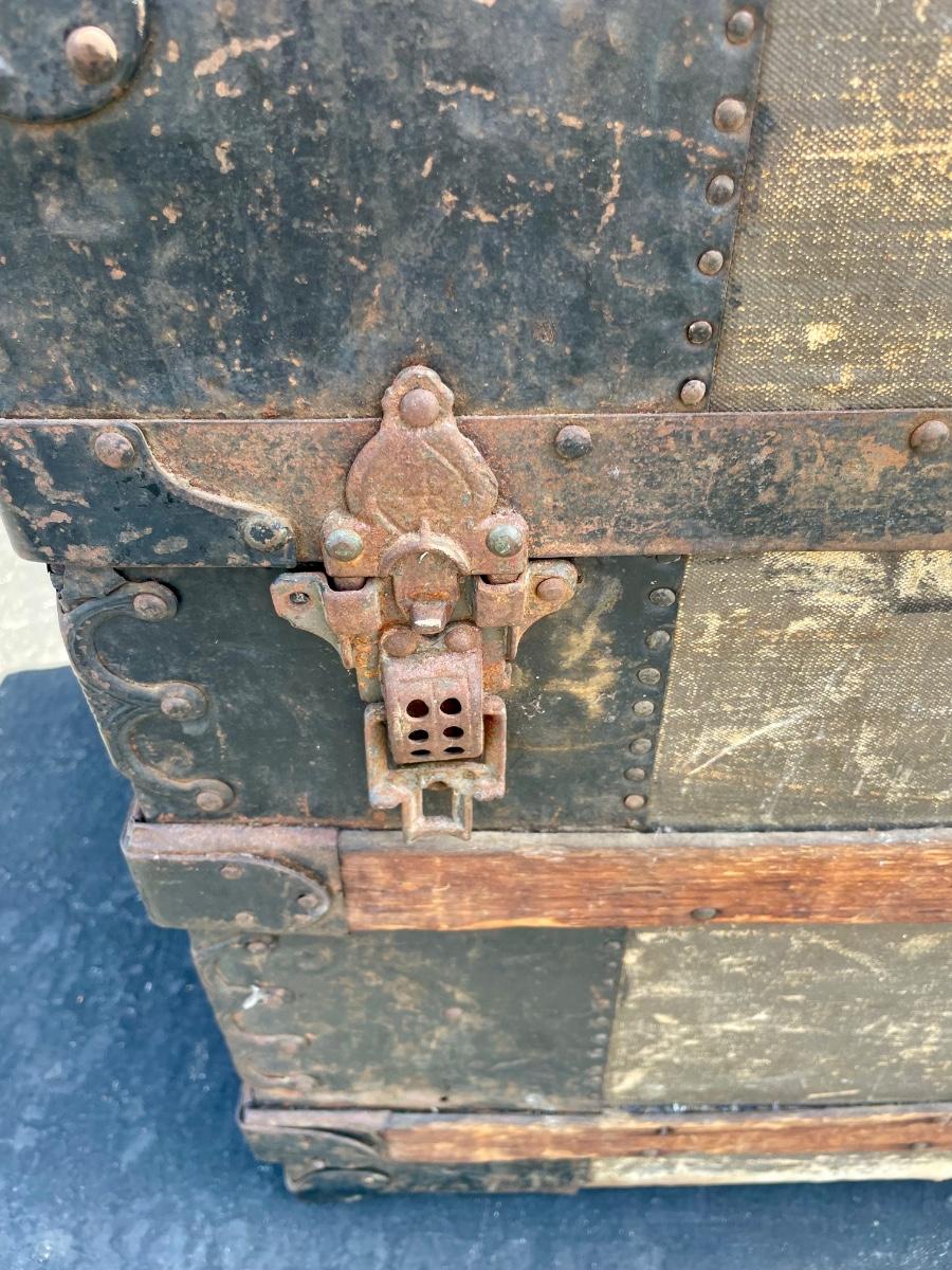 Antique wood trunk. Hinged lid, Measures approx 25" tall x 34" long x 20" deep. Hasp on the left side is loose. Has fixed metal rollers on the bottom to allow trunk to be easily pushed sideways. Minor dry rot on one board on the bottom, see photos.