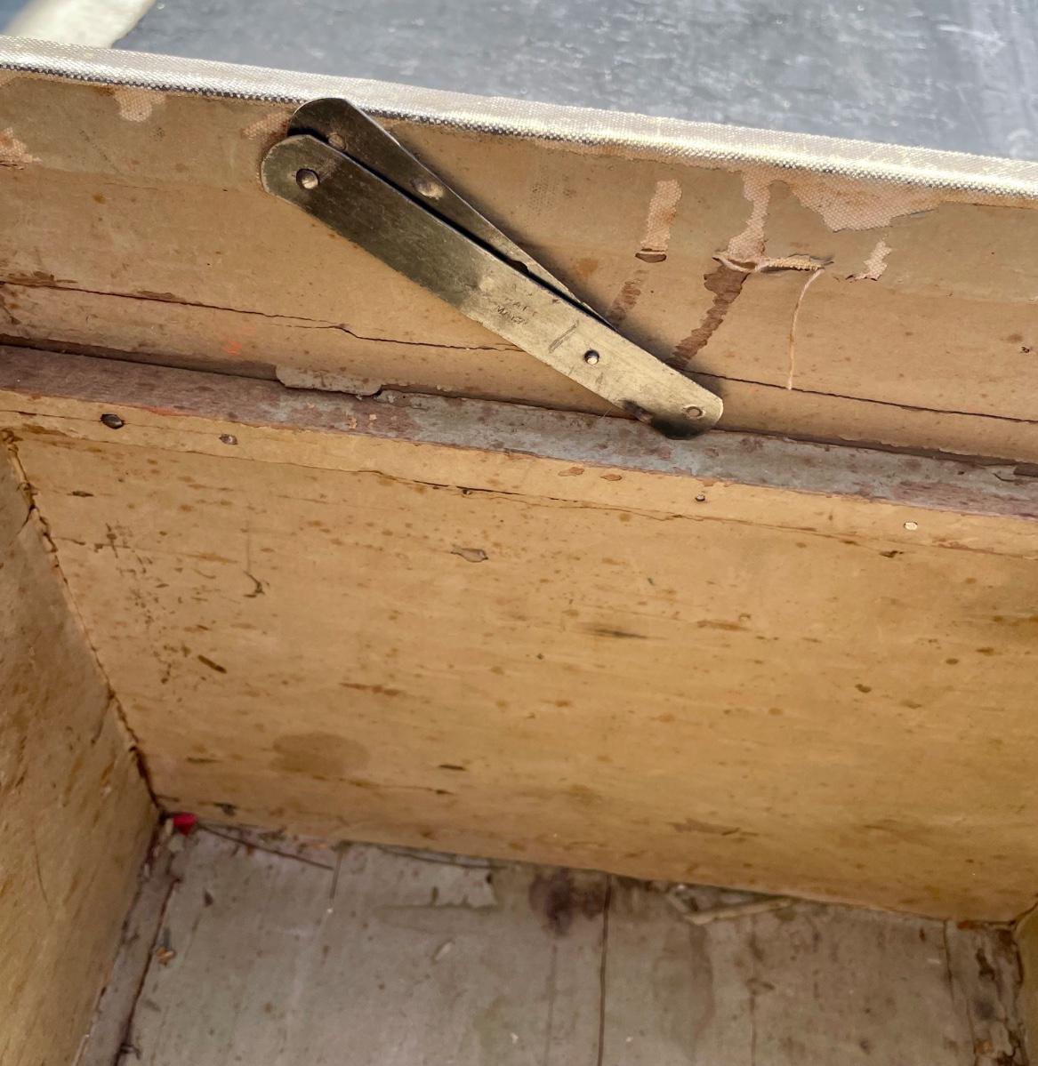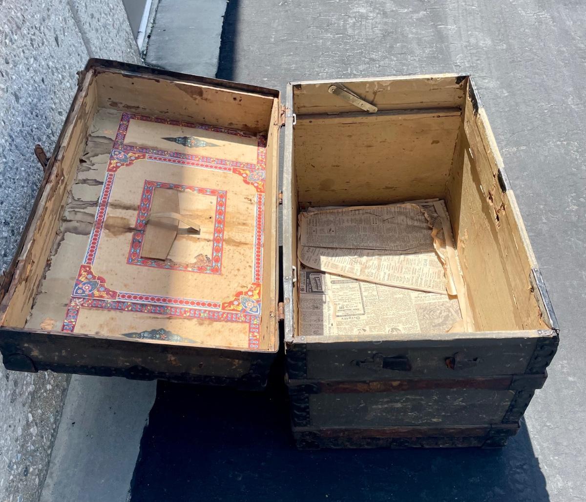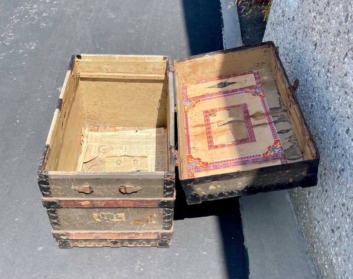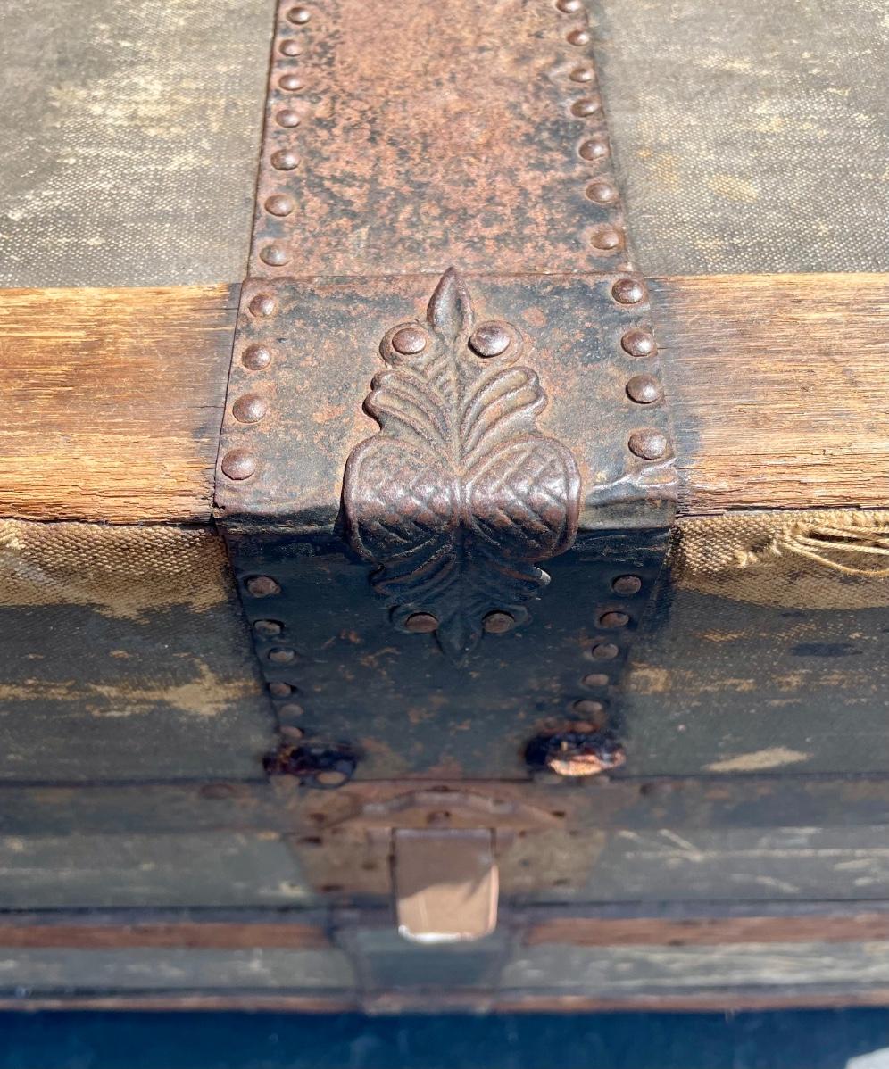 Antique wood trunk. Hinged lid, Measures approx 25" tall x 34" long x 20" deep. Hasp on the left side is loose. Has fixed metal rollers on the bottom to allow trunk to be easily pushed sideways. Minor dry rot on one board on the bottom, see photos.