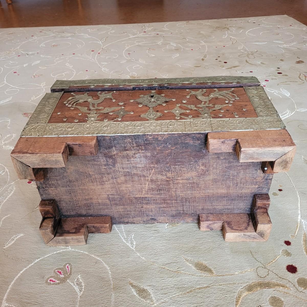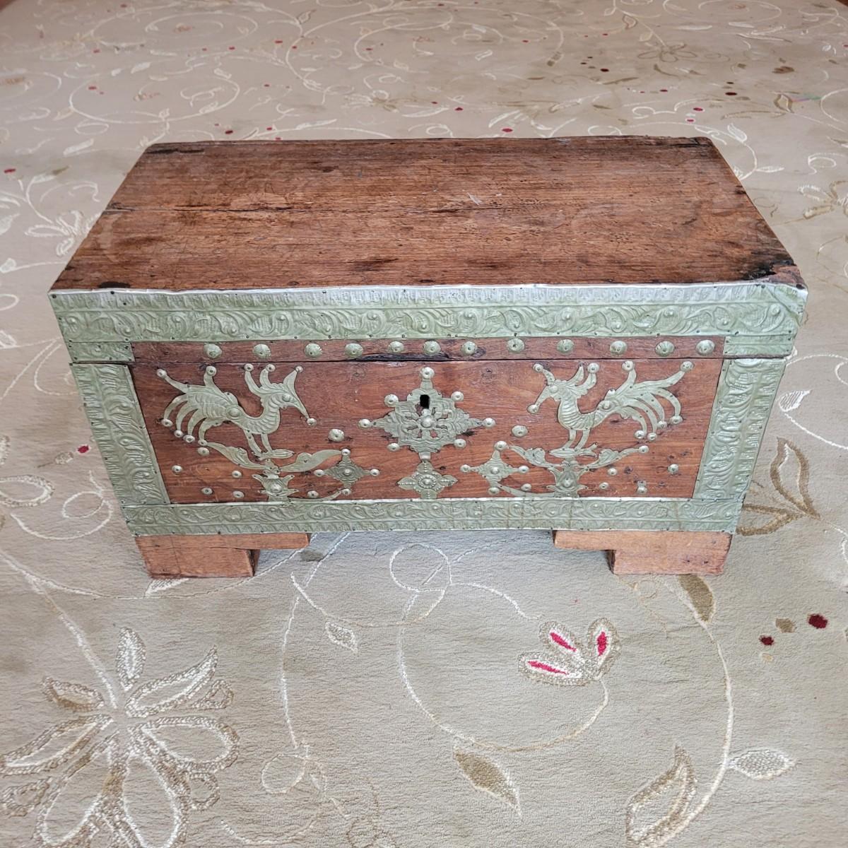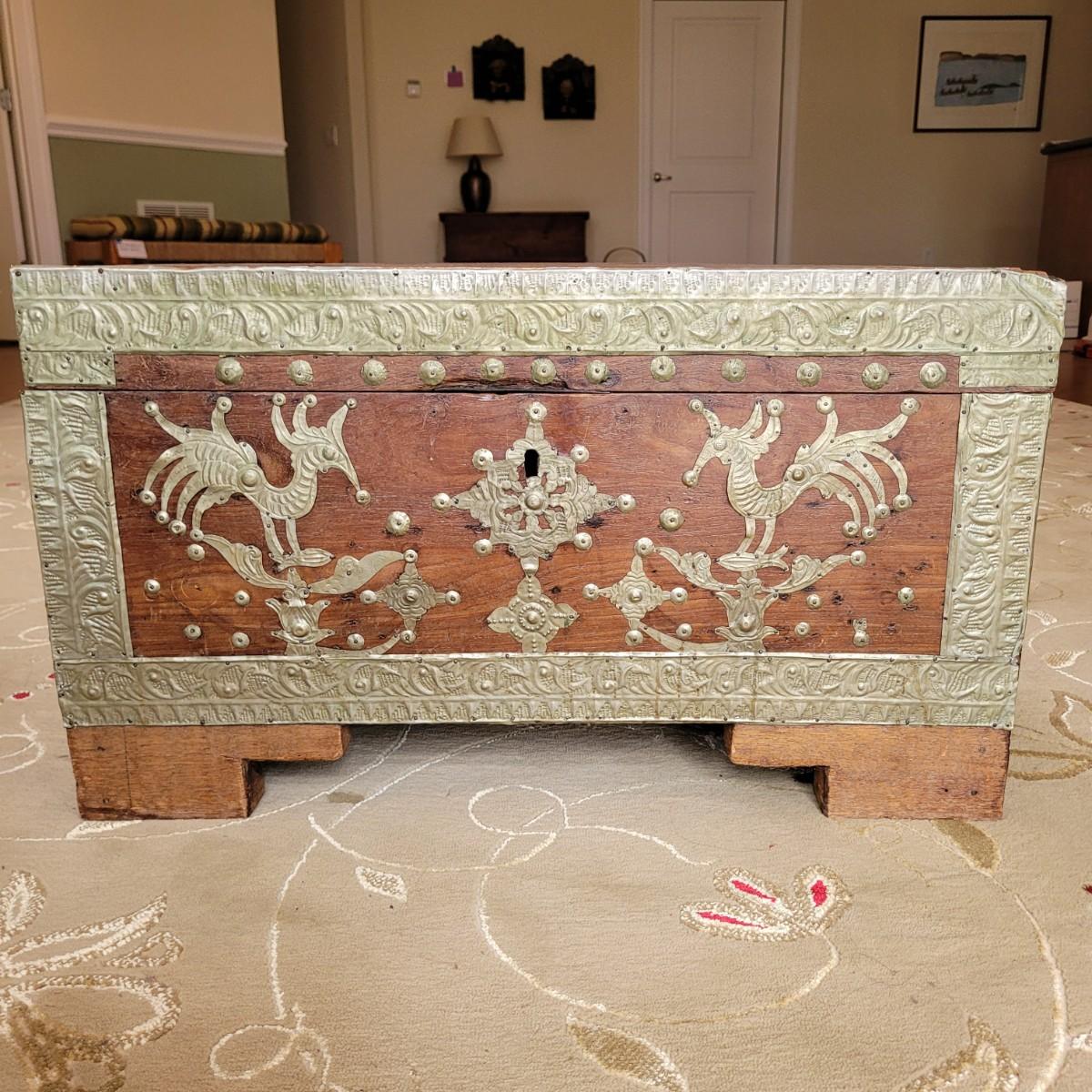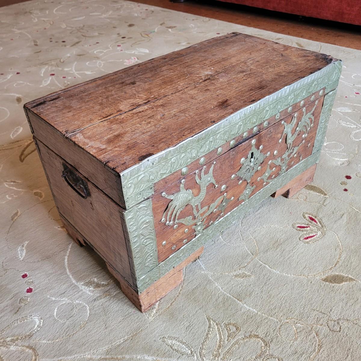 Metal faced wooden trunk. Metal embellishments appear to be brass or copper and features floral and animal motifs. Could have served as a storage chest, a travel trunk, or a dowry chest. likely dating back many decades. Shows some signs of wear. Item measures 25" x 13.5" x 14.5"H.